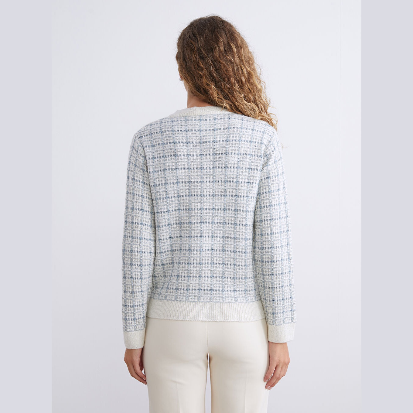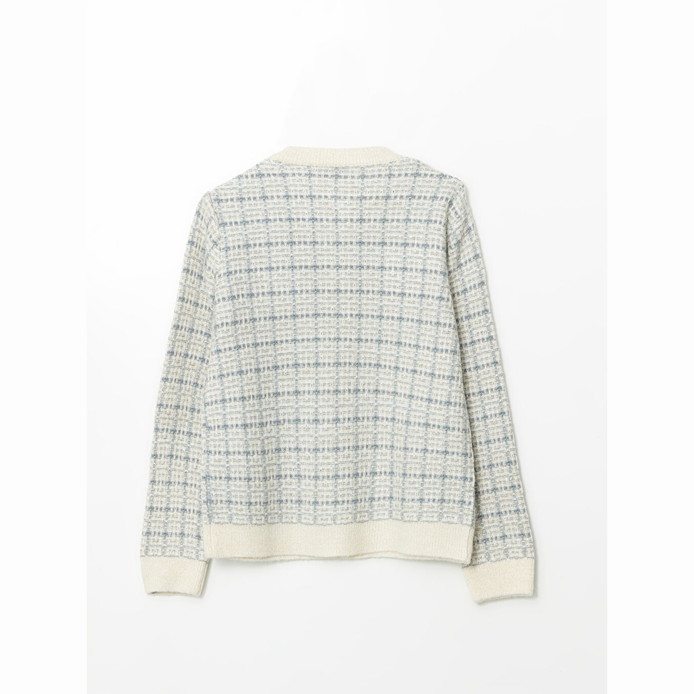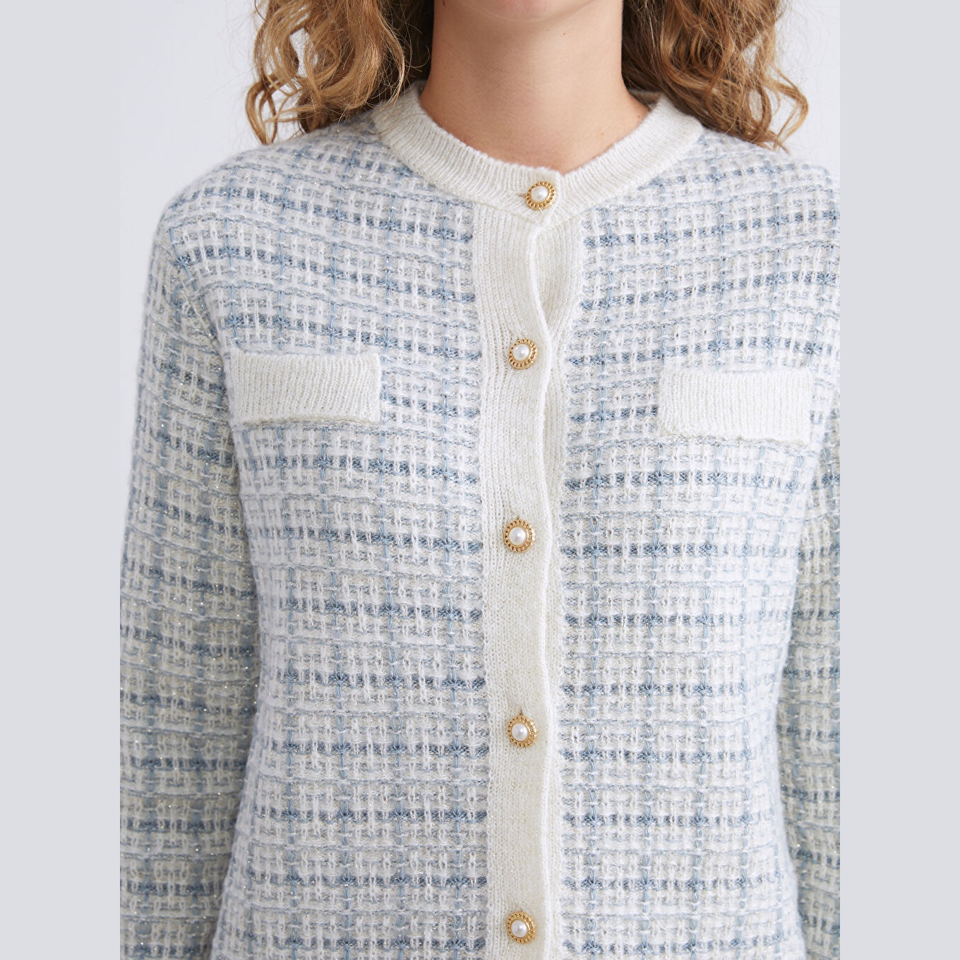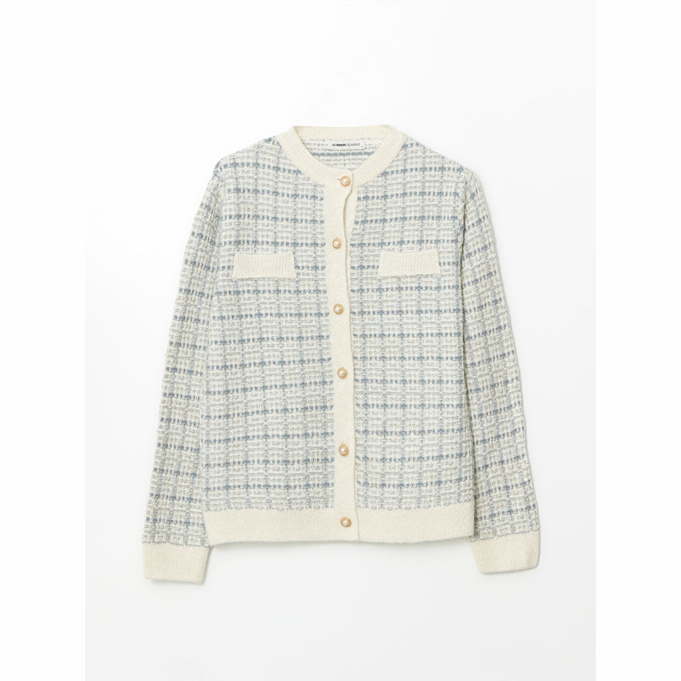 كارديغان نسائي بياقة دائرية بنقشة من LCW Classic – أزرق (قصة قياسية، خامة تريكو متوسطة السماكة، تصميم مزخرف بخيوط لامعة، أزرار أمامية، ضمن مجموعة المقاسات الكبيرة)