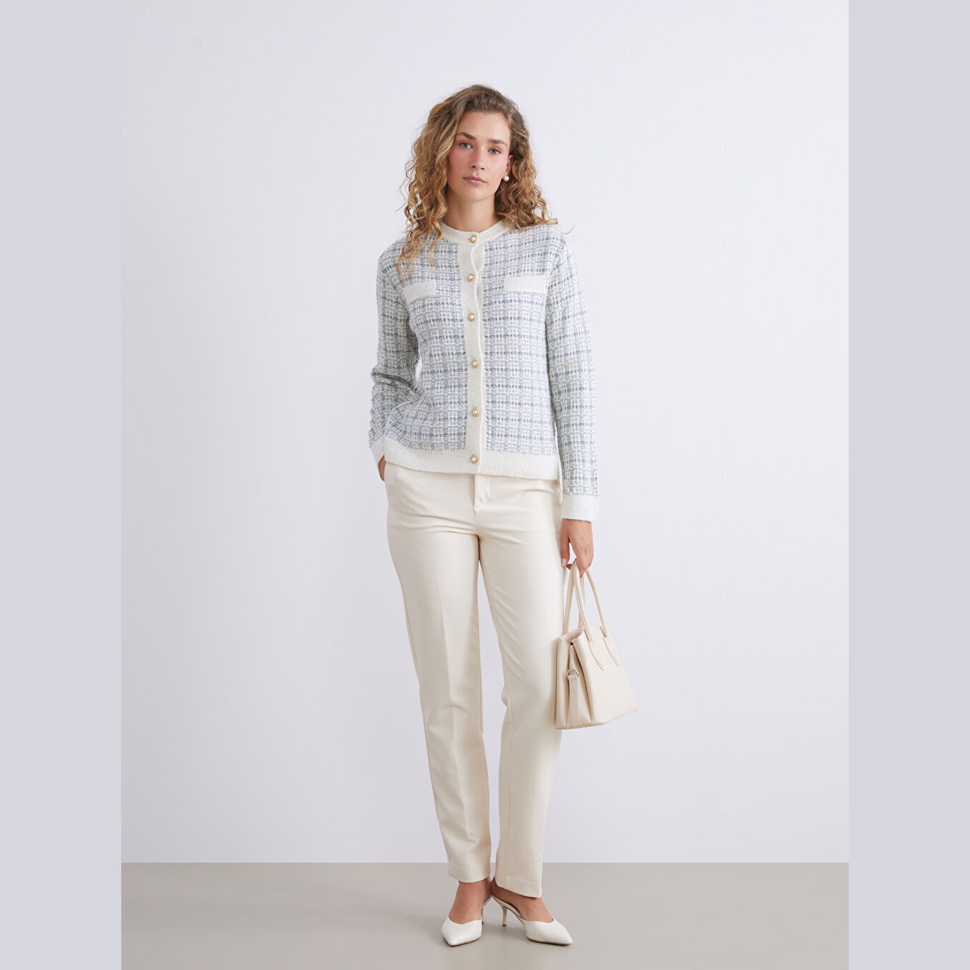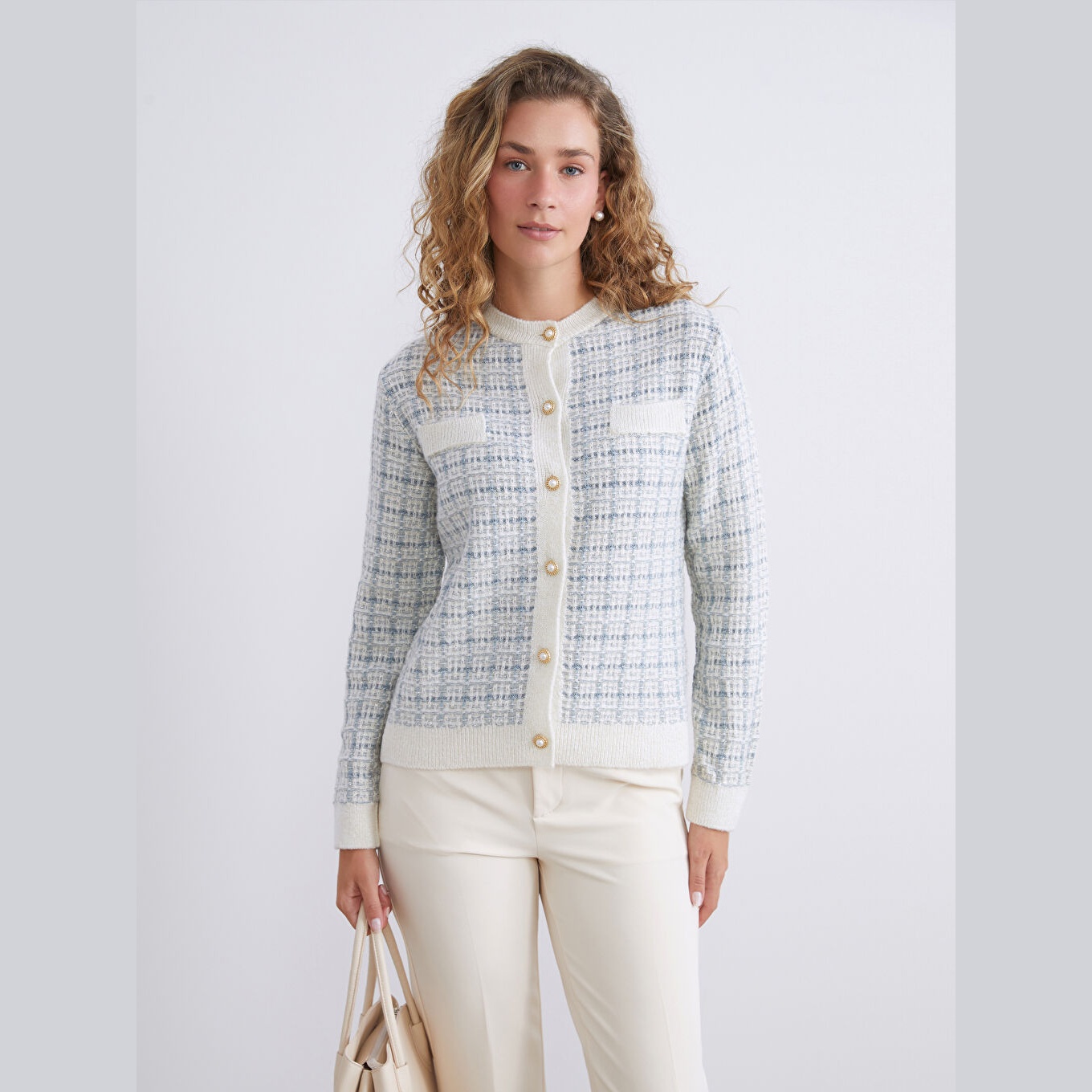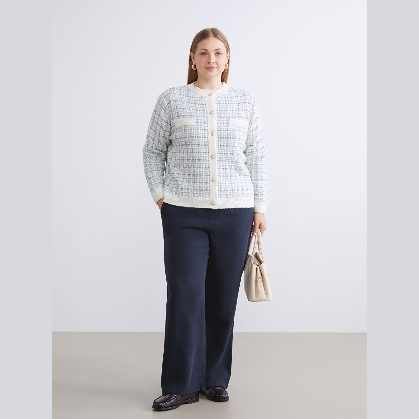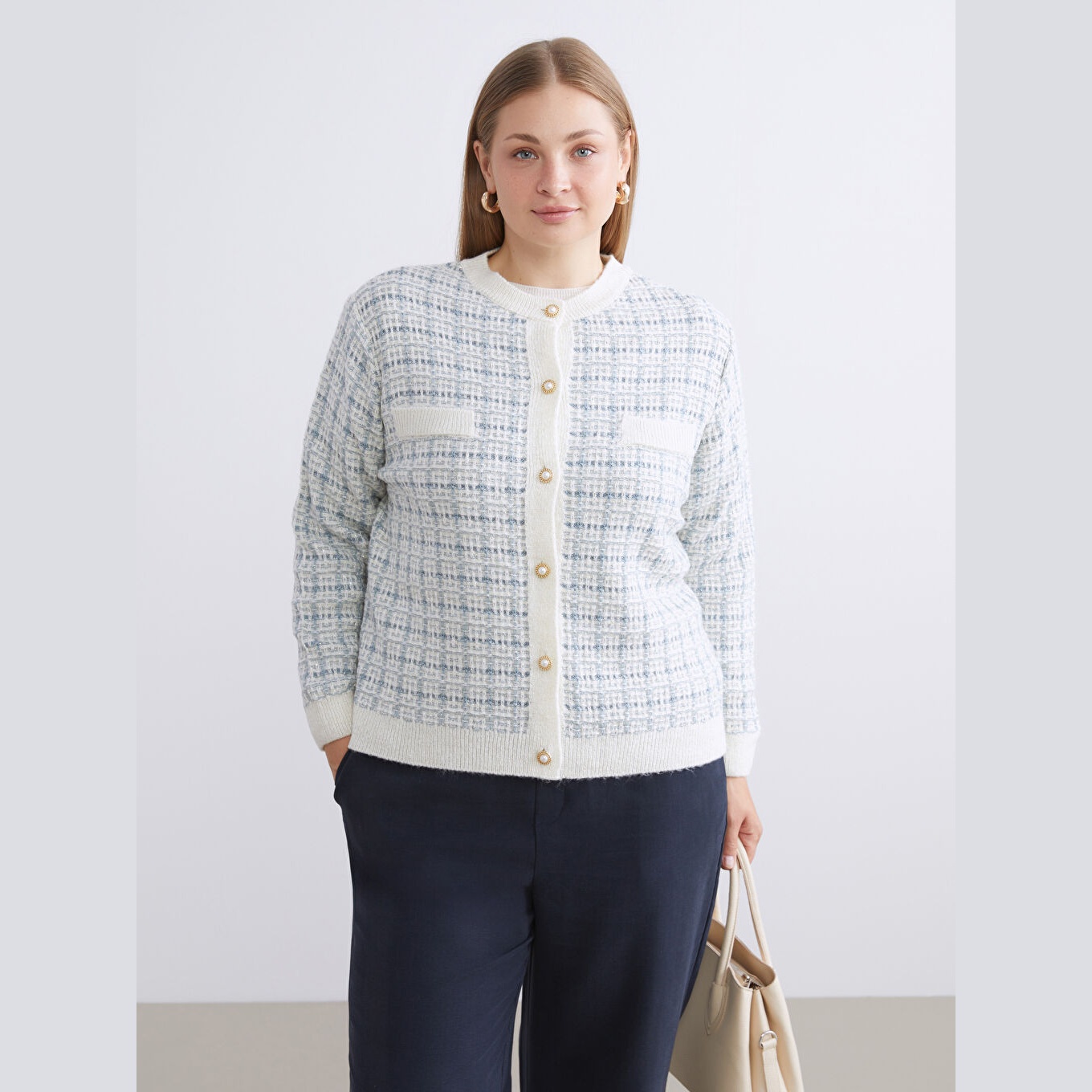 كارديغان أنيق من مجموعة LCW Classic بلون أزرق هادئ، مصمم بياقة دائرية (Bisiklet Yaka) تمنحك مظهرًا ناعمًا وكلاسيكيًا، أكمام طويلة، قصة Standart & Regular توفر راحة وأناقة متوازنة، تصميم Desenli مزخرف بنقشة ناعمة مدمجة بخيوط لامعة تضيف لمسة فاخرة، خامة Triko متوسطة السماكة بتركيبة من %77 أكريليك، %18 بوليستر، %5 خيط معدني، مزود بأزرار أمامية للإغلاق، بطول يُقاس من الكتف، مثالي للتنسيق مع بناطيل قماش أو تنانير لإطلالة خريفية أو مكتبية أنيقة ومحتشمة، ضمن مجموعة Büyük Beden التي تراعي الراحة والتناسق في المقاسات الكبيرة.