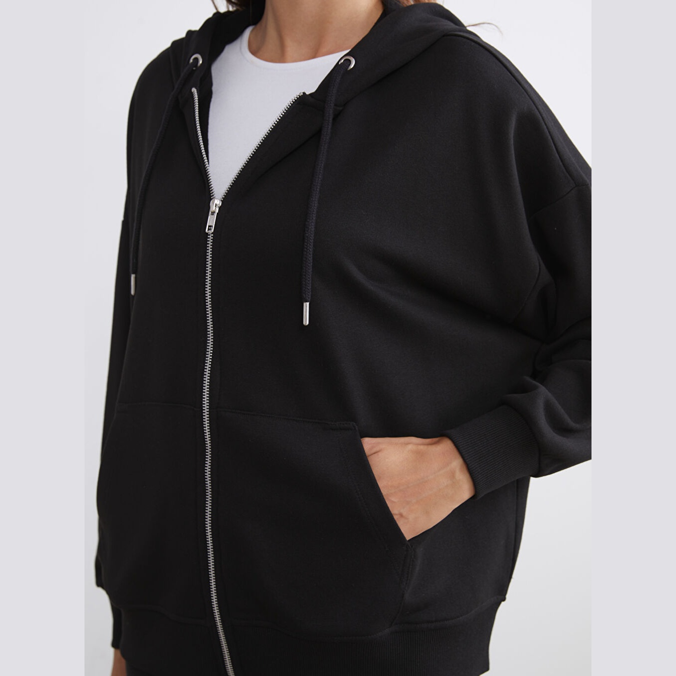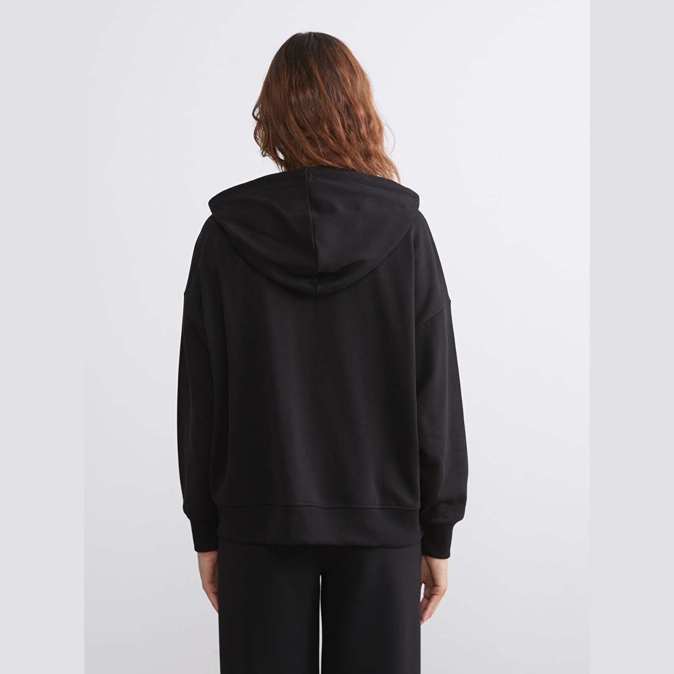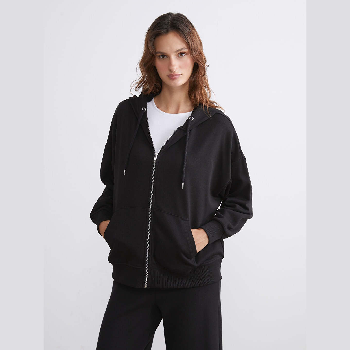 سويت شيرت نسائي بغطاء رأس وقصة واسعة من LCW Vision – أسود (قصة Oversize، خامة 3 İplik متوسطة السماكة، تصميم سادة، فتحة سحاب أمامية، ضمن مجموعة العودة إلى الجامعة)