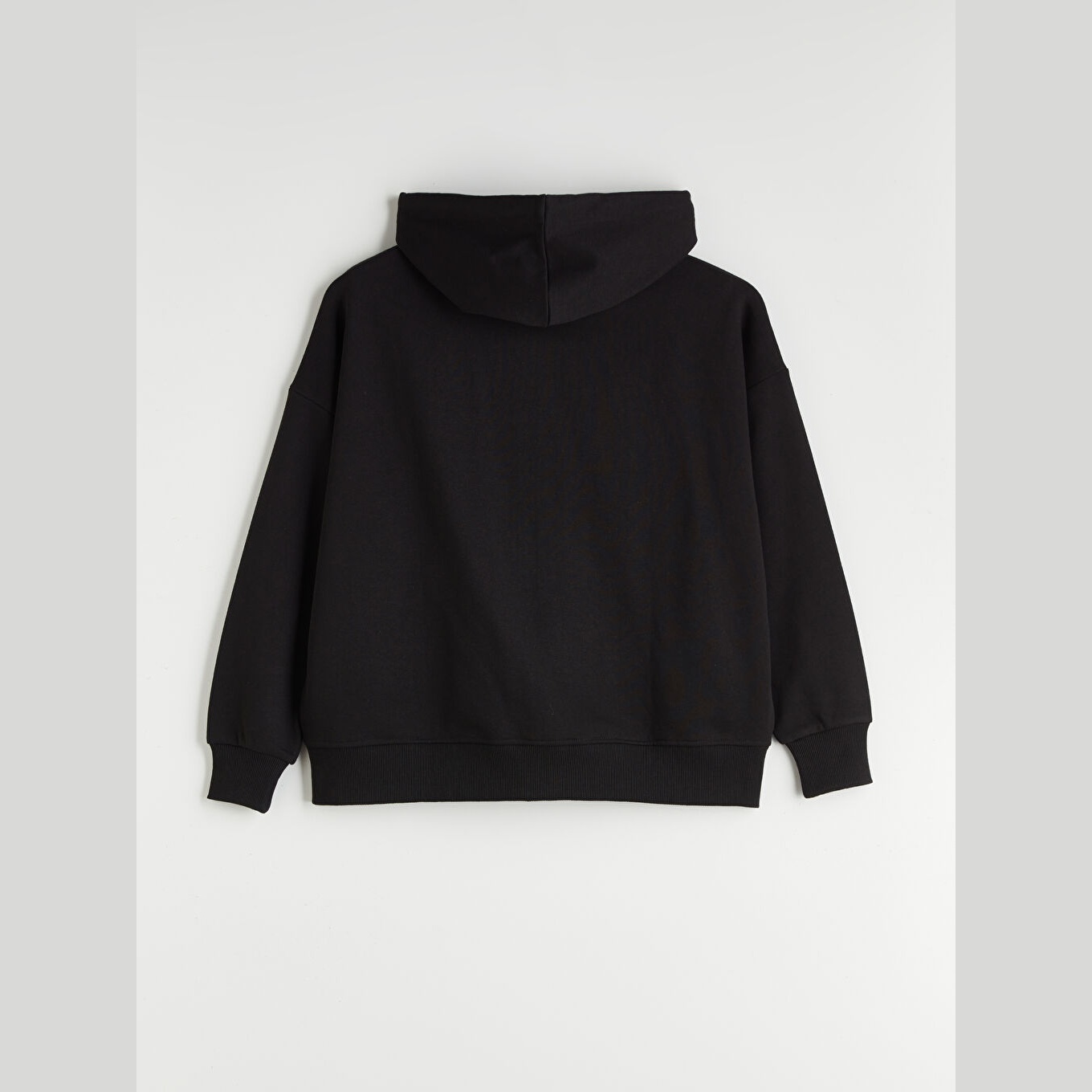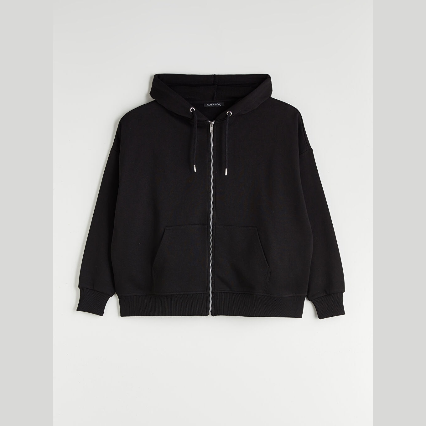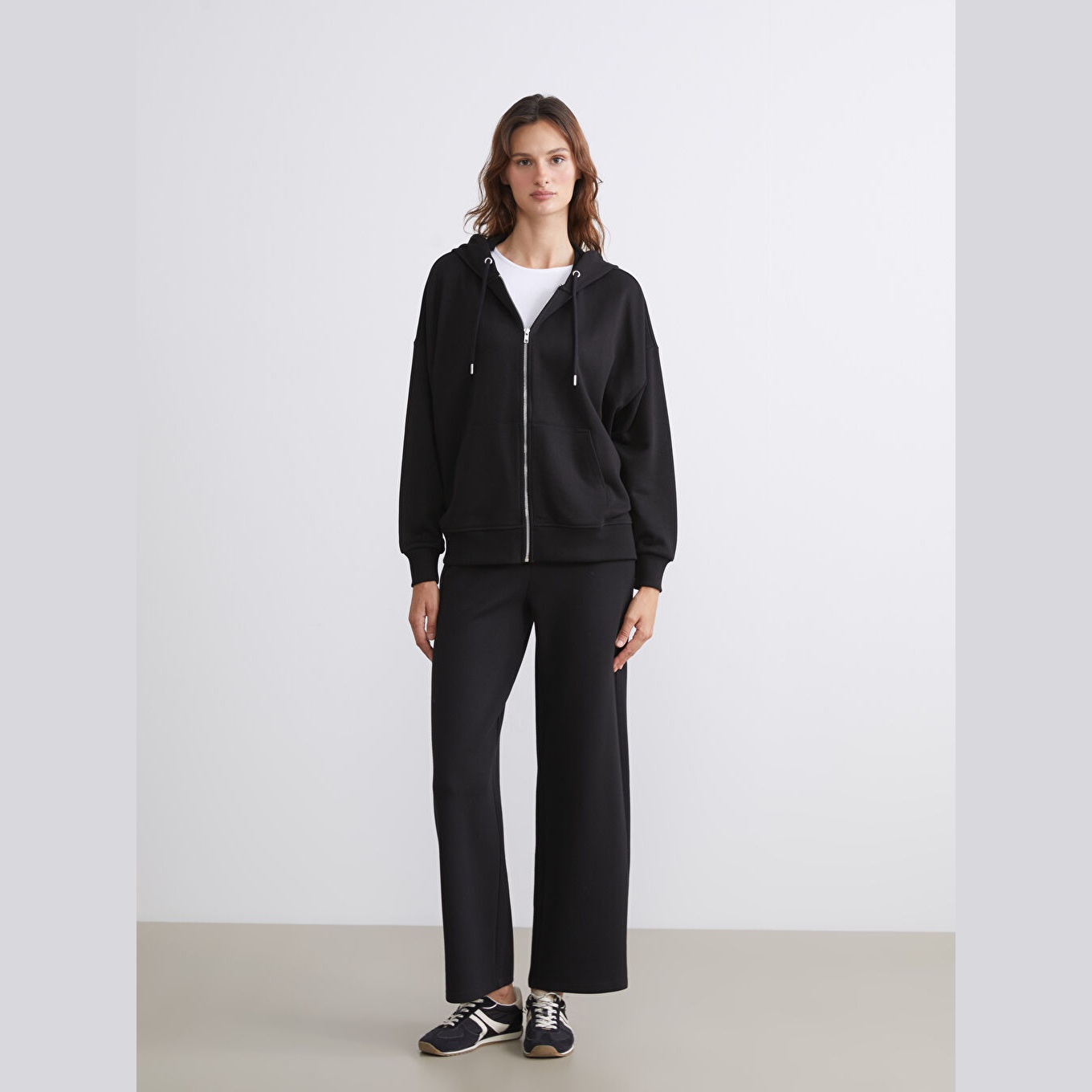 سويت شيرت نسائي بغطاء رأس وقصة واسعة من LCW Vision – أسود (قصة Oversize، خامة 3 İplik متوسطة السماكة، تصميم سادة، فتحة سحاب أمامية، ضمن مجموعة العودة إلى الجامعة)