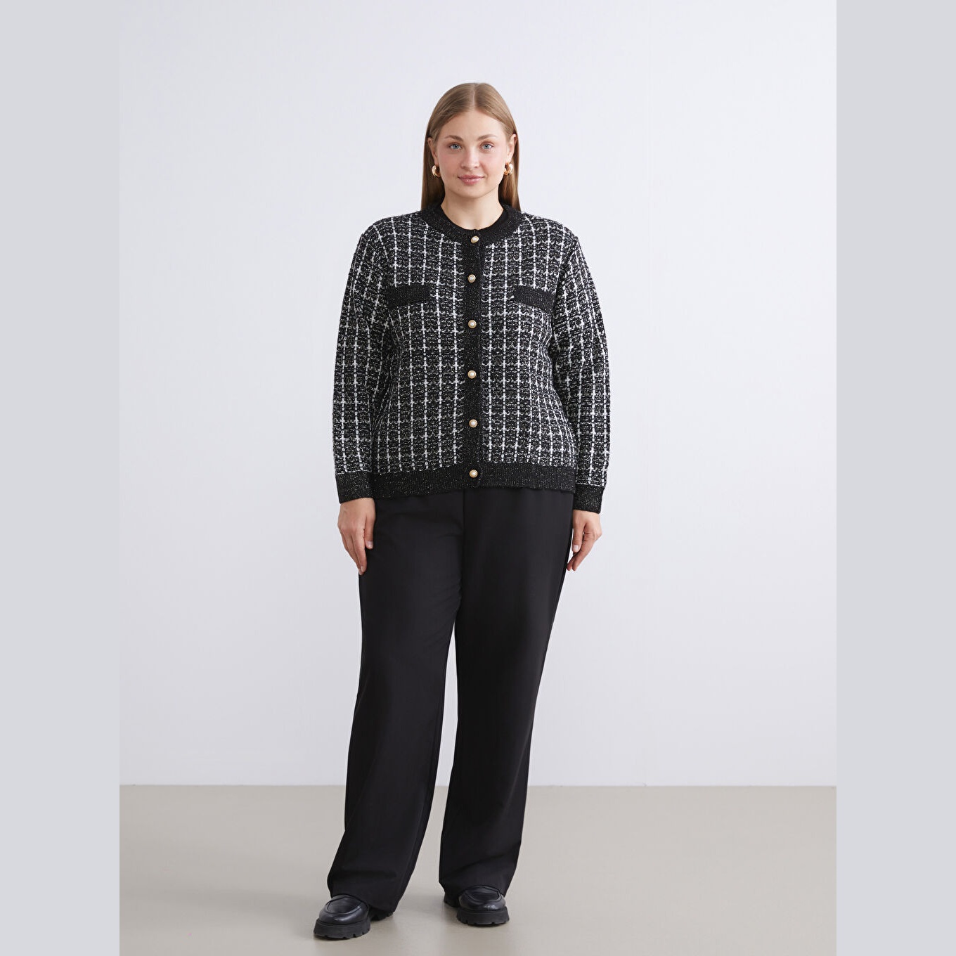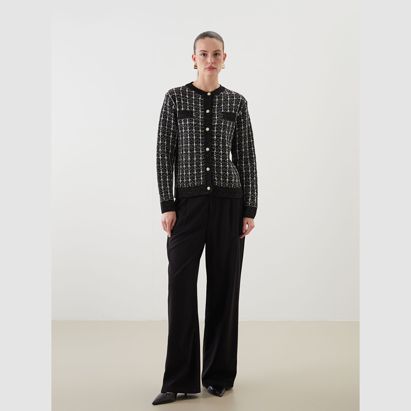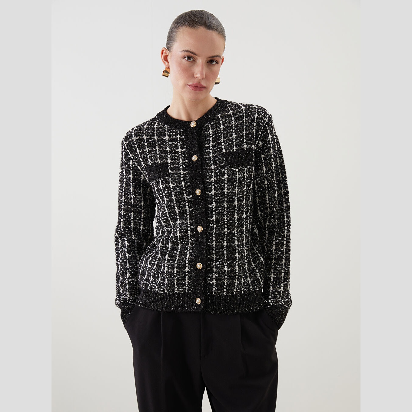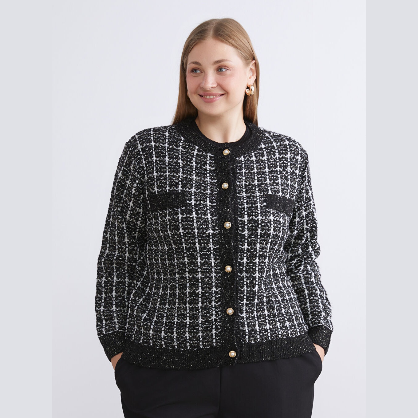 كارديغان نسائي بياقة دائرية بنقشة من LCW Classic – أسود (قصة قياسية، خامة تريكو متوسطة السماكة، تصميم مزخرف بخيوط لامعة، أزرار أمامية، ضمن مجموعة Büyük Beden)