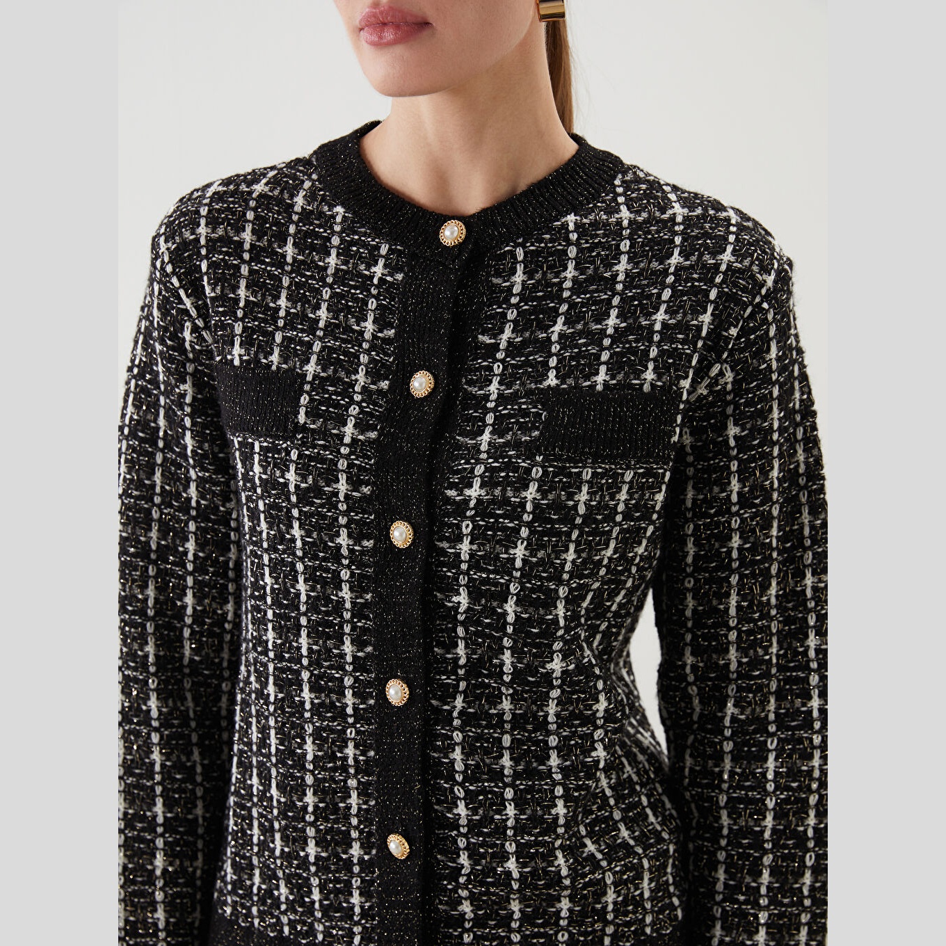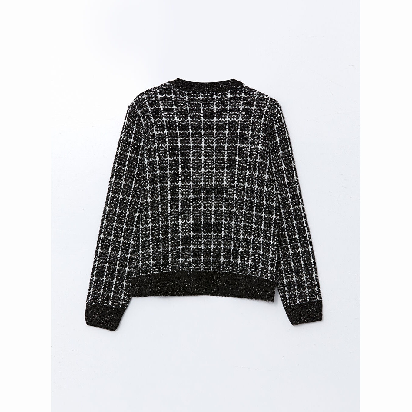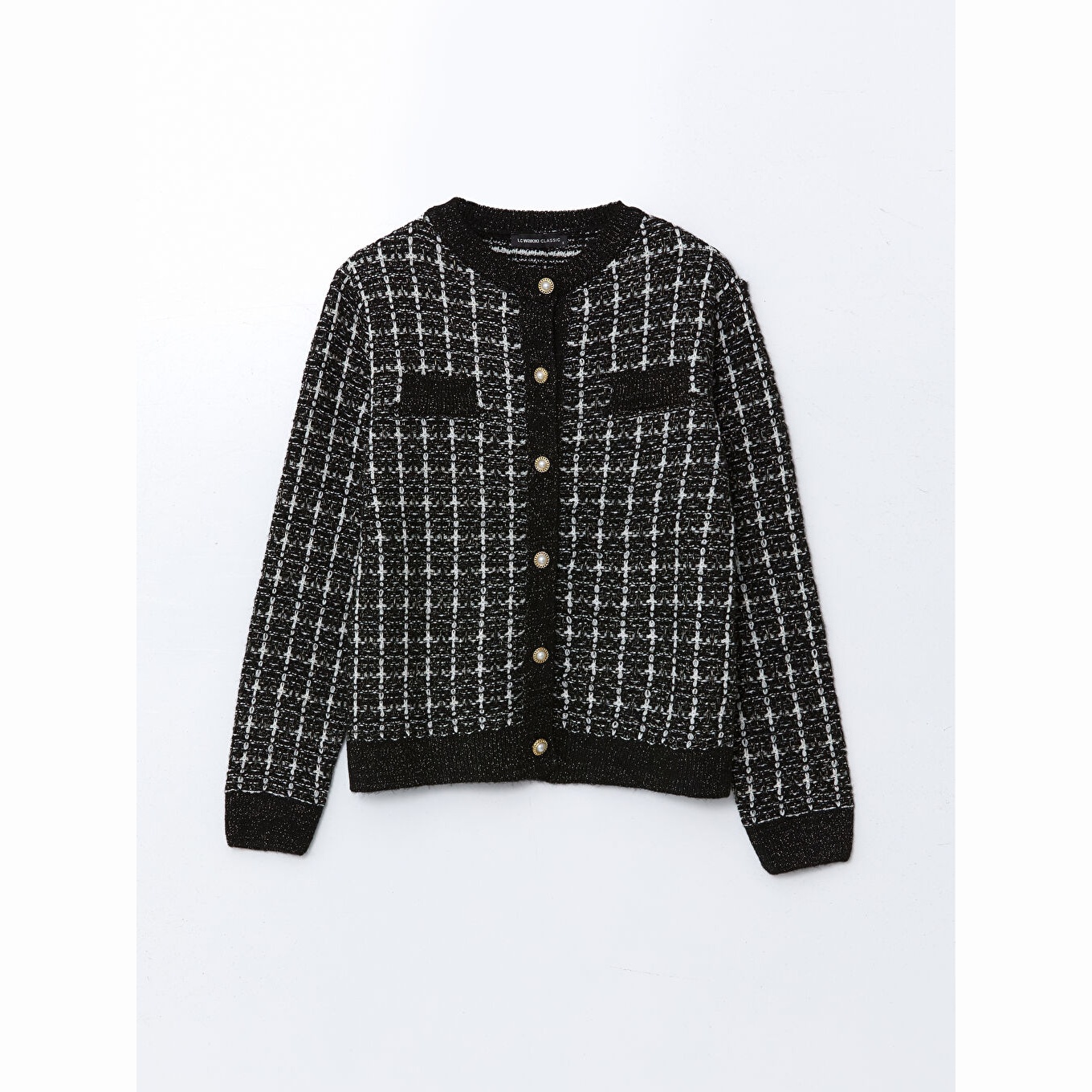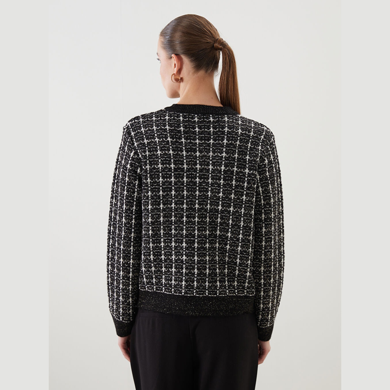 كارديغان نسائي بياقة دائرية بنقشة من LCW Classic – أسود (قصة قياسية، خامة تريكو متوسطة السماكة، تصميم مزخرف بخيوط لامعة، أزرار أمامية، ضمن مجموعة Büyük Beden)