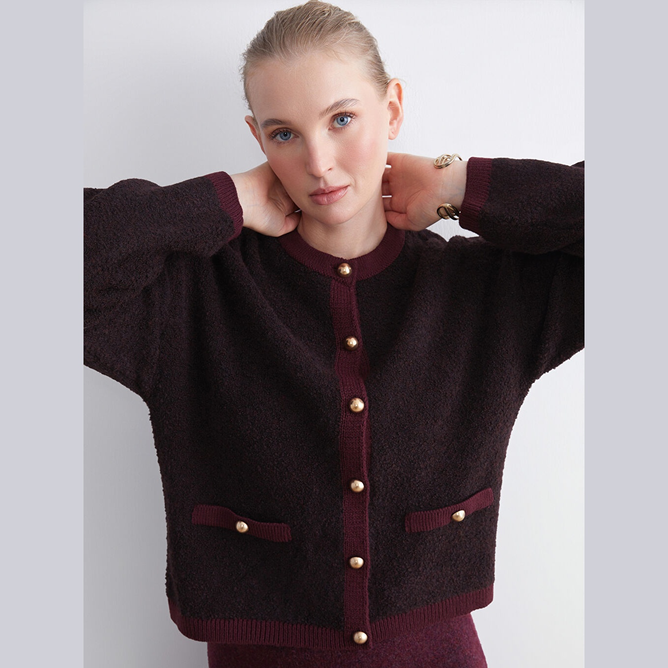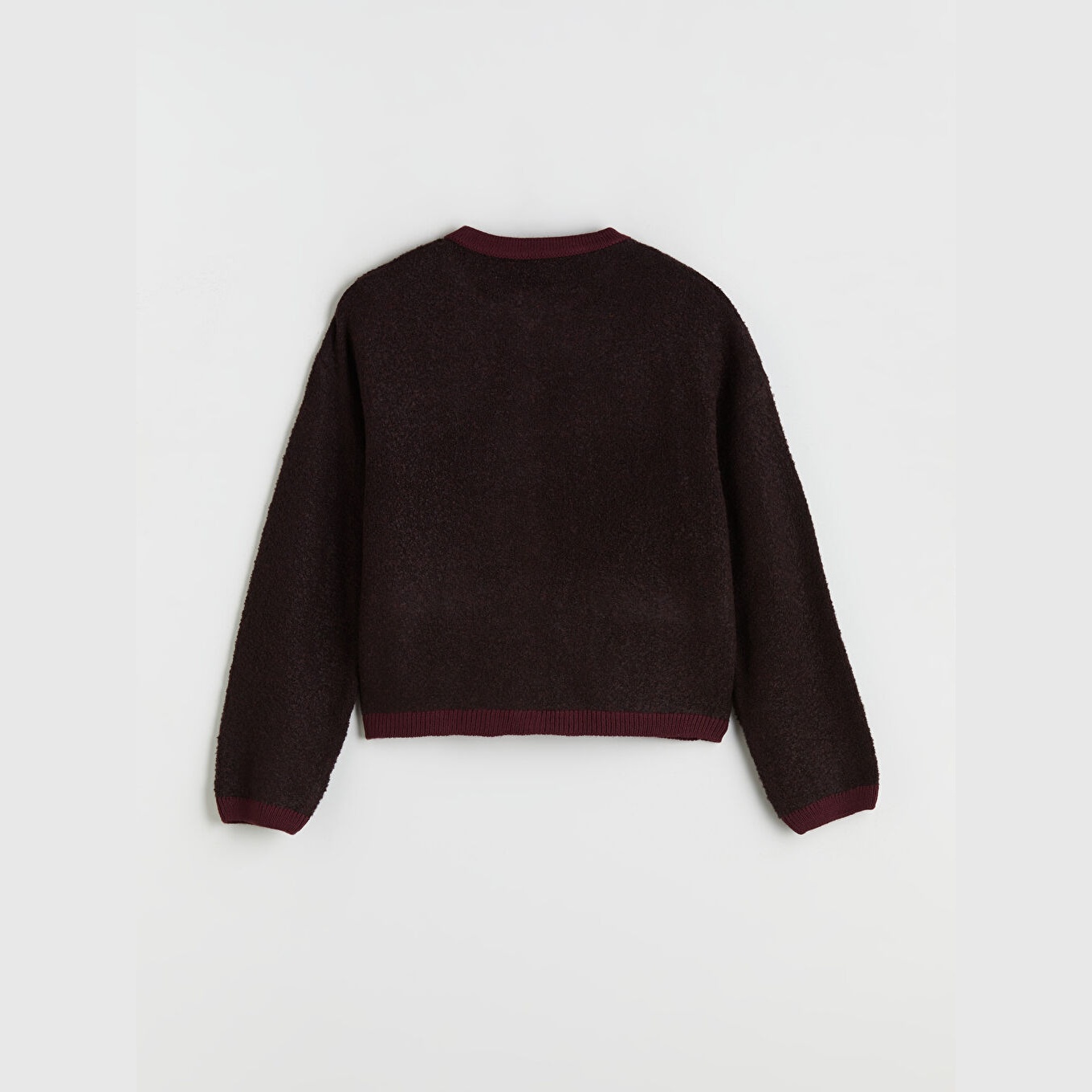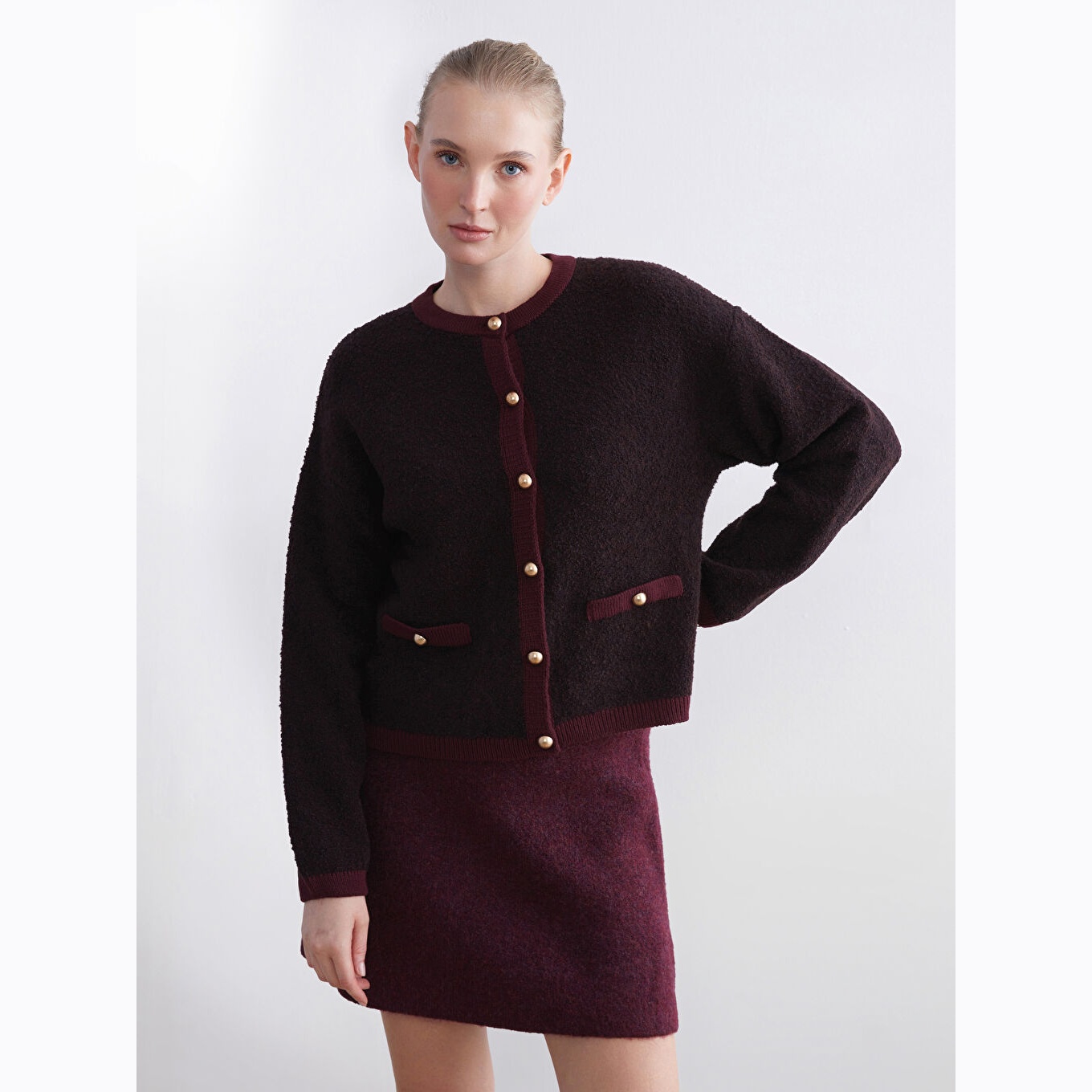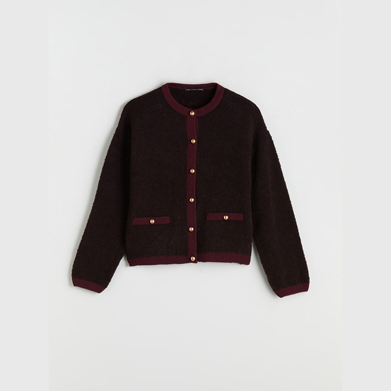 كارديغان نسائي بياقة دائرية من LCW Classic – بوردو (قصة قياسية، خامة تريكو متوسطة السماكة، تصميم سادة، أزرار أمامية، ضمن مجموعة LCW Classic)