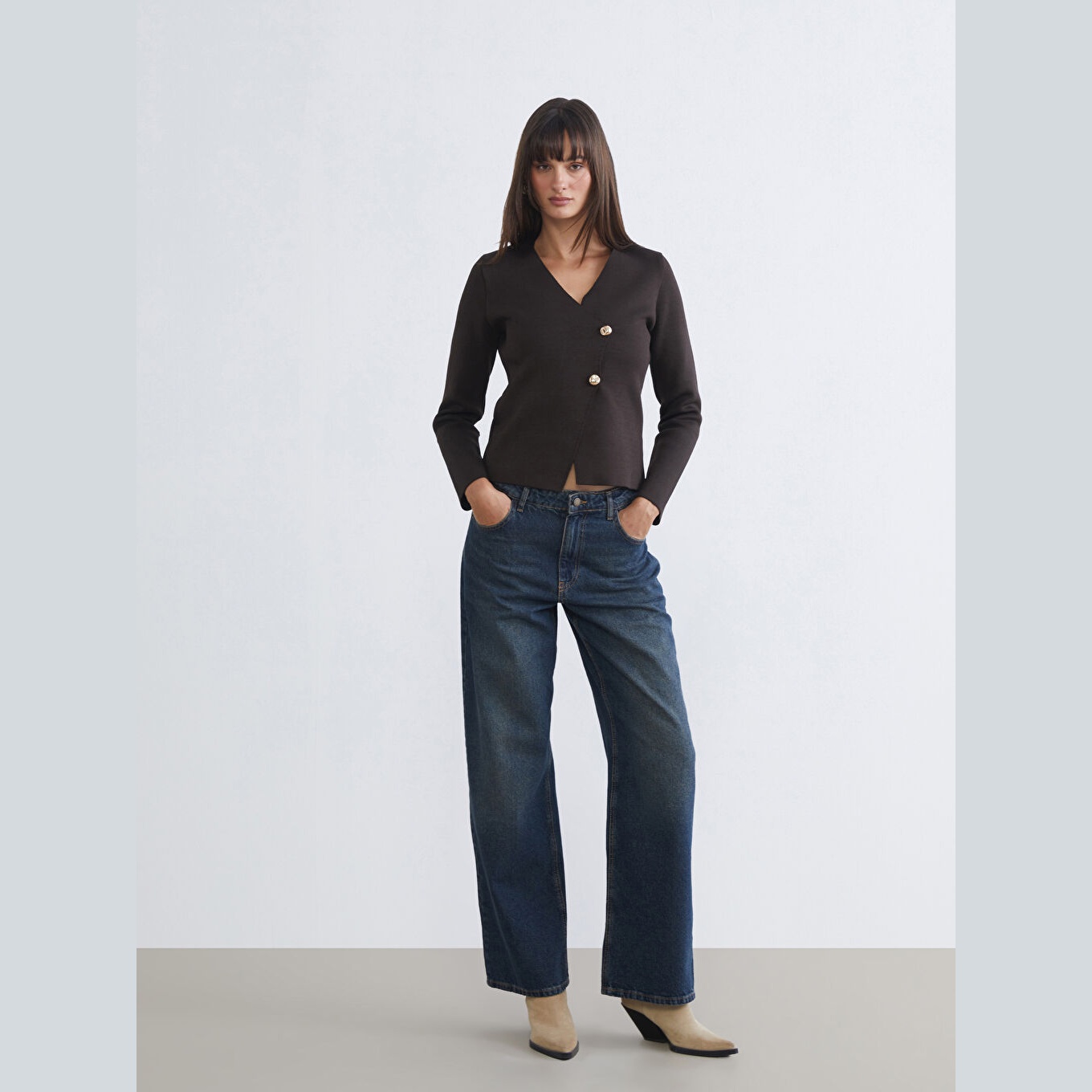 كارديغان أنيق من مجموعة LCW Vision بلون بني دافئ، مصمم بياقة Kruvaze متقاطعة تضيف لمسة أنثوية راقية، أكمام طويلة، قصة Dar & Slim ضيقة تبرز القوام بانسيابية، تصميم سادة بدون نقوش، خامة Triko ناعمة بتركيبة من %52 فيسكوز، %48 بوليستر، مزود بأزرار أمامية للإغلاق، بطول يُقاس من الكتف، مثالي للتنسيق مع بناطيل قماش أو تنانير عالية الخصر لإطلالة مكتبية أو يومية أنيقة ومحتشمة.