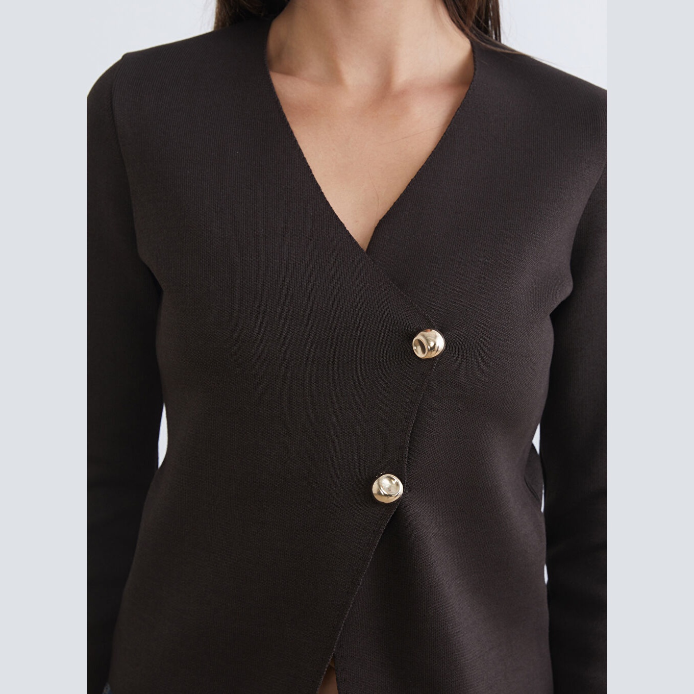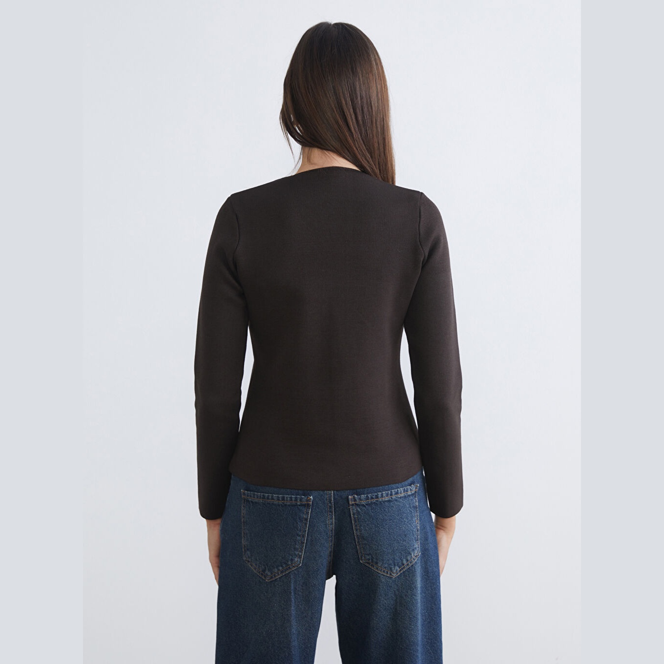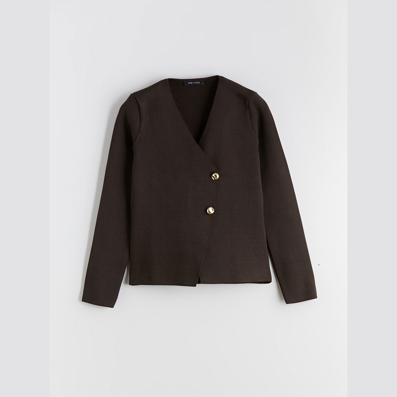 كارديغان نسائي بياقة كروڤاز وأزرار أمامية من LCW Vision – بني (قصة Slim، خامة تريكو ناعمة، تصميم سادة، ضمن مجموعة LCW Vision)