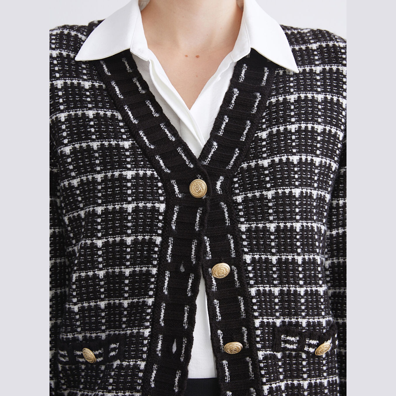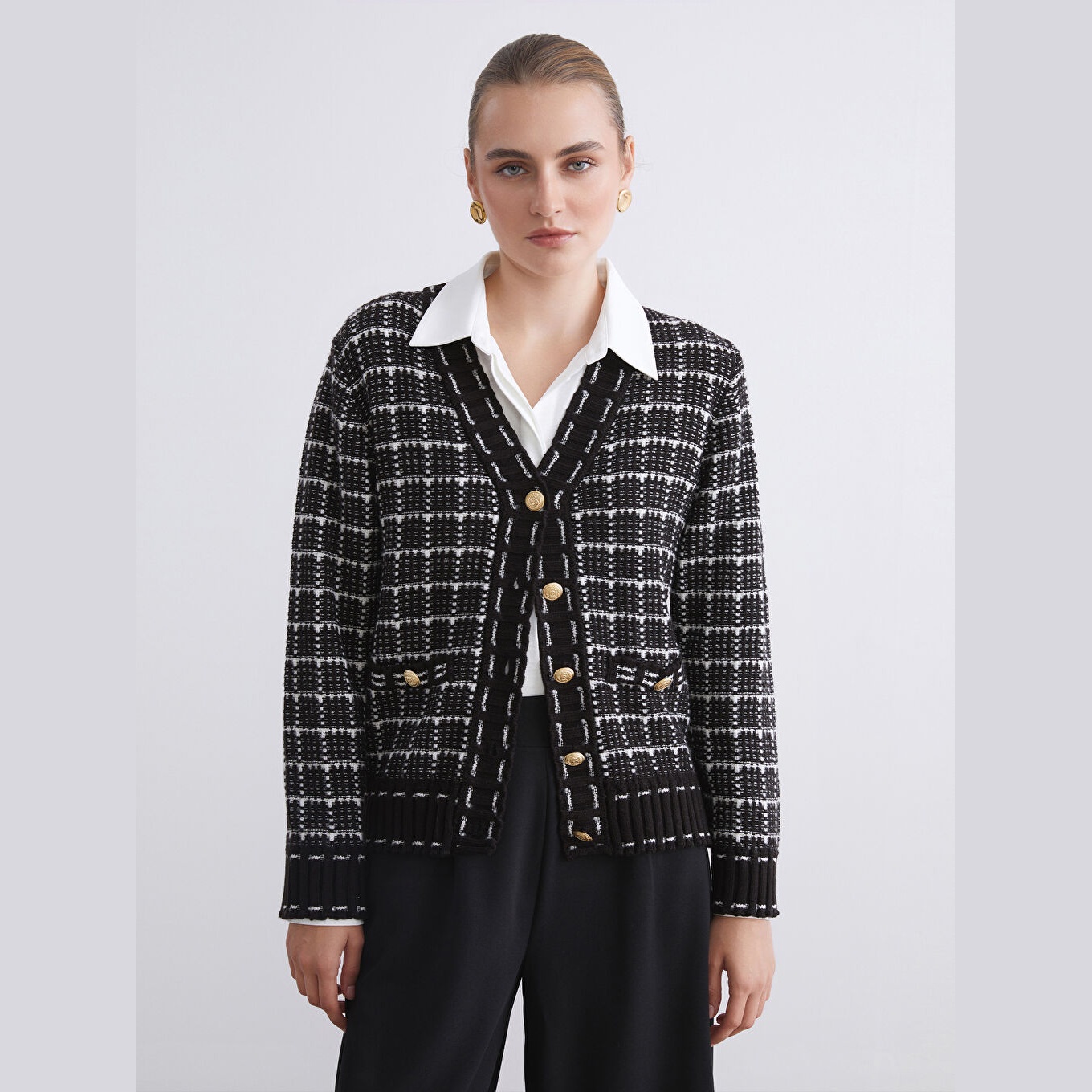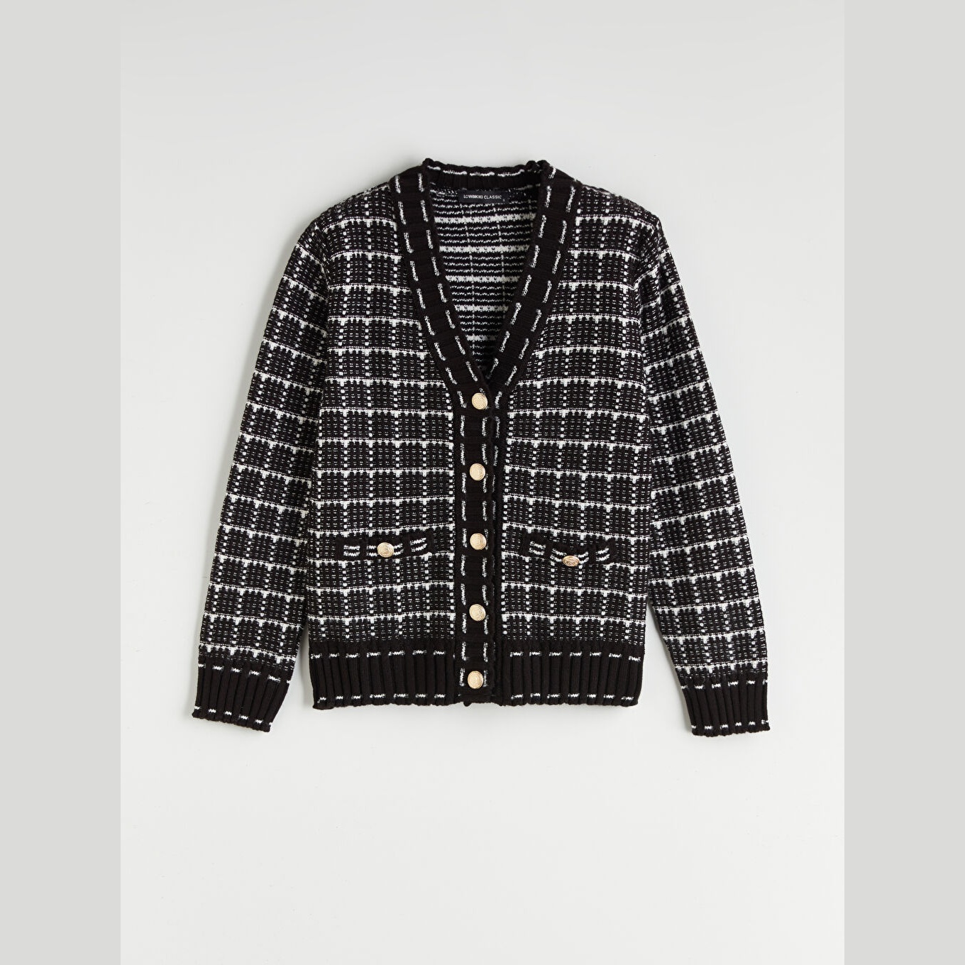 كارديغان نسائي بياقة V بنقشة مربعات من LCW Classic – أسود (قصة ضيقة، خامة تريكو متوسطة السماكة، تصميم إكّوسي، أزرار أمامية، ضمن مجموعة LCW Classic)
