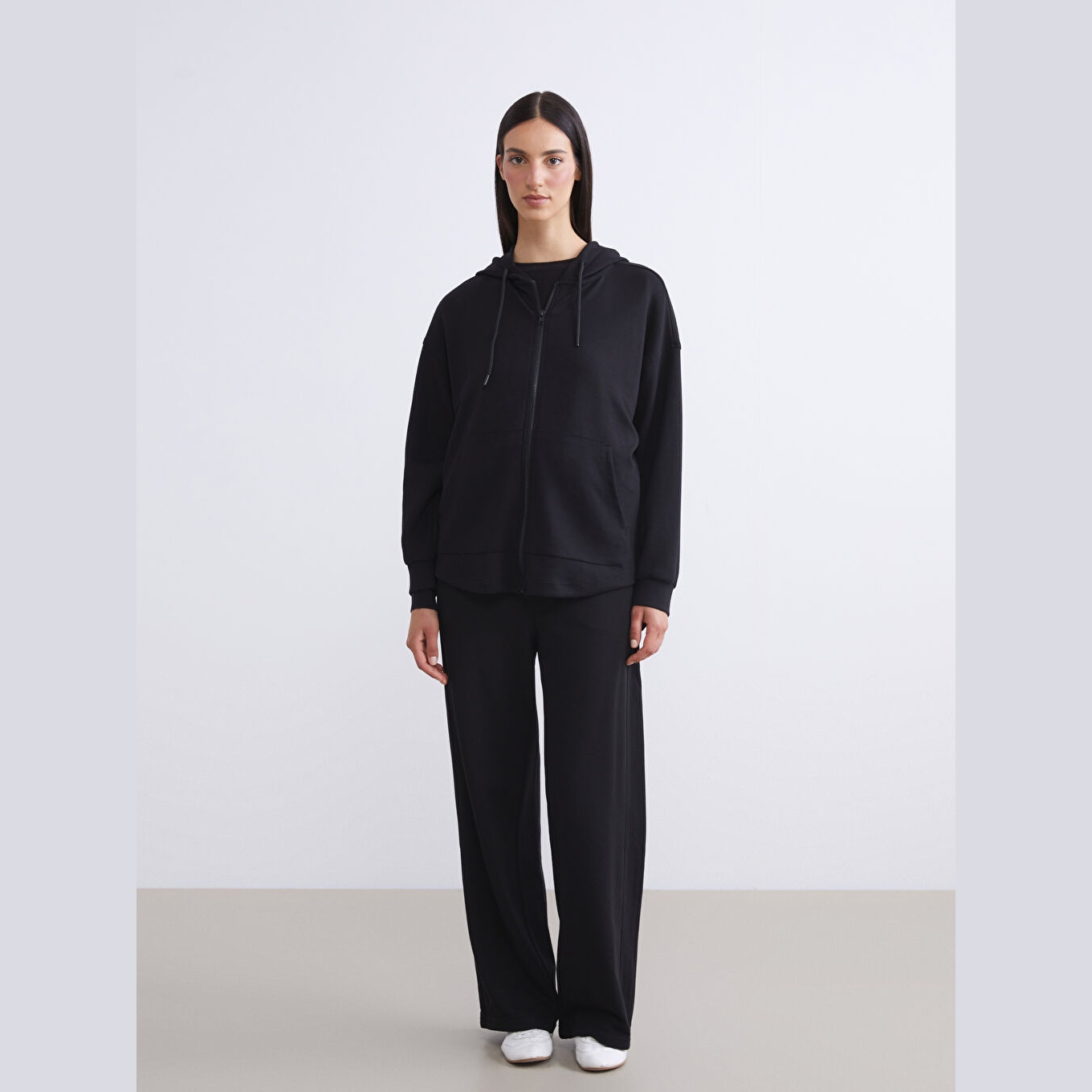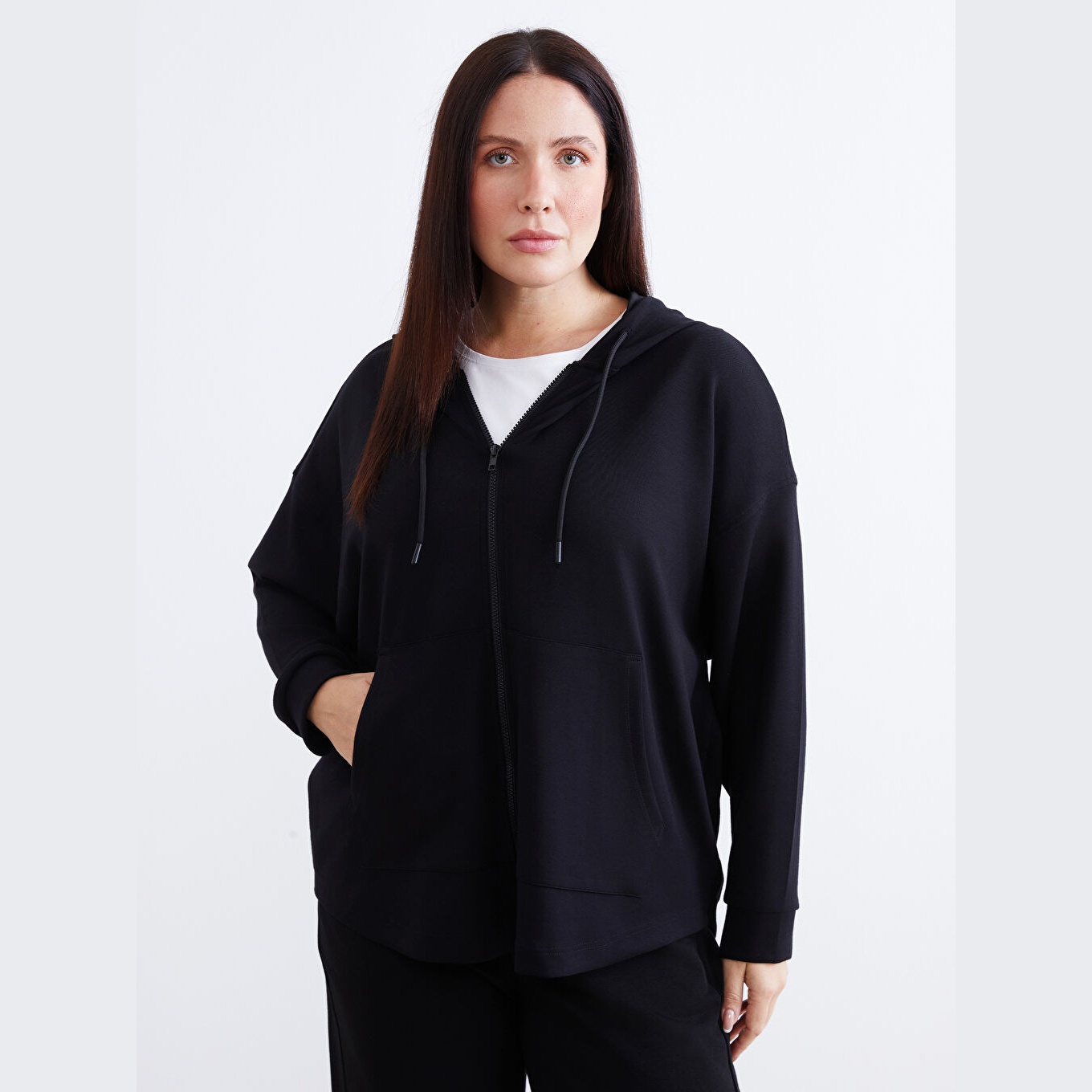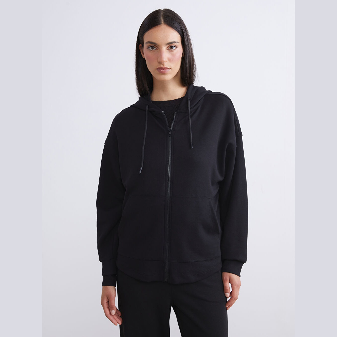سويت شيرت نسائي بقبعة وسحاب أمامي من LCW Modest – أسود (قصة Oversize، خامة إنترلوك متوسطة السماكة، تصميم سادة، ضمن مجموعة LCW Modest للمحتشمات)
