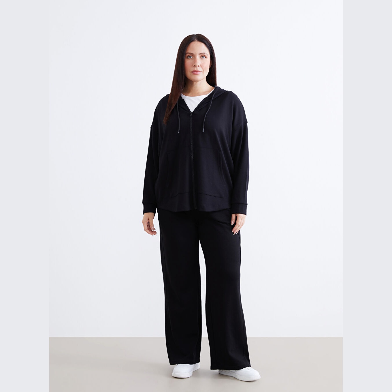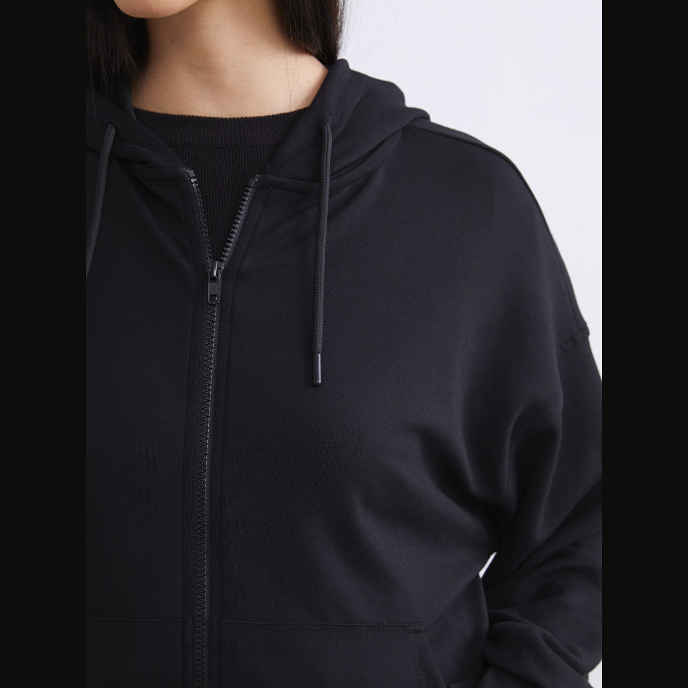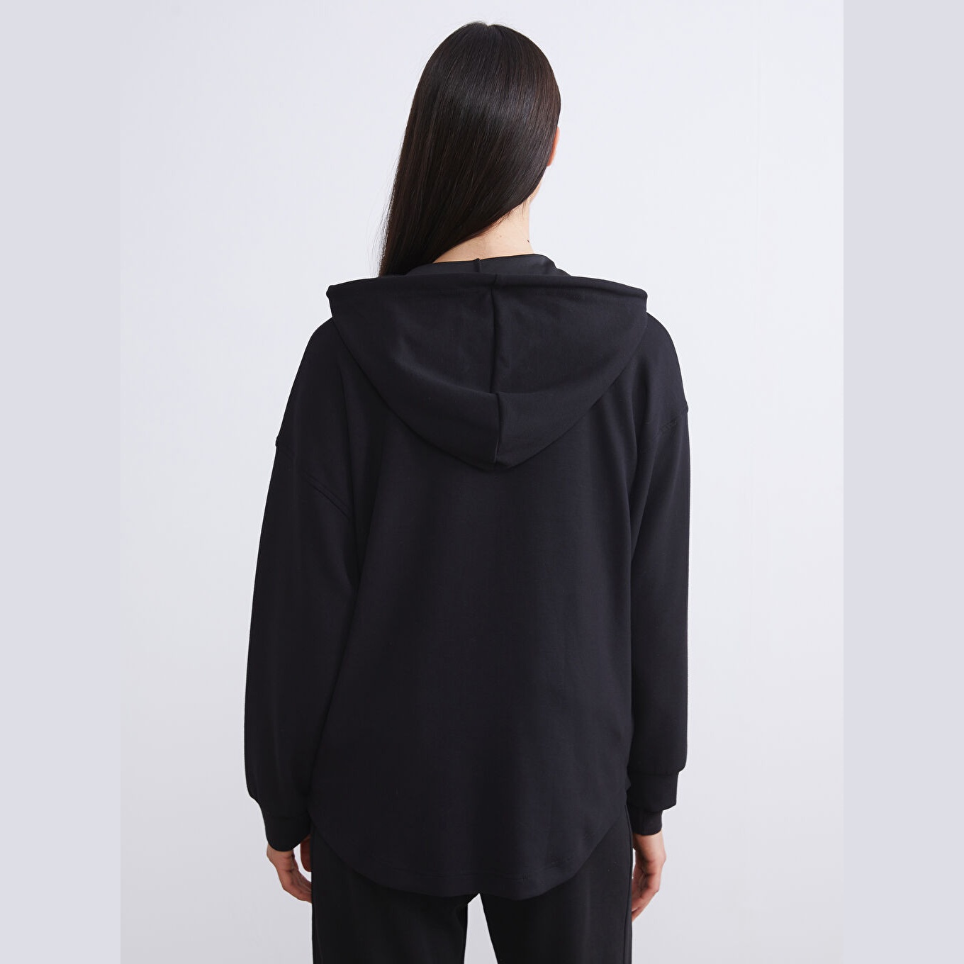 سويت شيرت نسائي بقبعة وسحاب أمامي من LCW Modest – أسود (قصة Oversize، خامة إنترلوك متوسطة السماكة، تصميم سادة، ضمن مجموعة LCW Modest للمحتشمات)