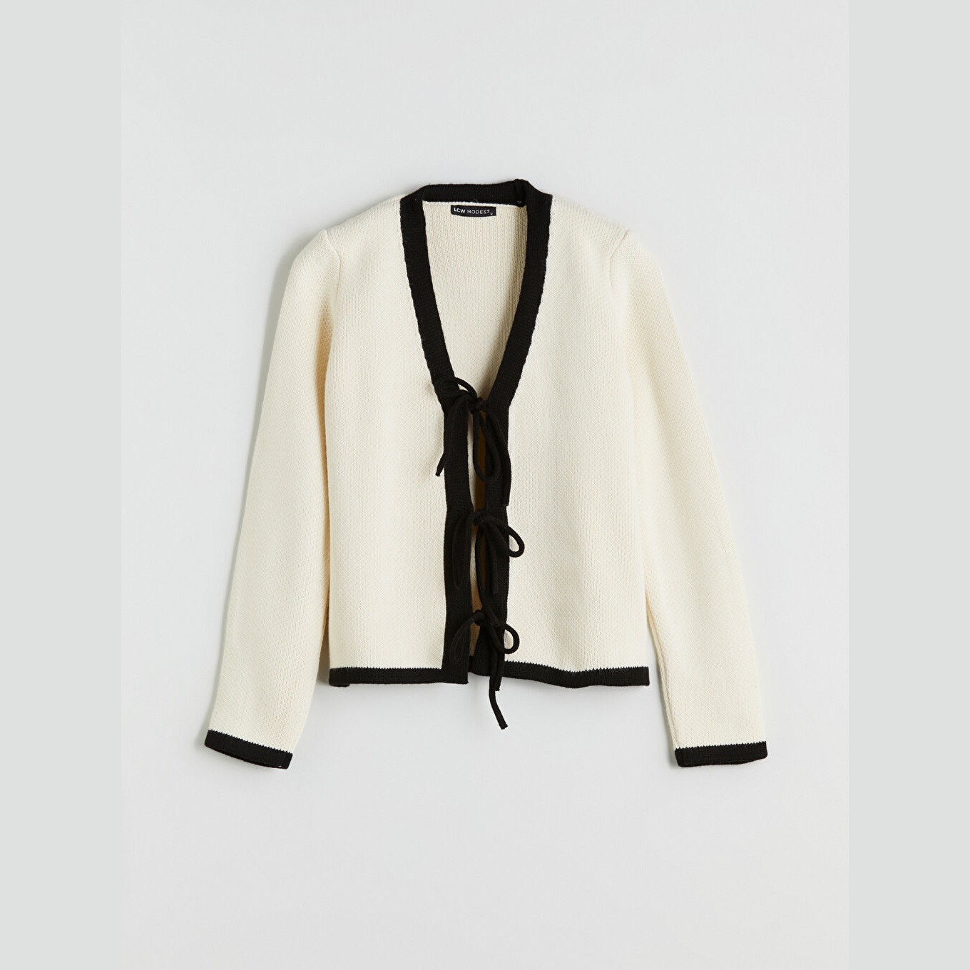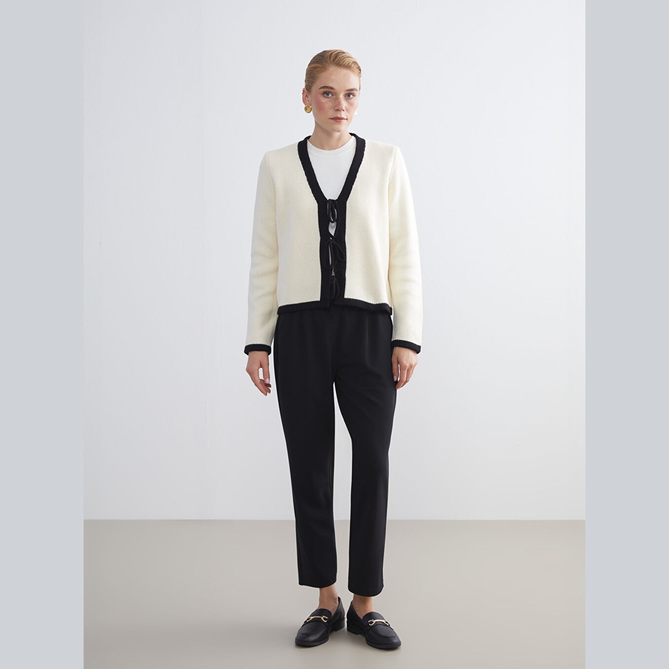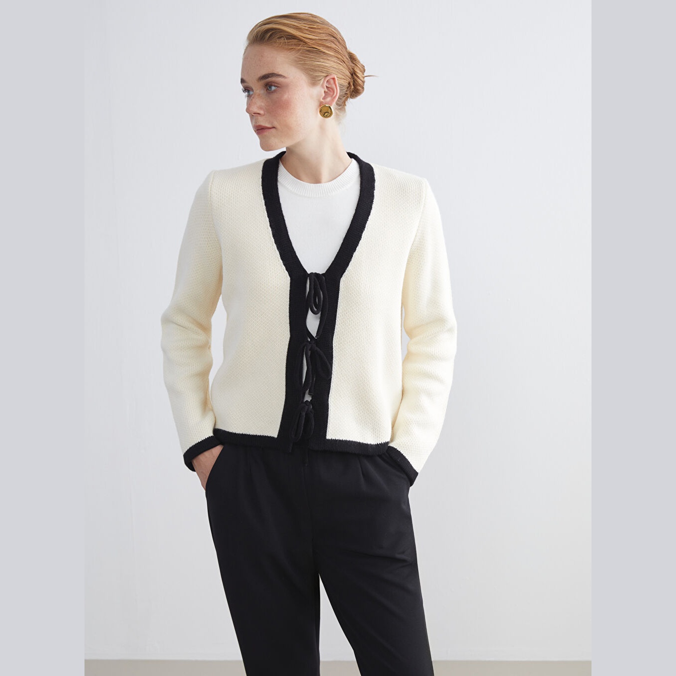 كارديغان أنيق من مجموعة LCW Modest بلون إكرو حيادي، مصمم بياقة V أنثوية تضيف لمسة ناعمة ومفتوحة حول الرقبة، مزود بربطة أمامية تضيف لمسة أنثوية وعملية، قصة Standart & Regular توفر مظهرًا متناسقًا ومريحًا، تصميم سادة بدون نقوش، خامة Triko متوسطة السماكة بتركيبة من %100 أكريليك، بطول قصير (Kısa) يُقاس من الكتف، مثالي للتنسيق مع بناطيل قماش أو تنانير لإطلالة خريفية أو مكتبية أنيقة ومحتشمة، ويندرج ضمن مجموعة Tesettür Giyim.