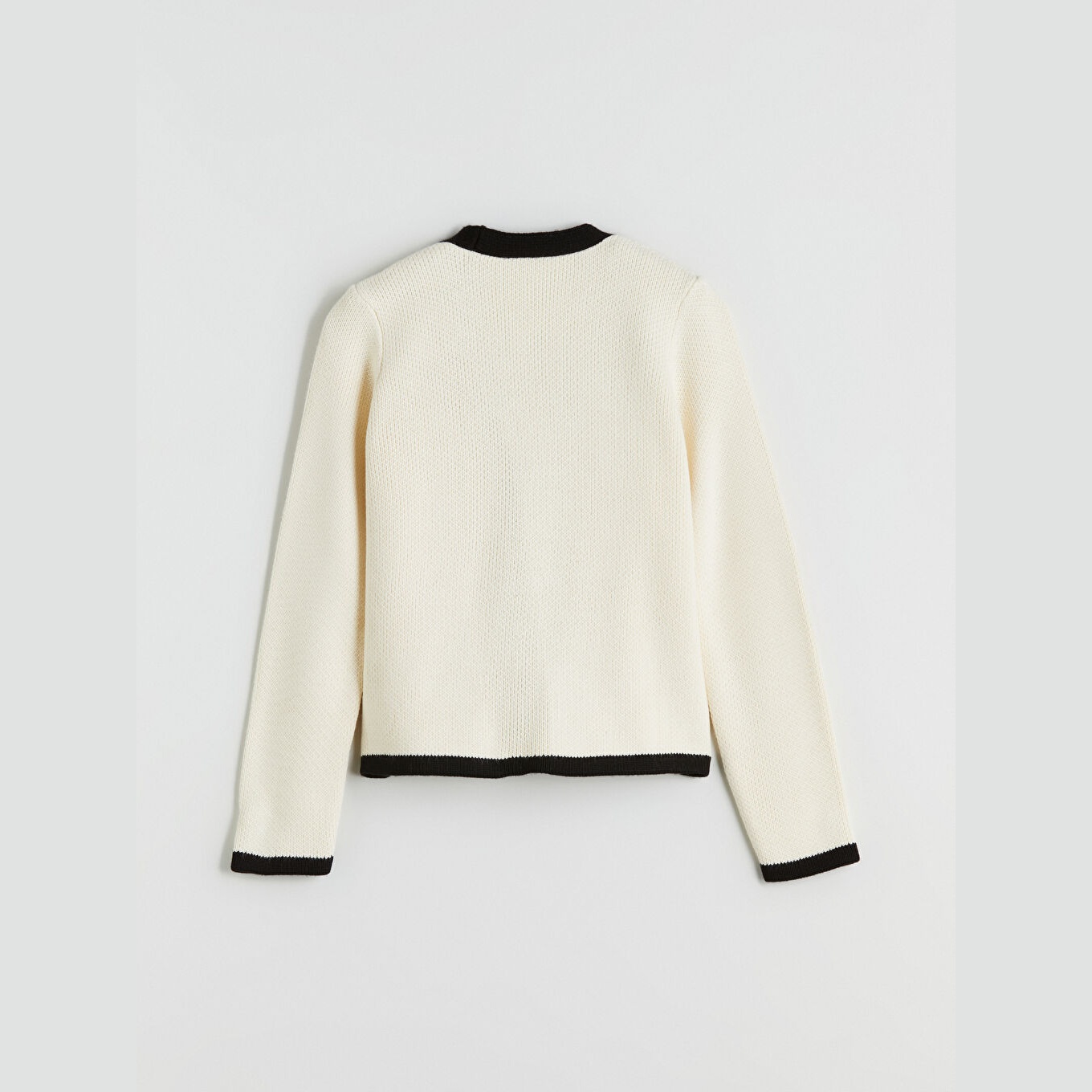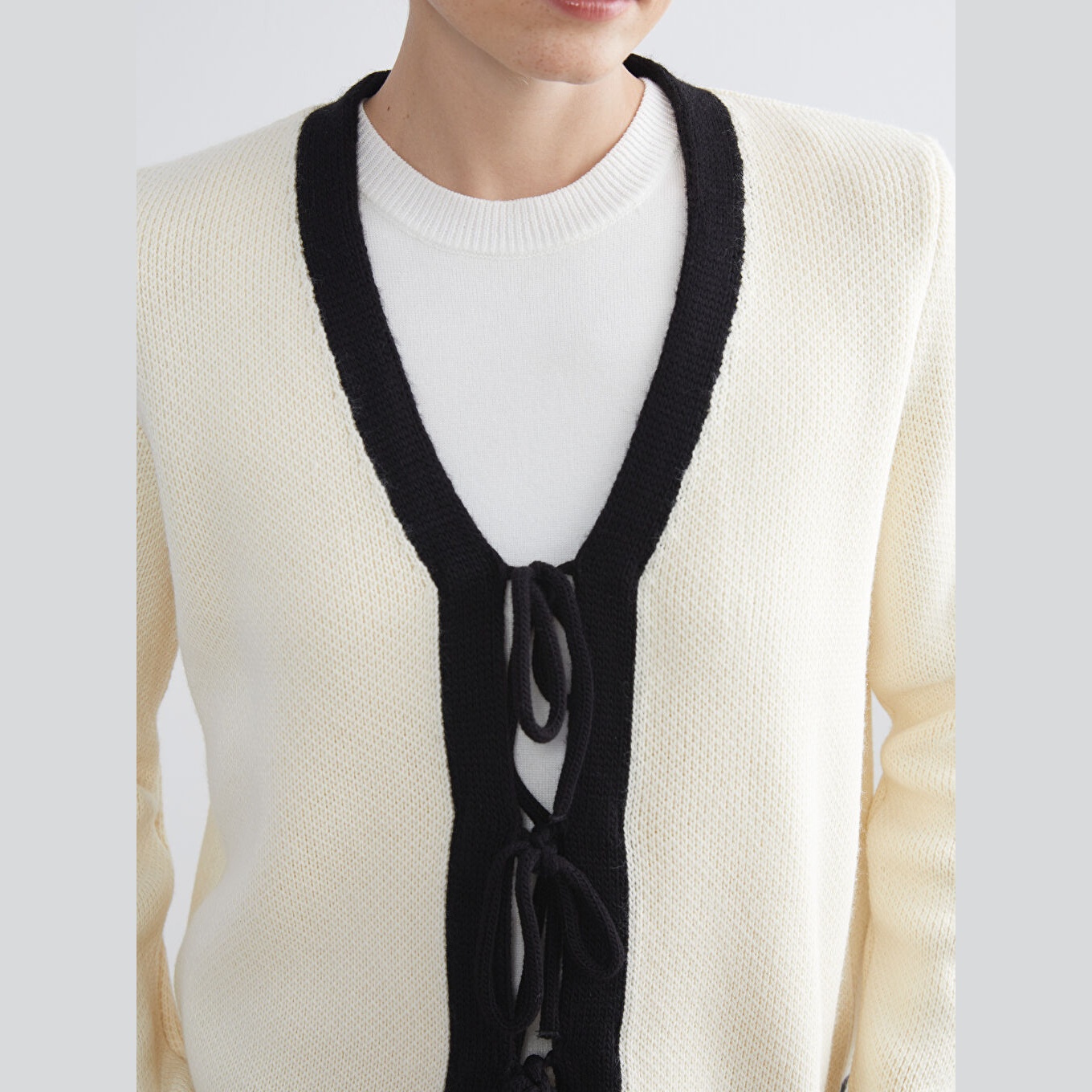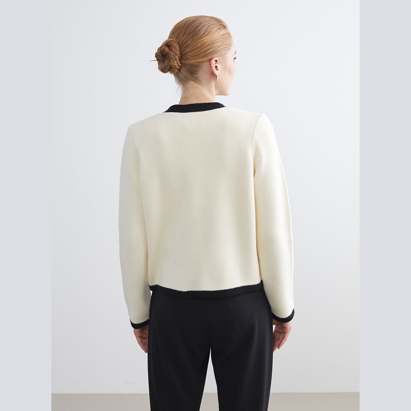 كارديغان أنيق من مجموعة LCW Modest بلون إكرو حيادي، مصمم بياقة V أنثوية تضيف لمسة ناعمة ومفتوحة حول الرقبة، مزود بربطة أمامية تضيف لمسة أنثوية وعملية، قصة Standart & Regular توفر مظهرًا متناسقًا ومريحًا، تصميم سادة بدون نقوش، خامة Triko متوسطة السماكة بتركيبة من %100 أكريليك، بطول قصير (Kısa) يُقاس من الكتف، مثالي للتنسيق مع بناطيل قماش أو تنانير لإطلالة خريفية أو مكتبية أنيقة ومحتشمة، ويندرج ضمن مجموعة Tesettür Giyim.