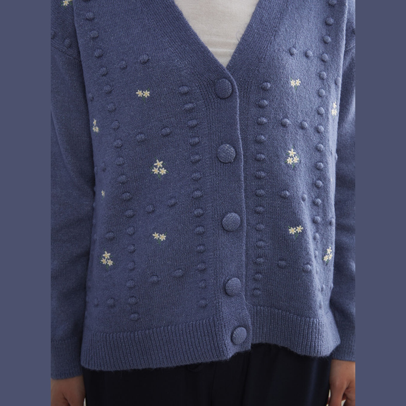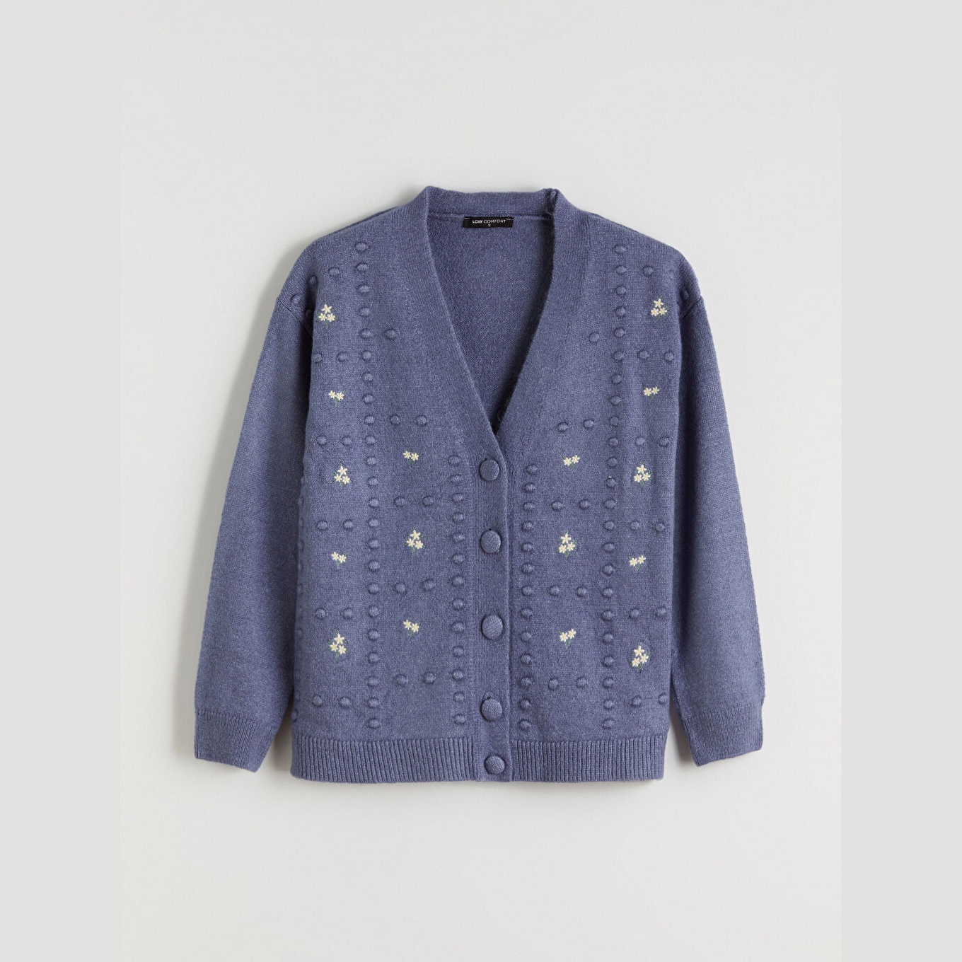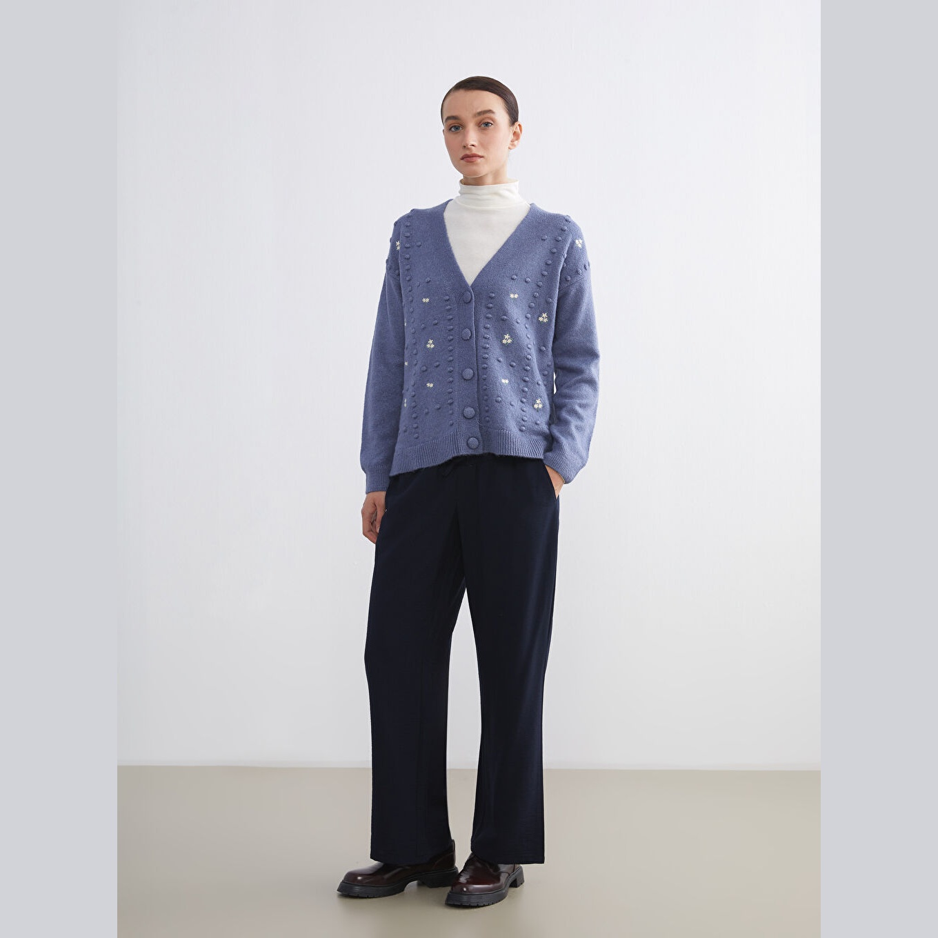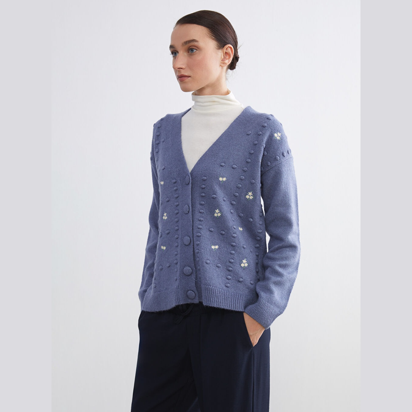 كارديغان نسائي بياقة V وتطريز زهور من LCW Comfort – أزرق (قصة Loose & Bol، خامة Triko متوسطة السماكة، تصميم مطرز، مخصص لفترة الحمل وما بعدها، ضمن مجموعة Büyük Beden)