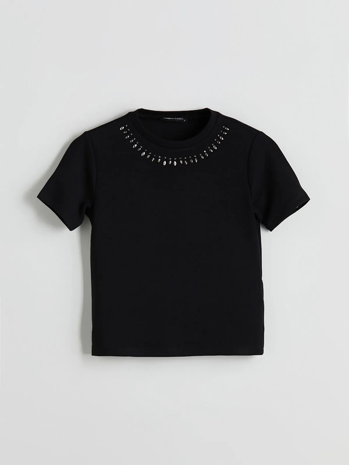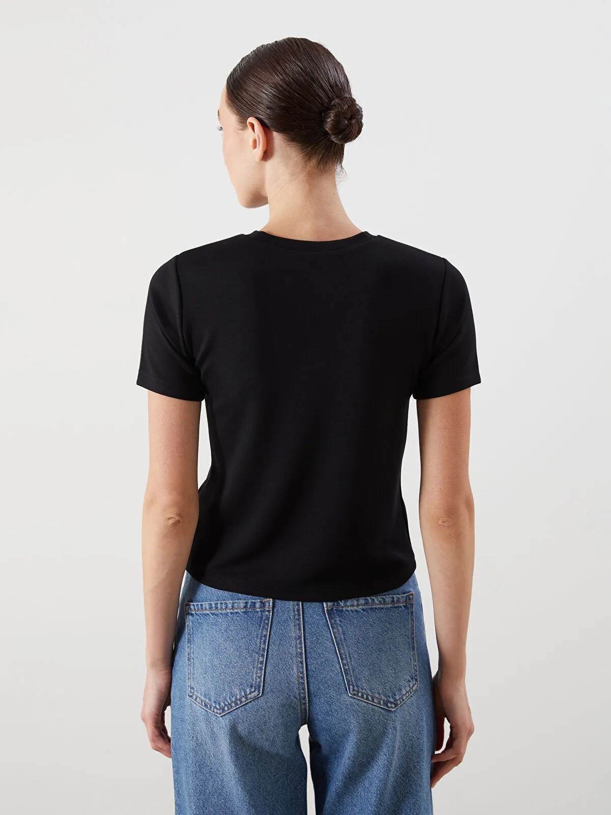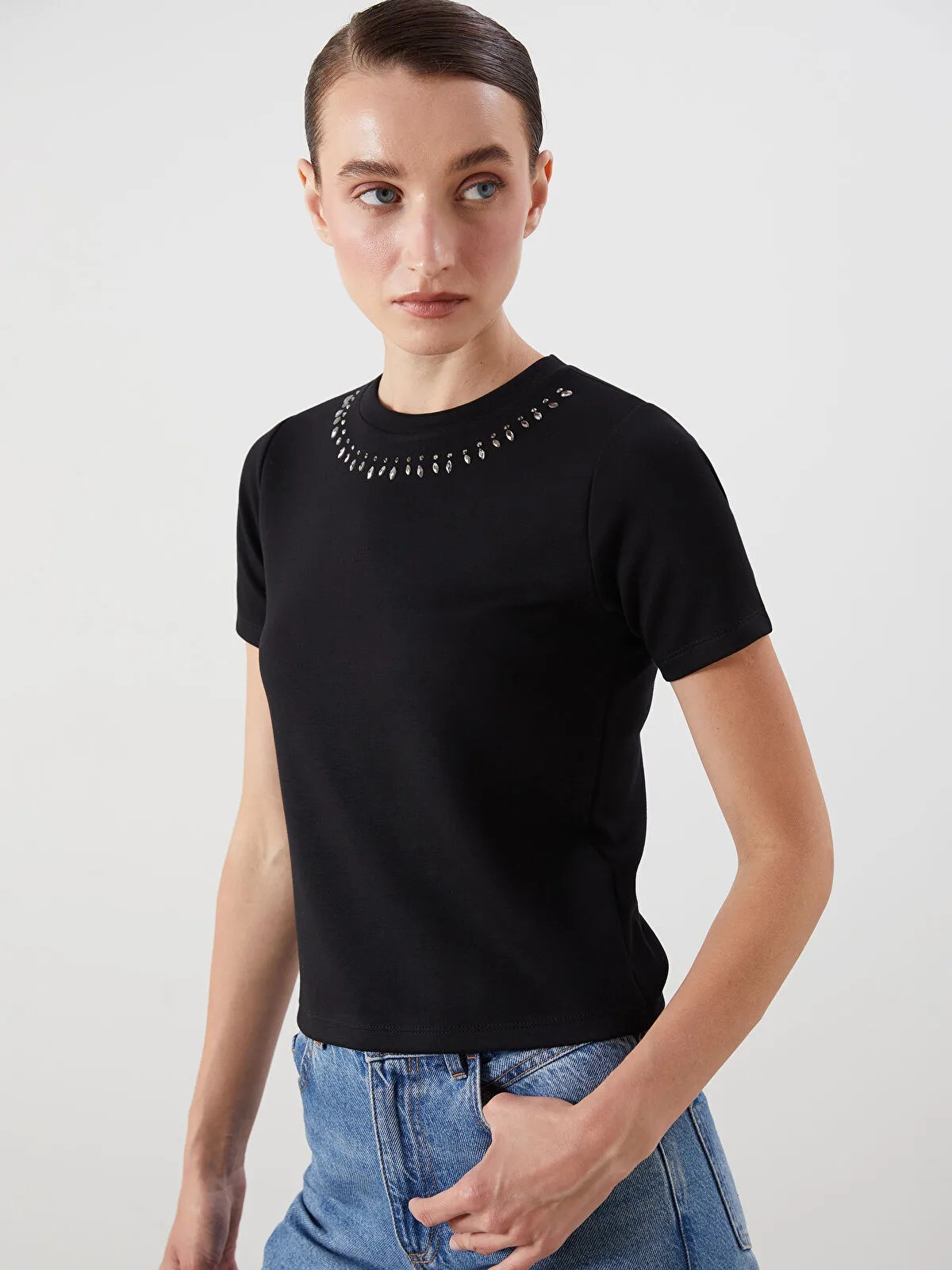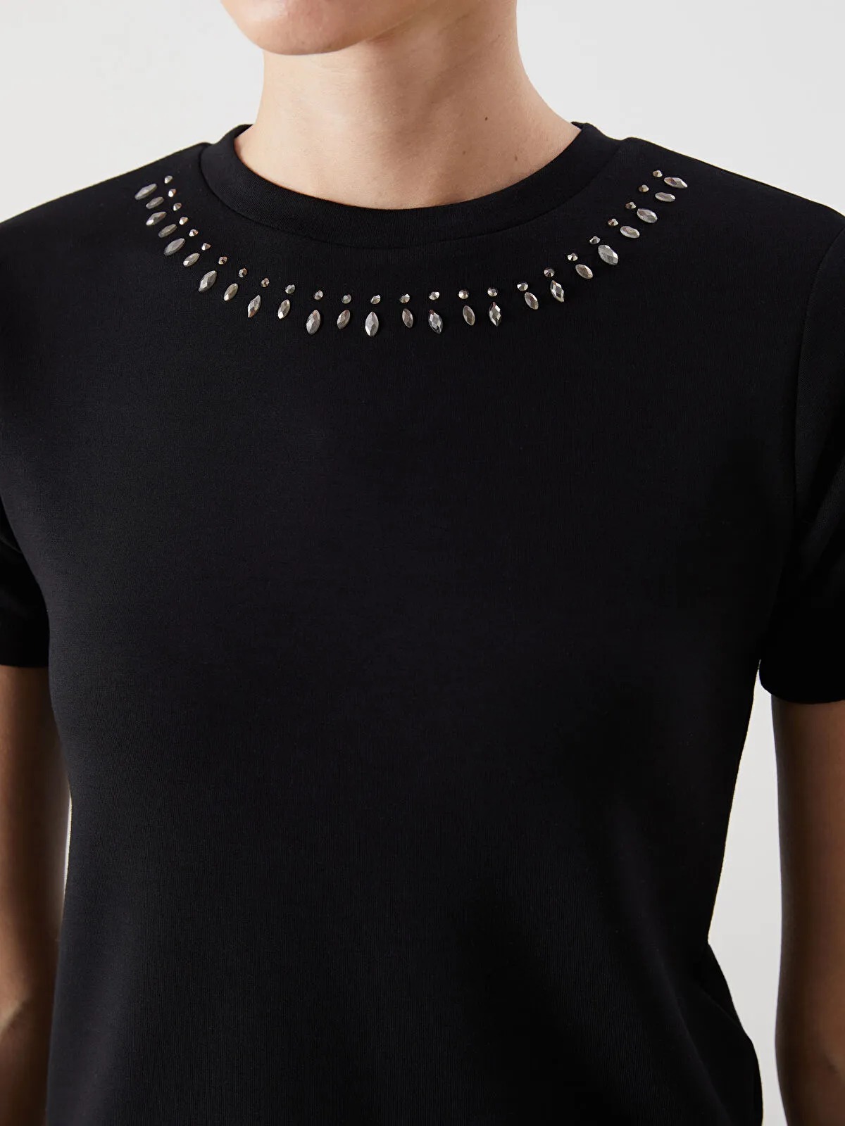 تيشيرت نسائي بلون أسود ناصع، بياقة دائرية قصيرة وأكمام قصيرة، مزين بتفاصيل من الأحجار اللامعة (taş baskı) عند الصدر، لإضافة لمسة أنثوية رشاقة وأنيقة. تصميم Loose & Bol يمنح حرية حركة وراحة مثالية طوال اليوم، مثالي للمظهر الكاجوال العصري المريح.