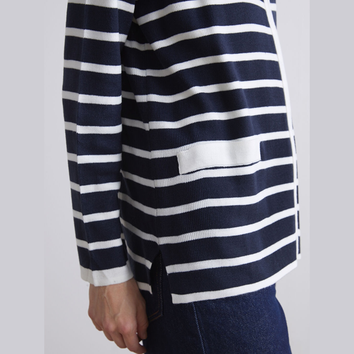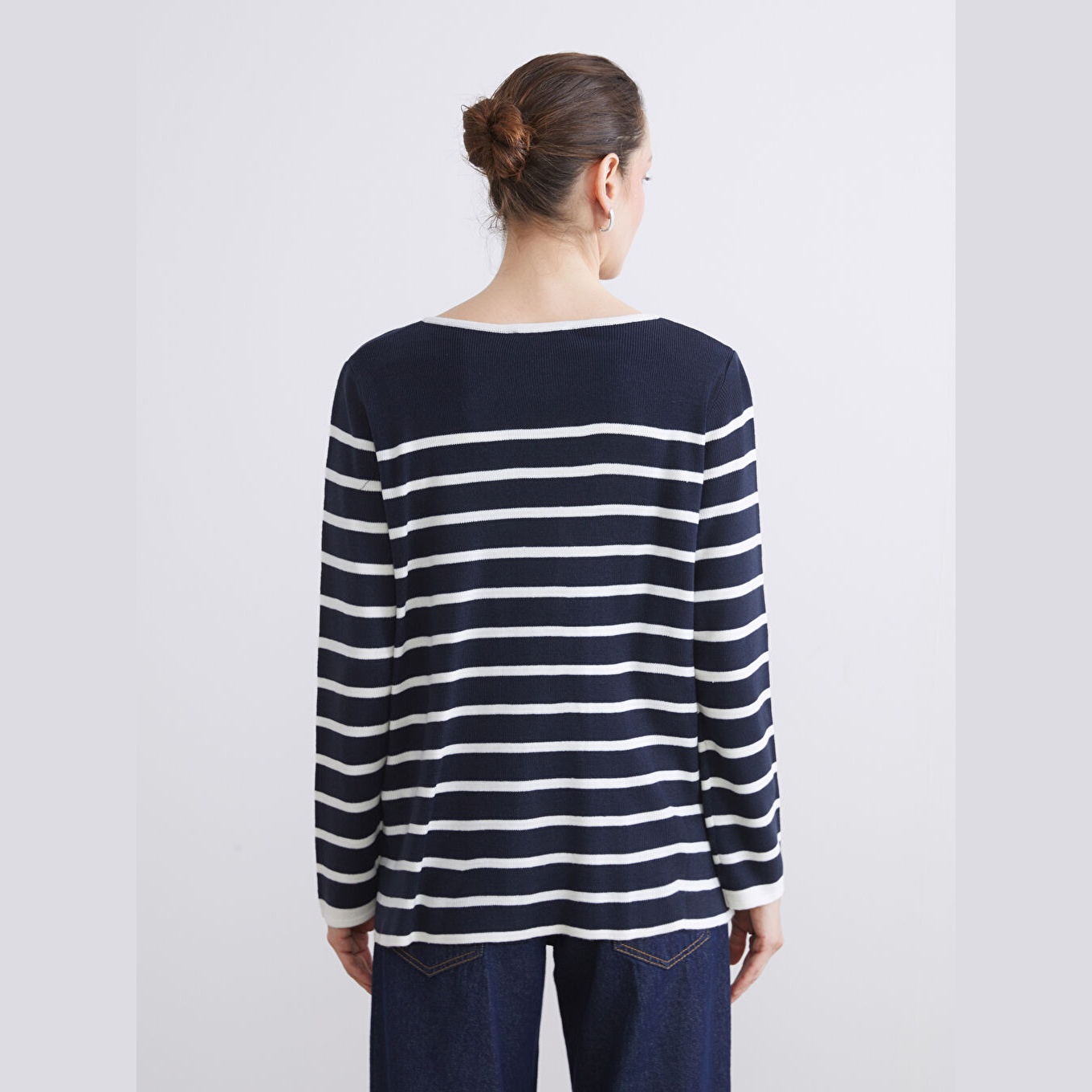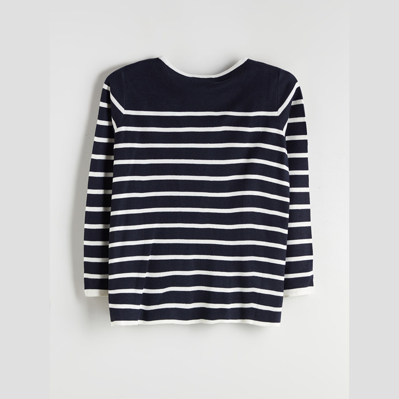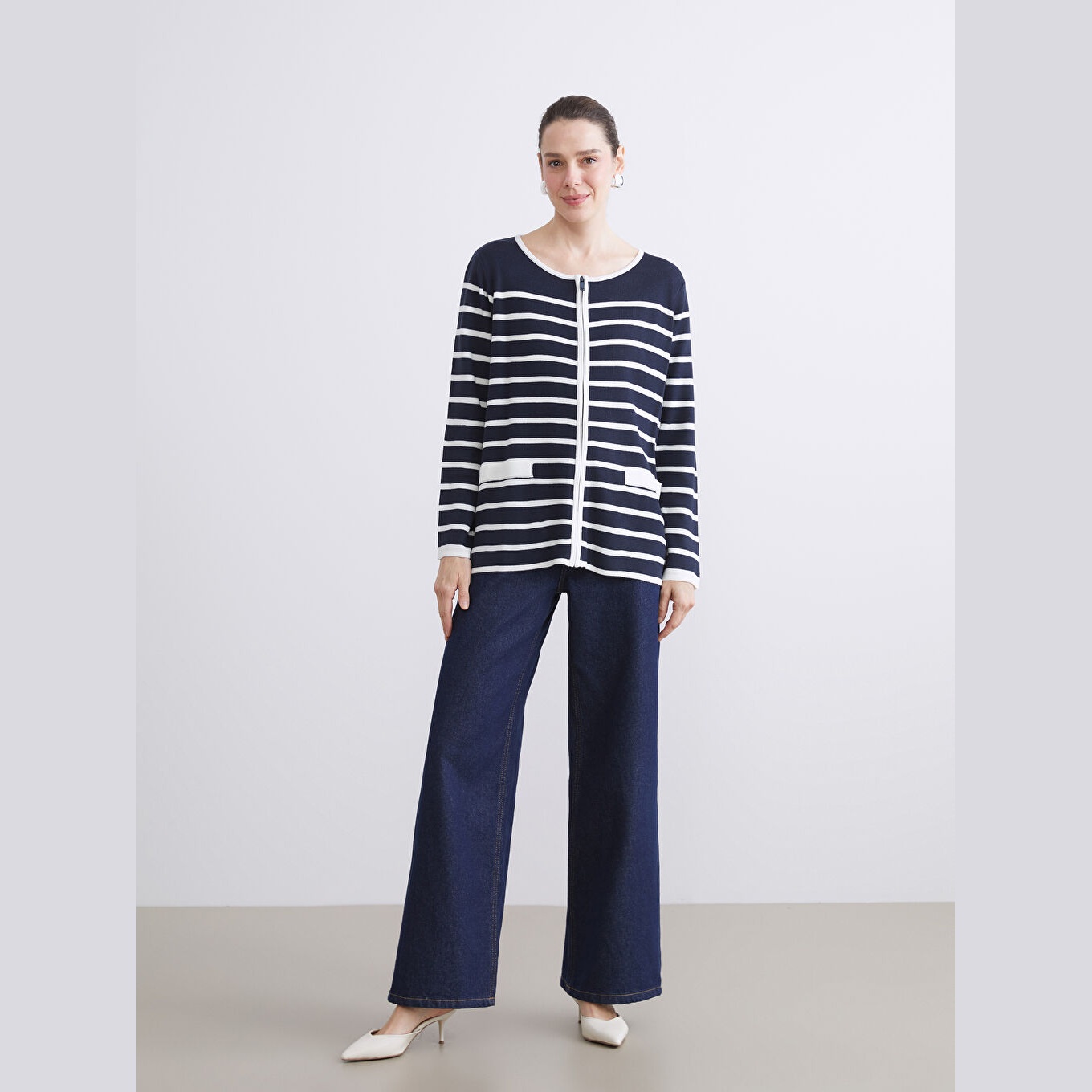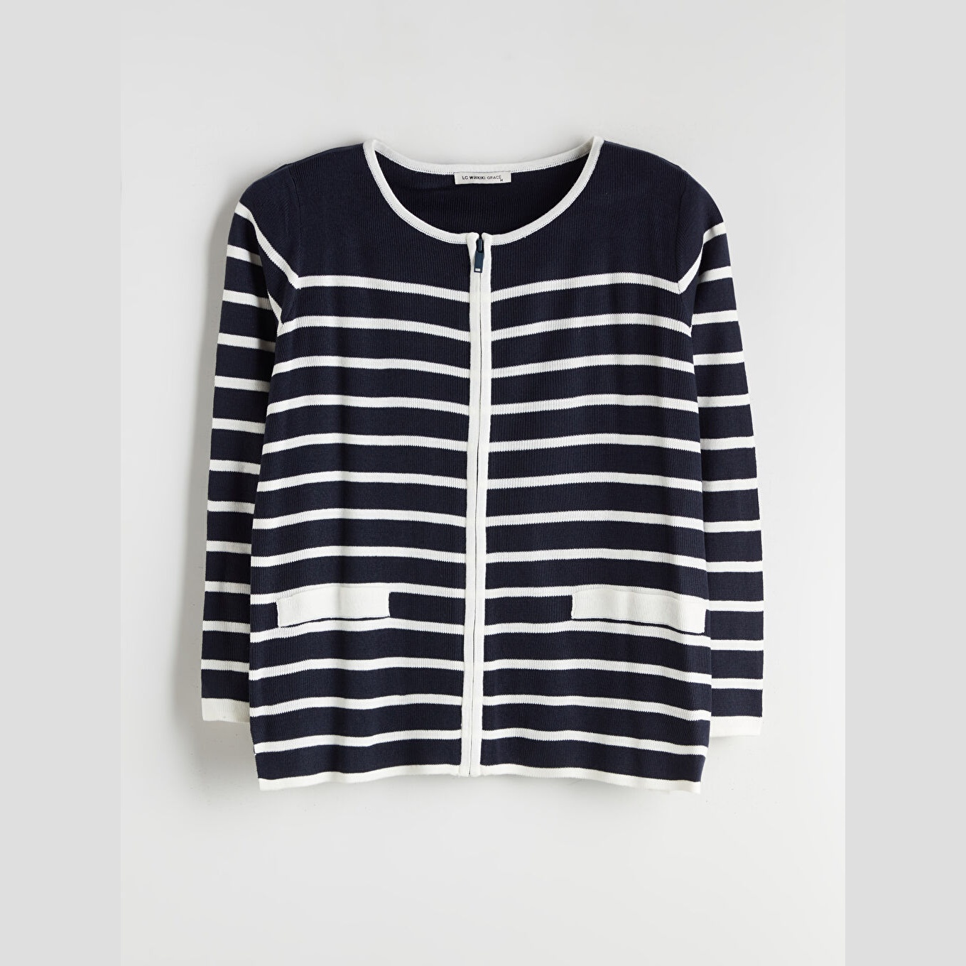 كارديغان نسائي بياقة دائرية بنقشة خطوط من LCW Grace – كحلي (قصة Standart & Regular، خامة Triko متوسطة السماكة، تصميم Çizgili، ضمن مجموعة Büyük Beden)