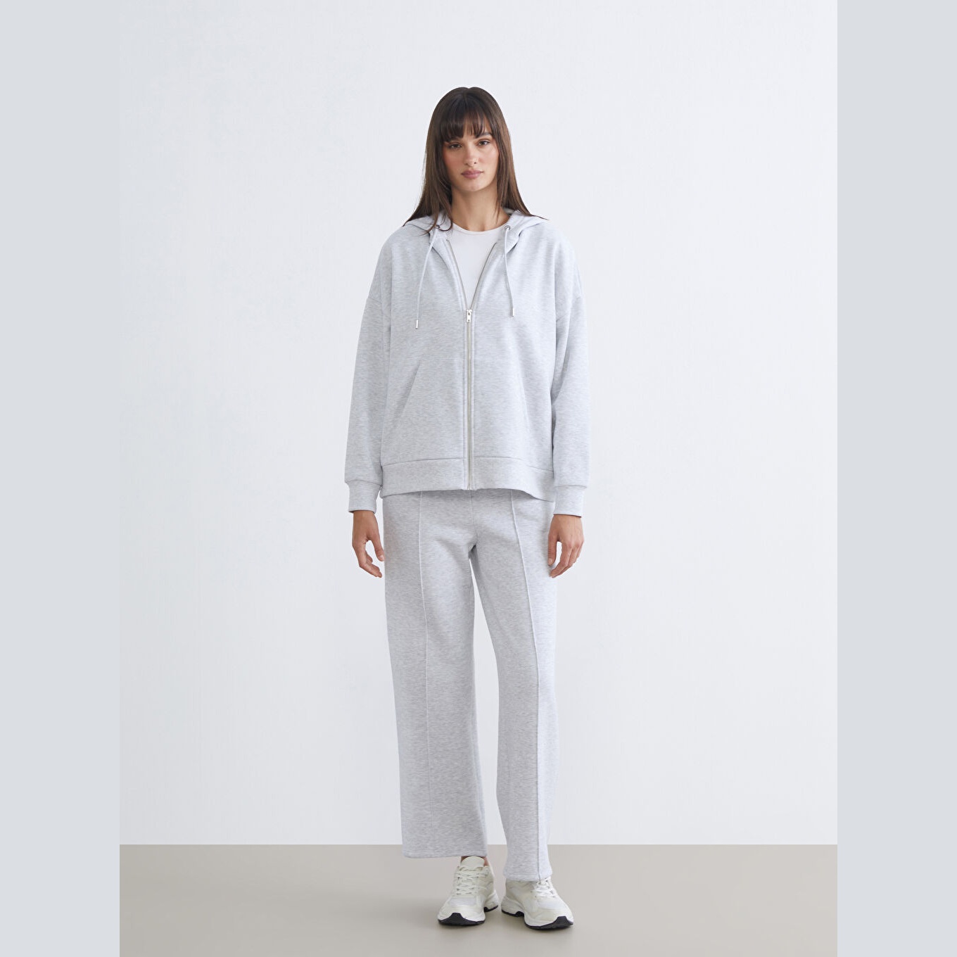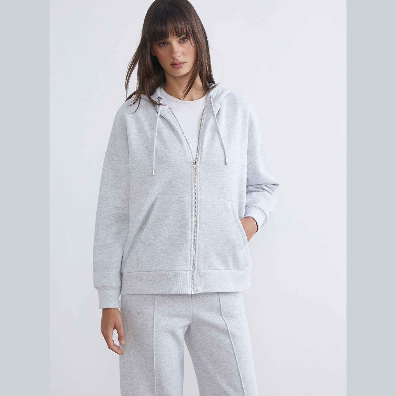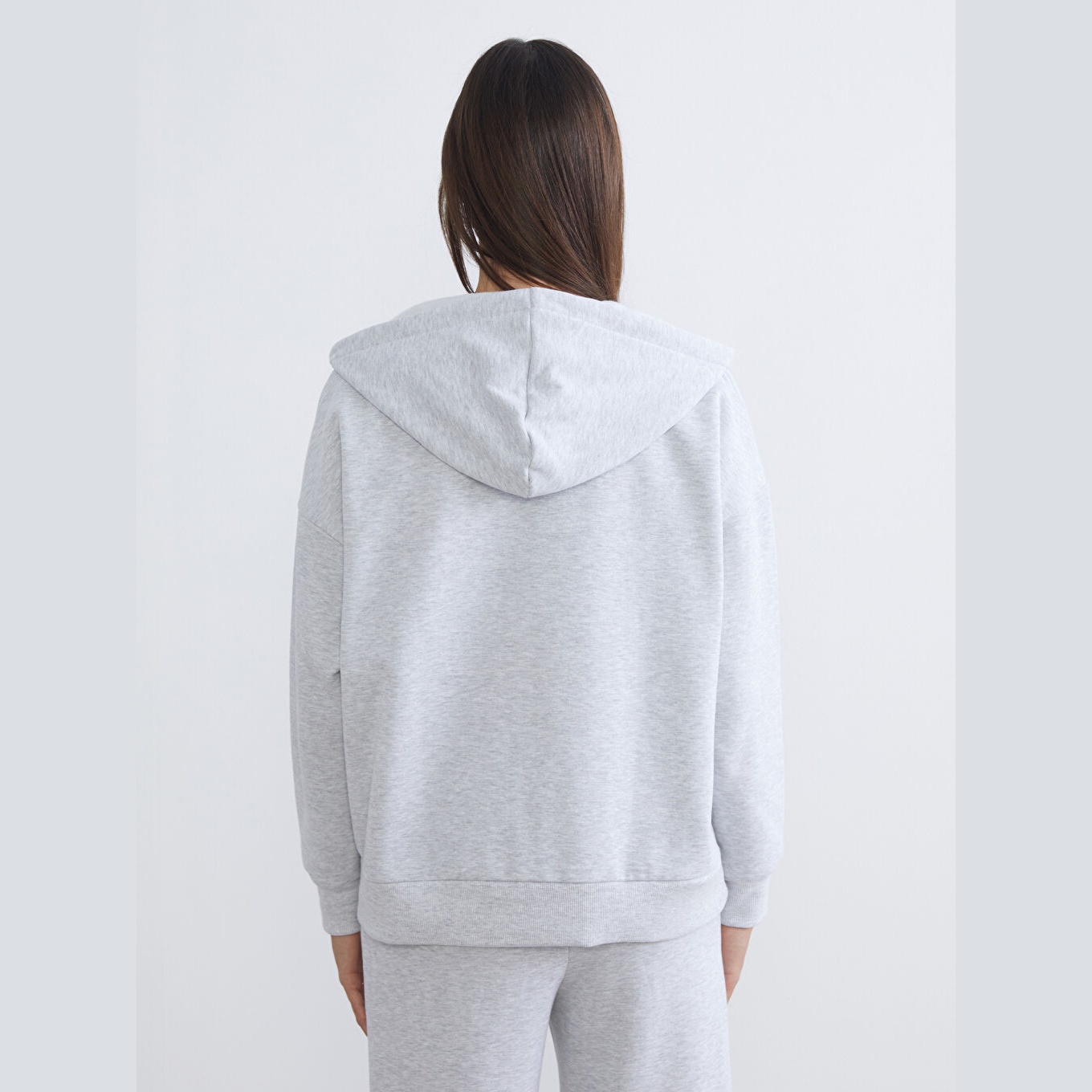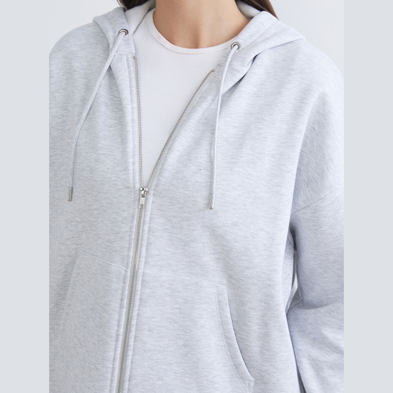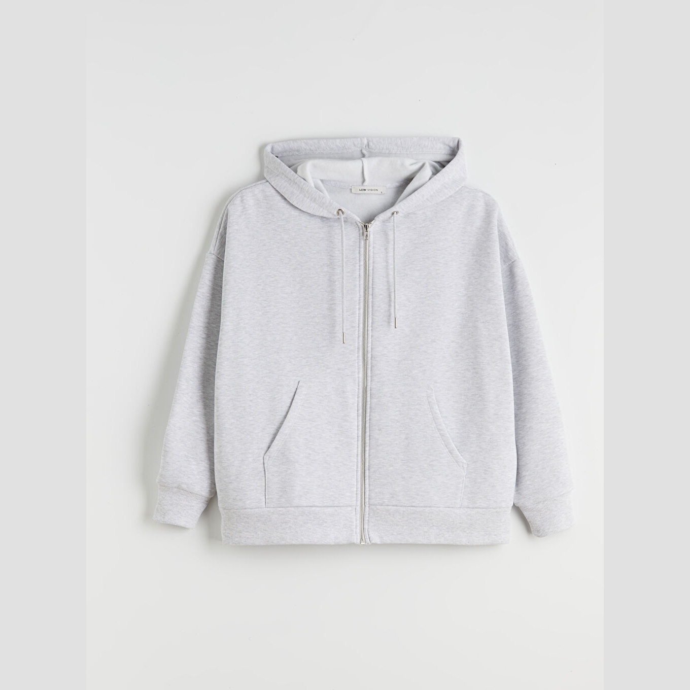 سويت شيرت نسائي بسحاب وياقة بقبعة من LCW Vision – رمادي (قصة Oversize، خامة 3 İplik Şardonlu سميكة، تصميم سادة، ضمن مجموعة Büyük Beden)