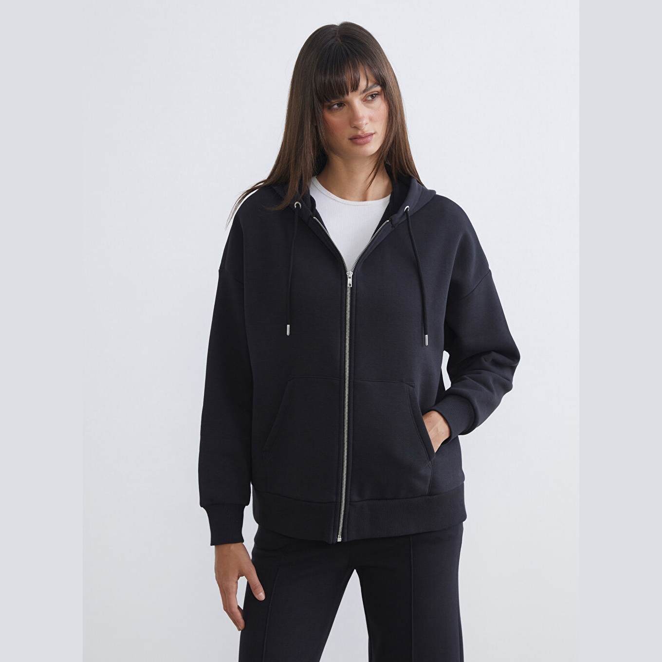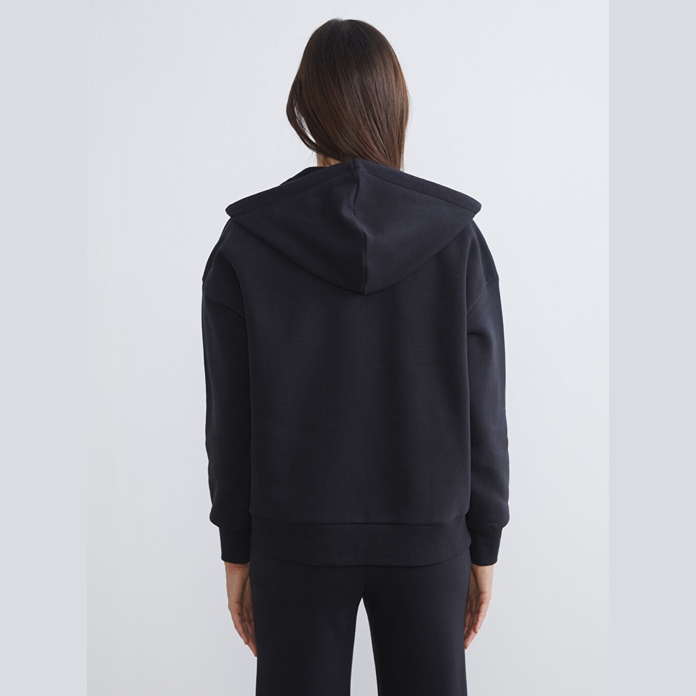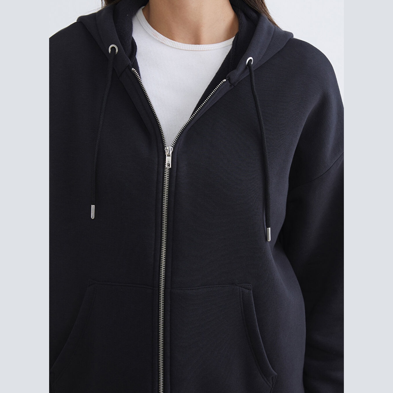سويت شيرت نسائي بسحاب وياقة بقبعة من LCW Vision – أسود (قصة واسعة، خامة قطنية سميكة، تصميم سادة، ضمن مجموعة المقاسات الكبيرة)