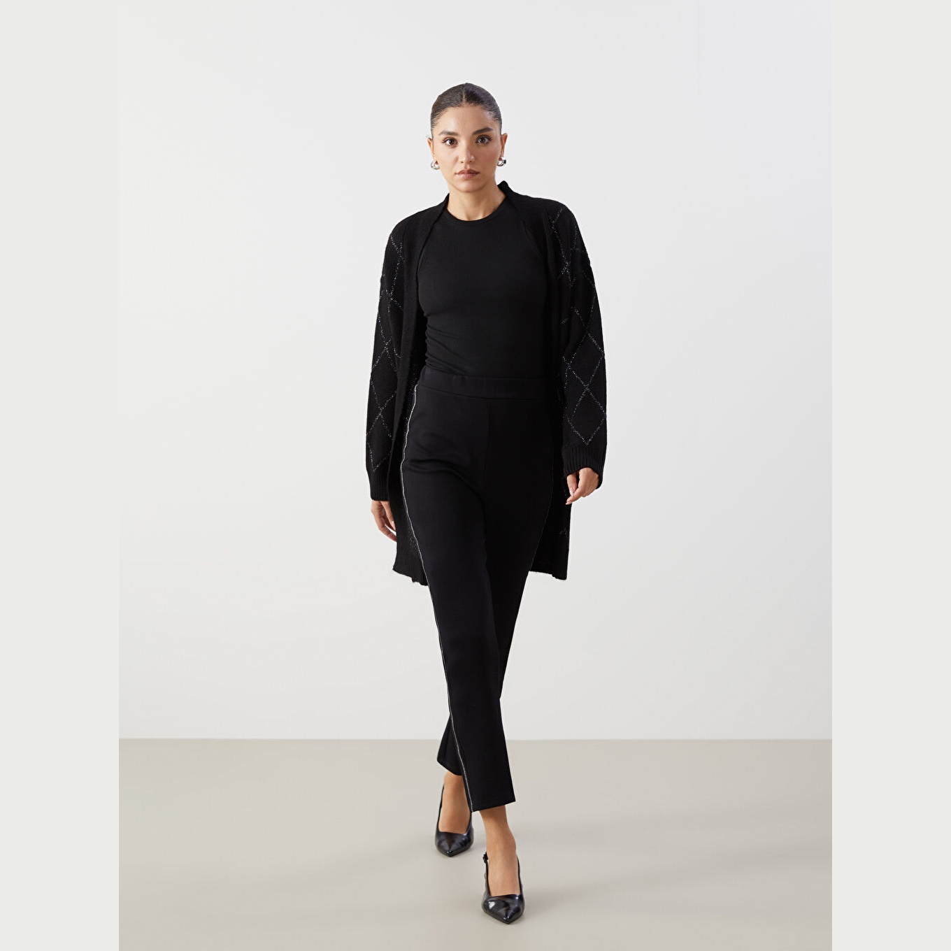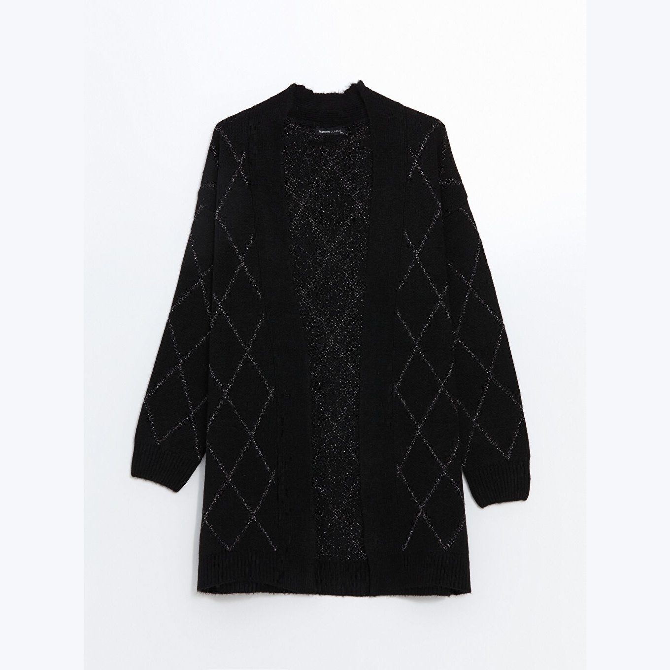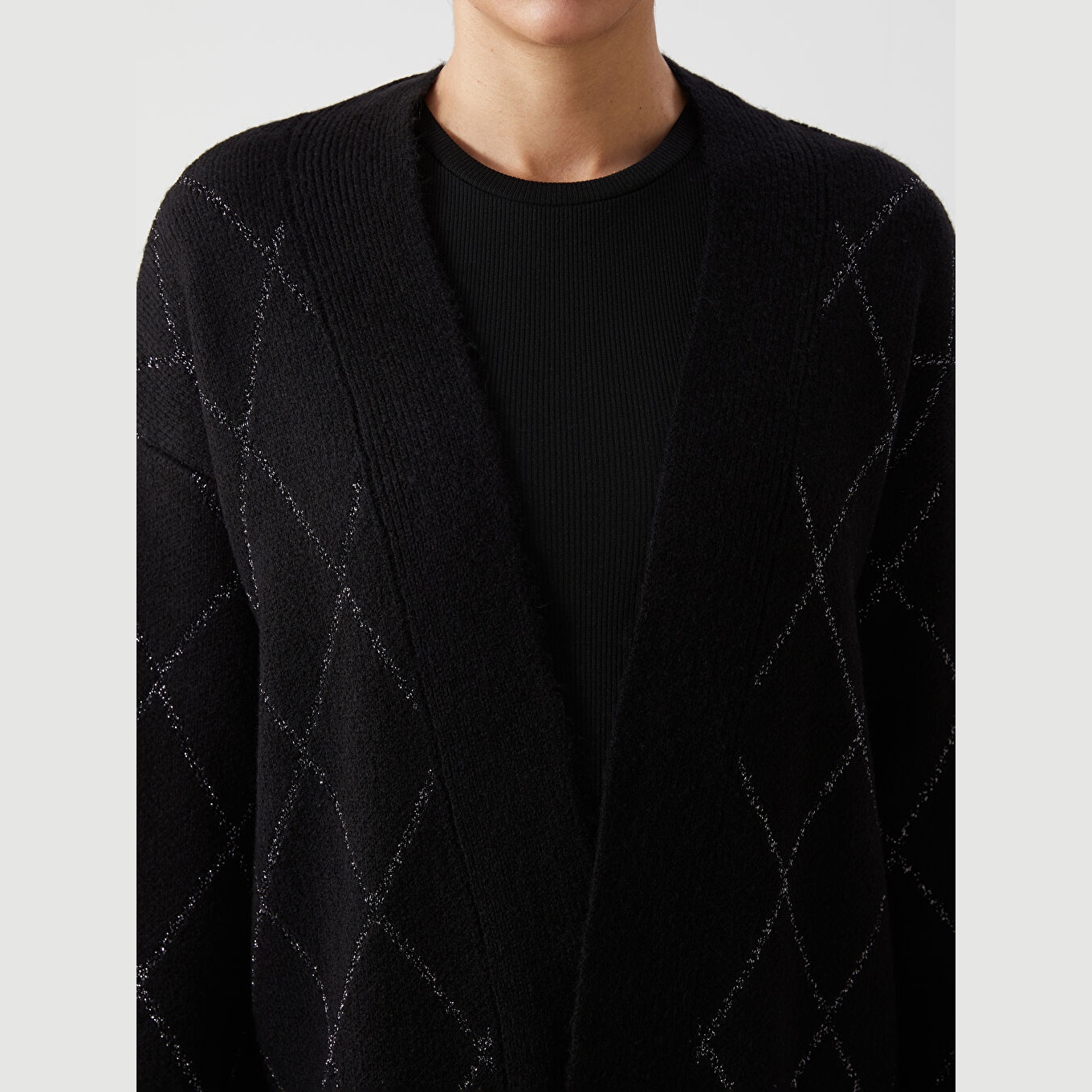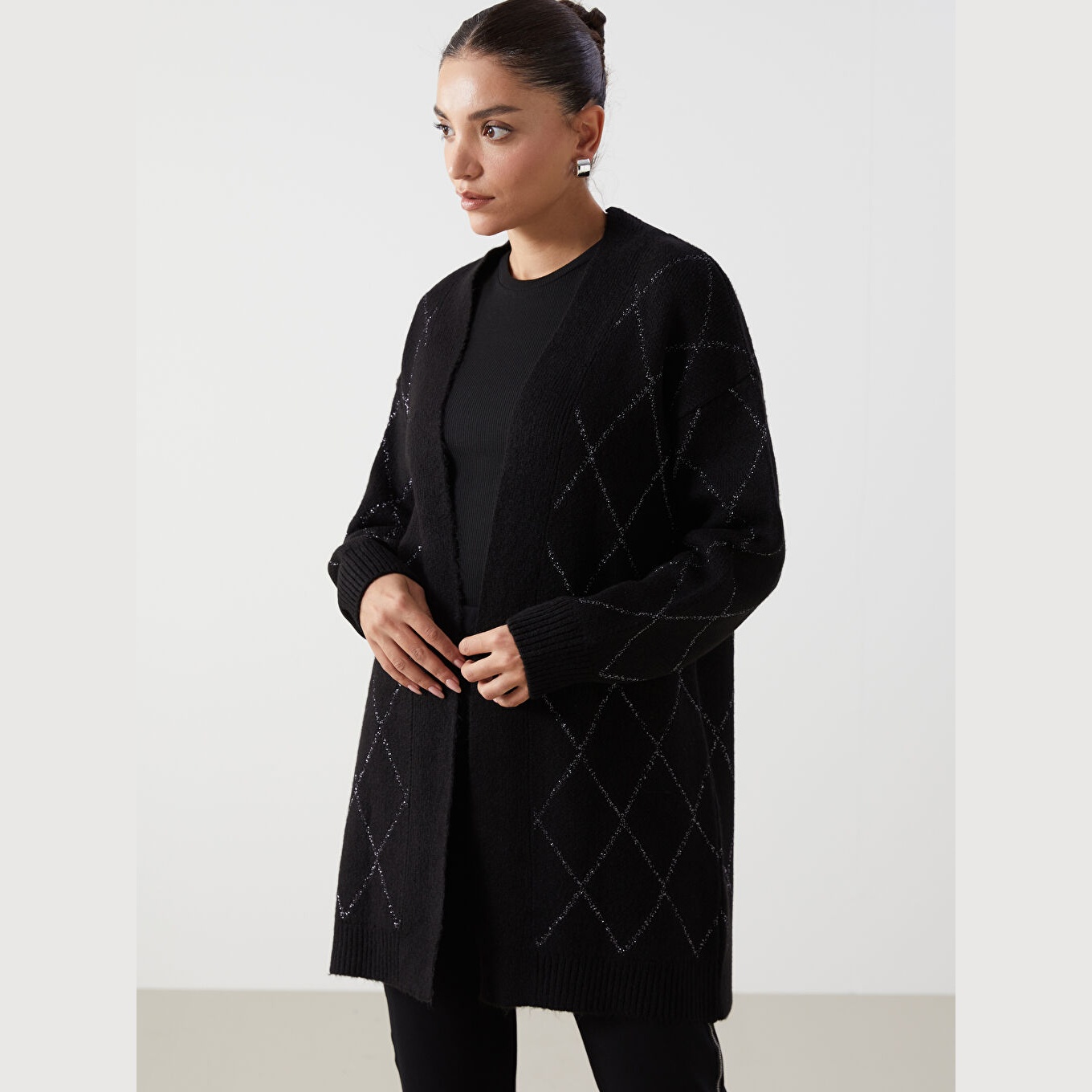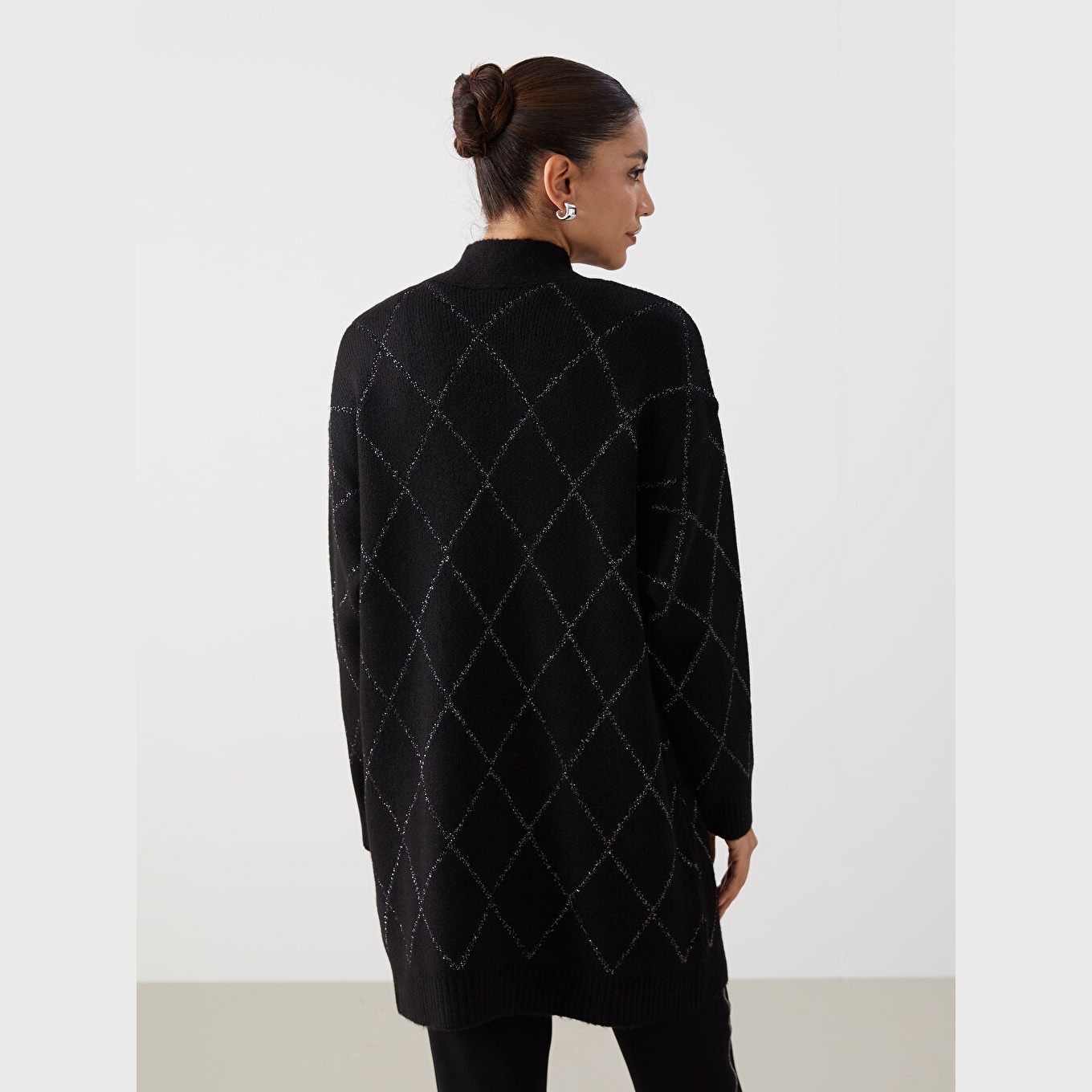 كارديغان نسائي بياقة شال ونقشة ماسية من LCW Classic – أسود (قصة واسعة، خامة تريكو سميكة، تصميم مزخرف، طول متوسط، ضمن مجموعة المقاسات الكبيرة)