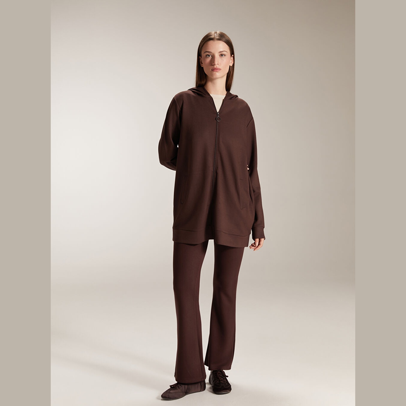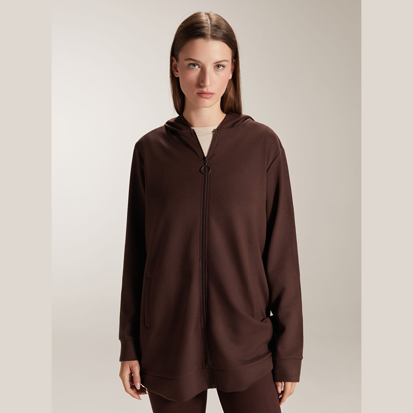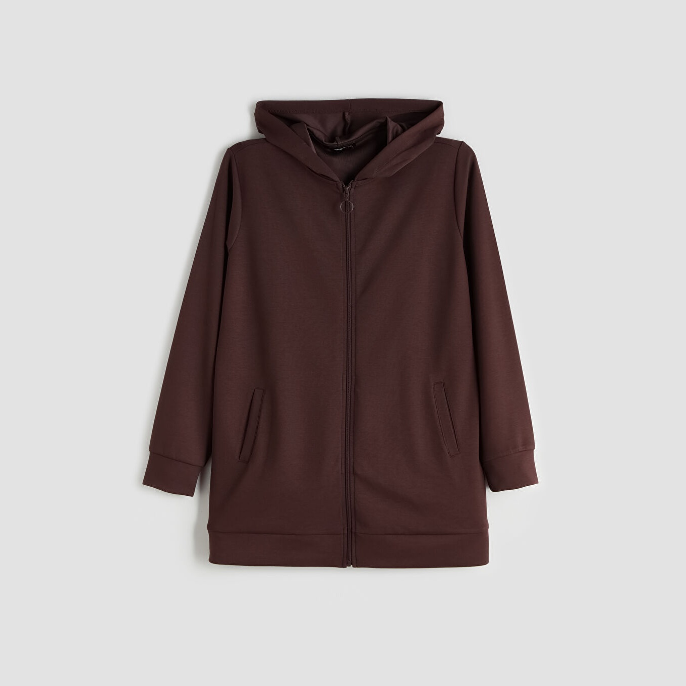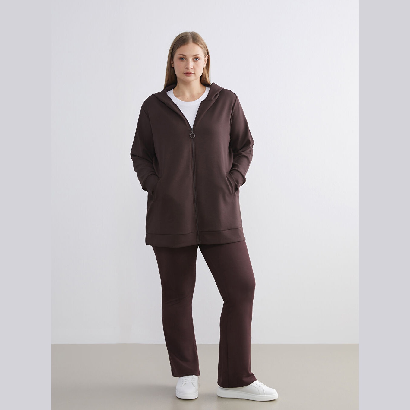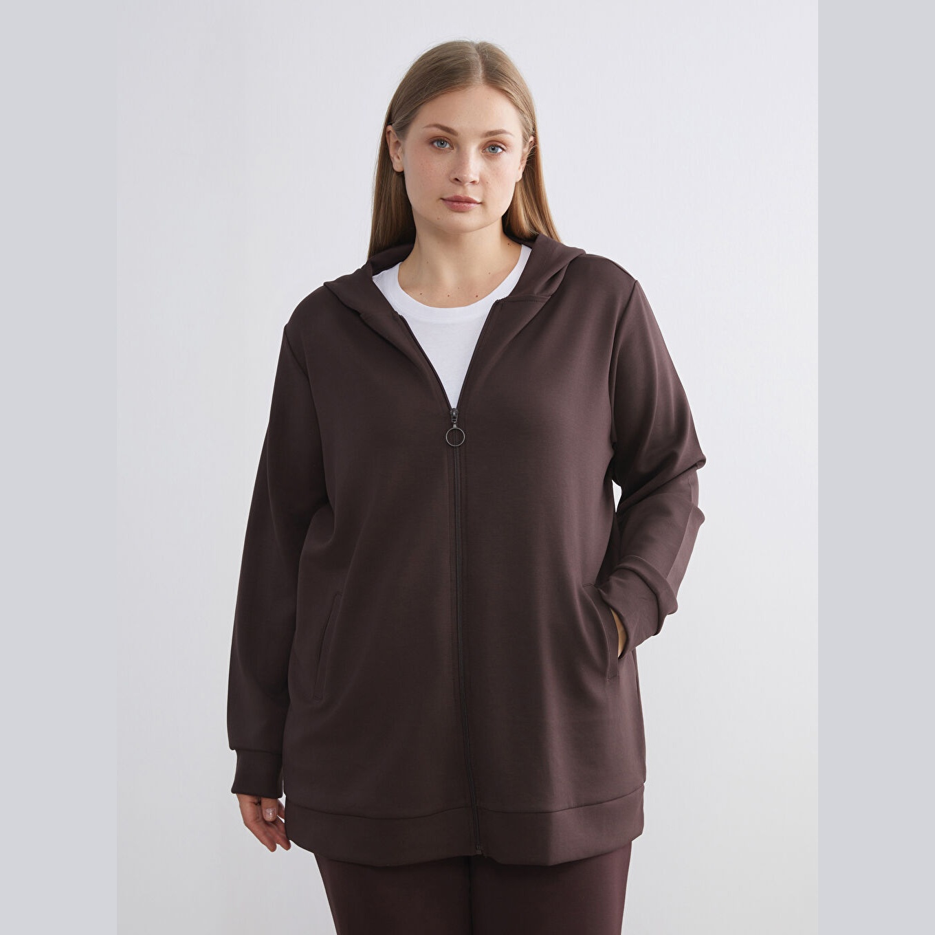 سويت شيرت نسائي بسحاب وياقة بقبعة من LCW Classic – بني (قصة واسعة، خامة مرنة متوسطة السماكة، تصميم سادة، ضمن مجموعة المقاسات الكبيرة)