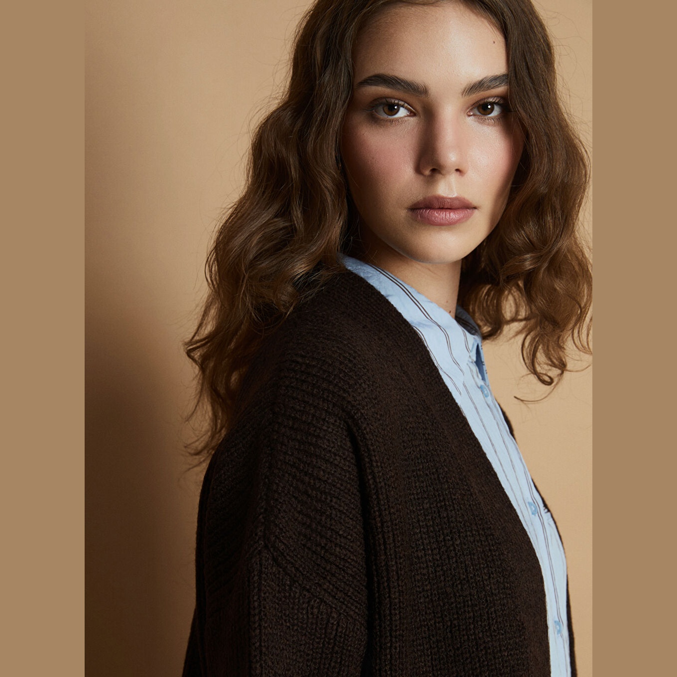 كارديغان أنيق من مجموعة LCW Modest بلون بني دافئ، مصمم بياقة شال تضيف لمسة ناعمة وانسيابية حول الرقبة، قصة واسعة تمنحك راحة مثالية ومظهرًا محتشمًا، تصميم سادة بدون نقوش، خامة تريكو متوسطة السماكة بتركيبة من %70 أكريليك و%30 بوليستر، بطول متوسط يُقاس من الكتف، مثالي للتنسيق مع بناطيل قماش أو تنانير لإطلالة خريفية أو شتوية أنيقة، ويندرج ضمن مجموعة Tesettür Giyim التي توازن بين الرقي والاحتشام.