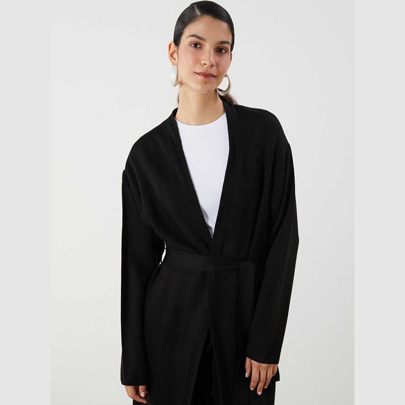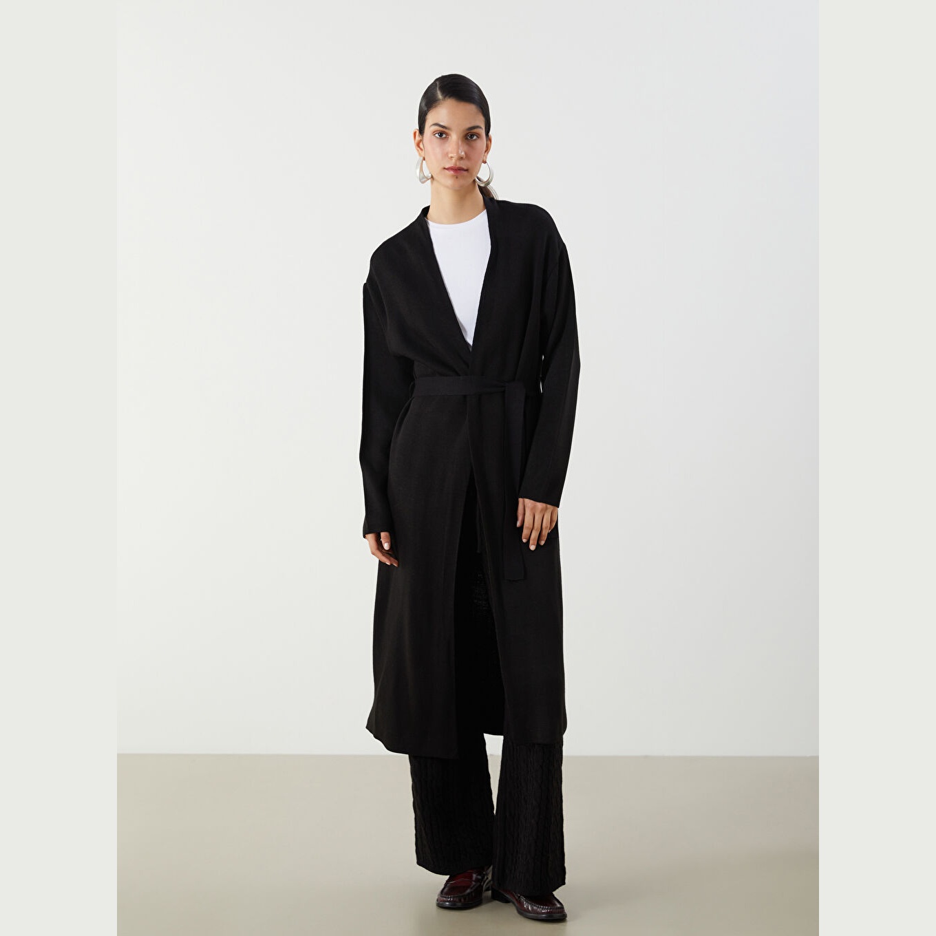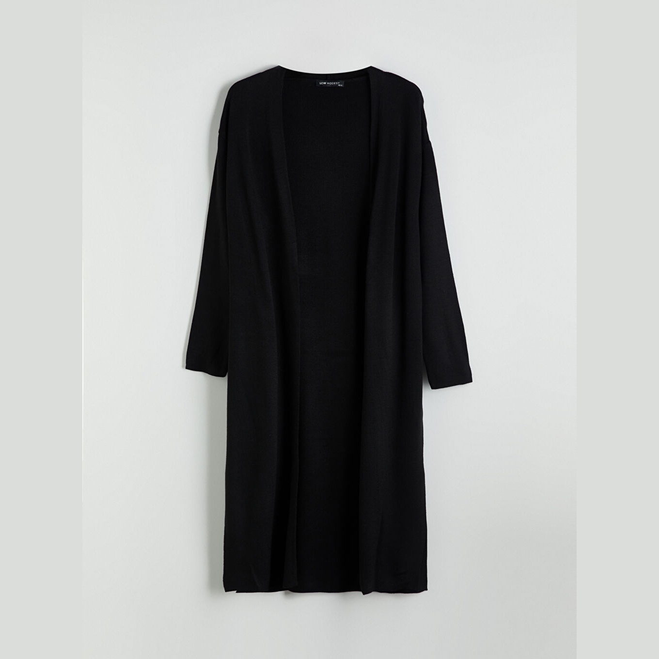 كارديغان نسائي بياقة شال من LCW Modest – أسود (قصة قياسية، خامة تريكو متوسطة السماكة، تصميم سادة، طول طويل، ضمن مجموعة المحتشمات)