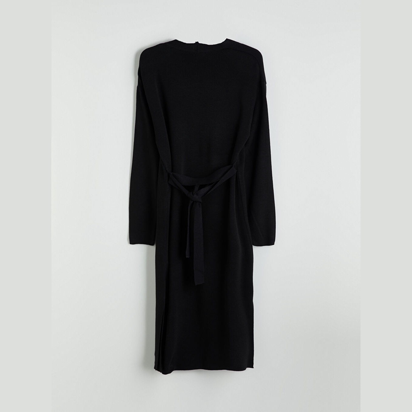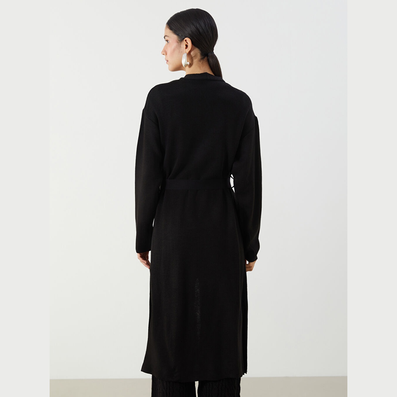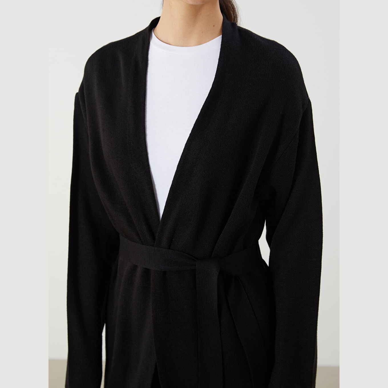 كارديغان نسائي بياقة شال من LCW Modest – أسود (قصة قياسية، خامة تريكو متوسطة السماكة، تصميم سادة، طول طويل، ضمن مجموعة المحتشمات)
