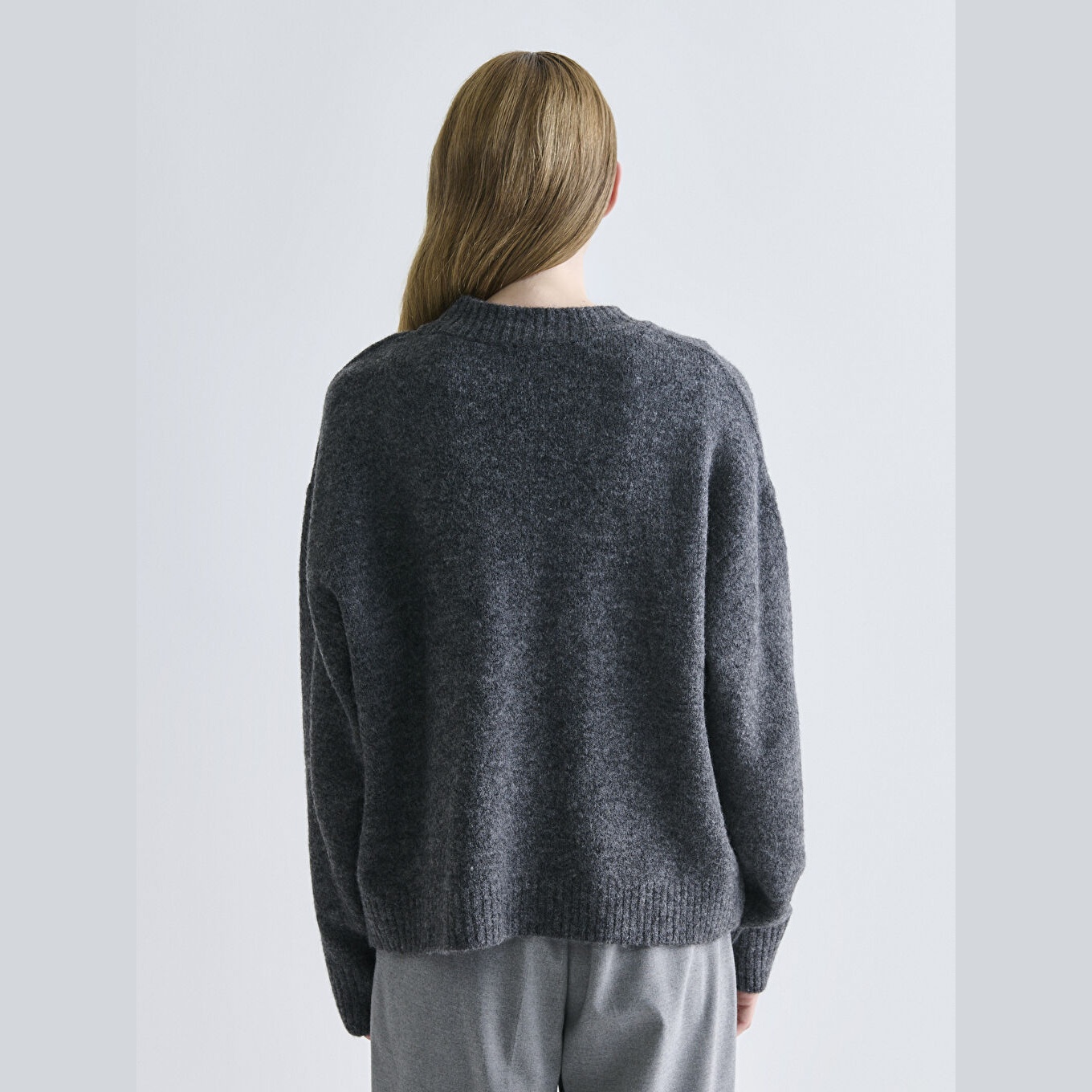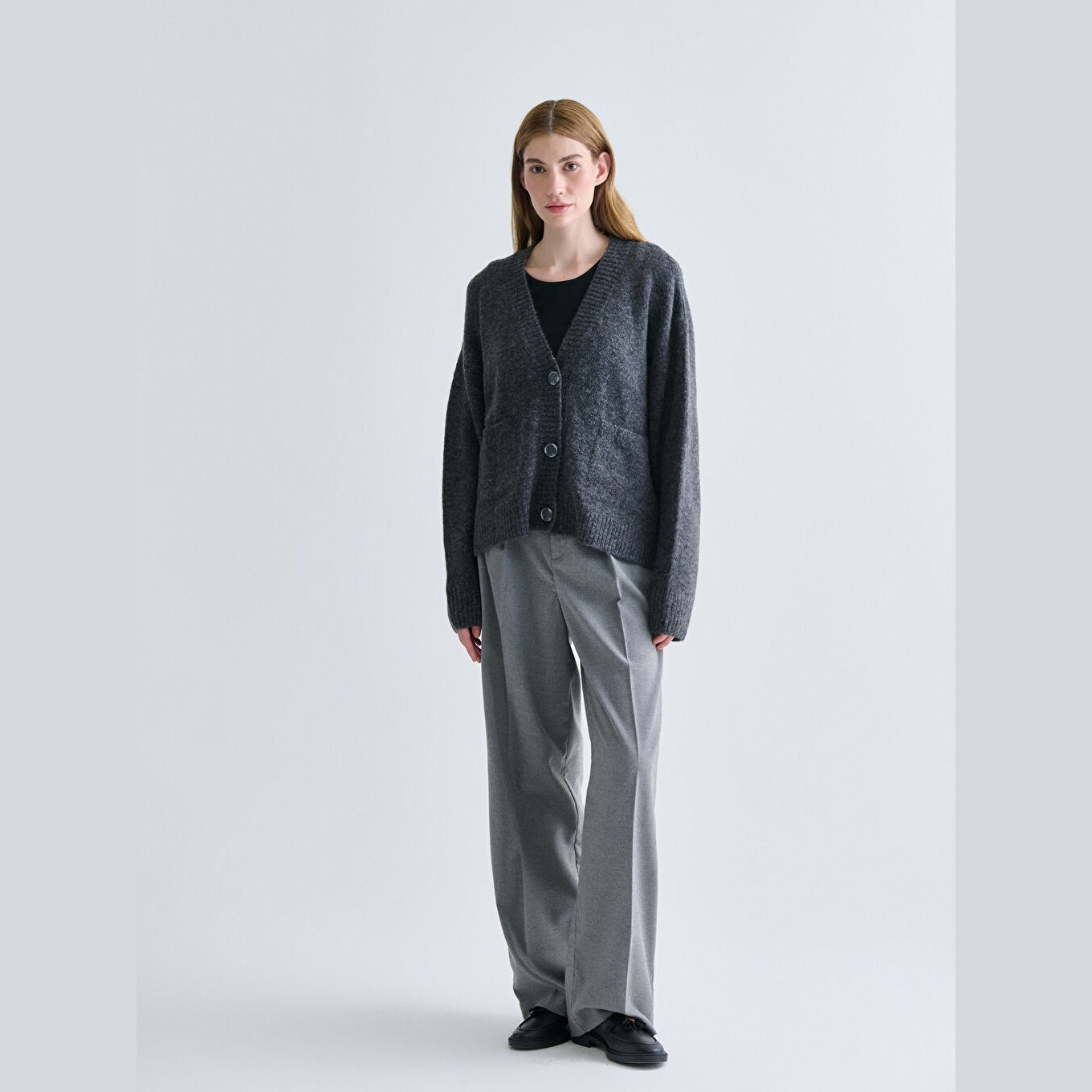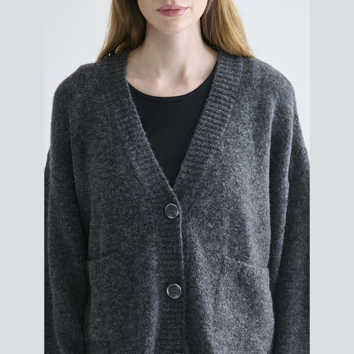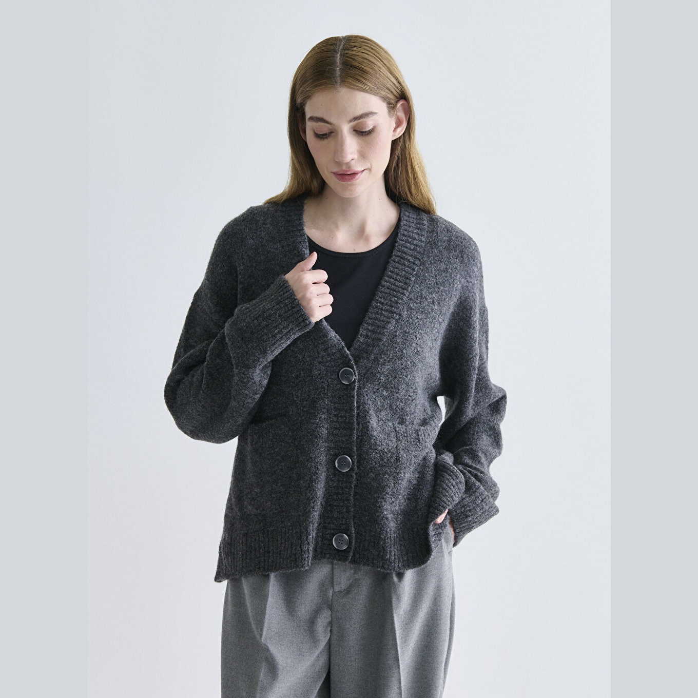 كارديغان نسائي بياقة V وأزرار أمامية من LCW Classic – أنثراسيت (قصة واسعة، خامة تريكو دافئة، تصميم سادة، ضمن مجموعة المقاسات الكبيرة)