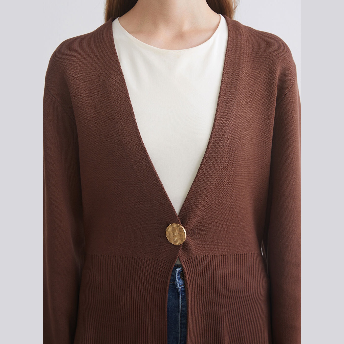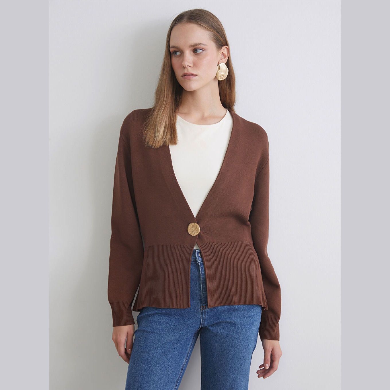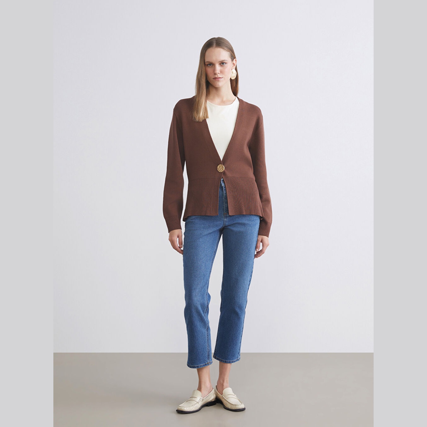 كارديغان نسائي بياقة V وأزرار أمامية من LCW Classic – بني (قصة ضيقة، خامة تريكو ناعمة، تصميم سادة أنيق)