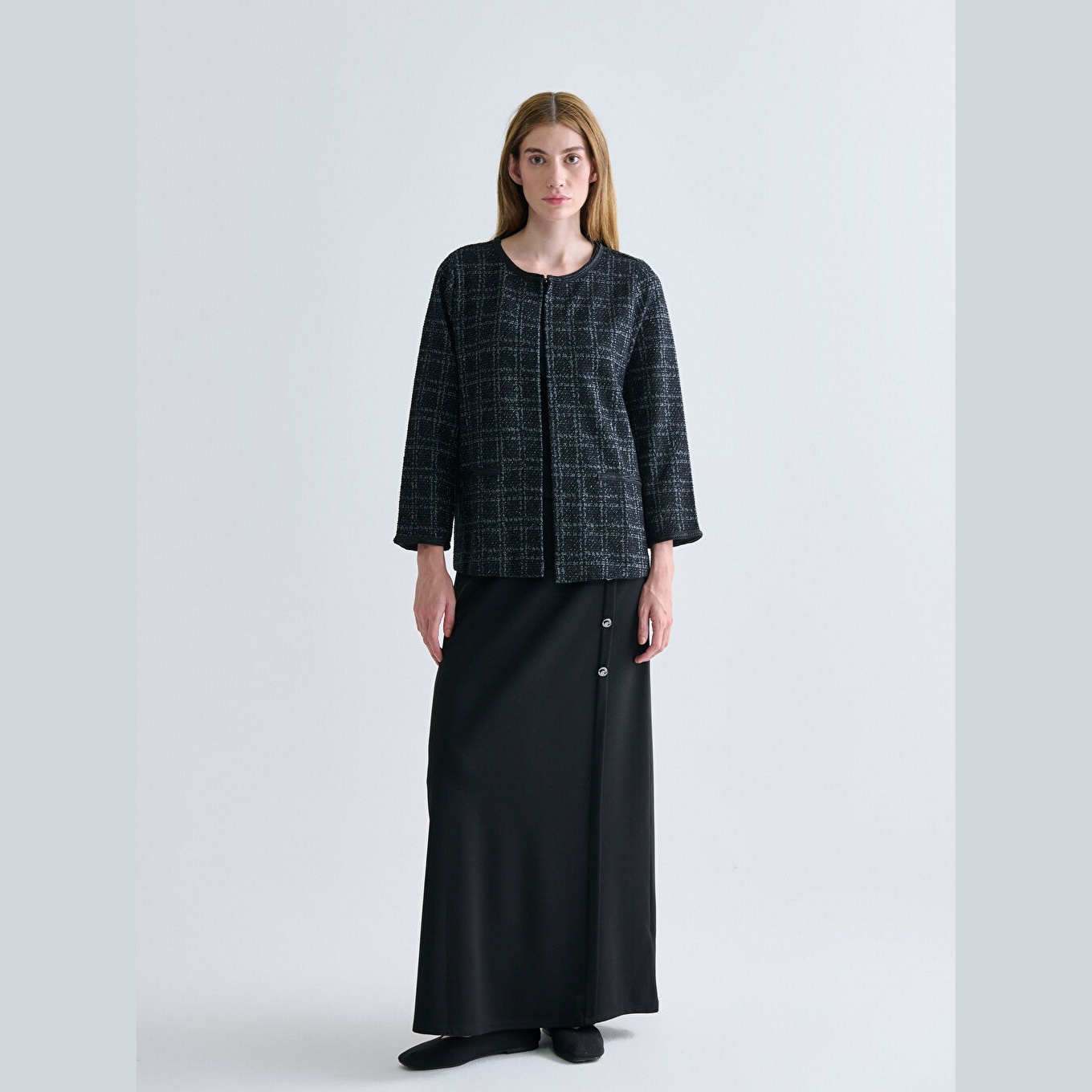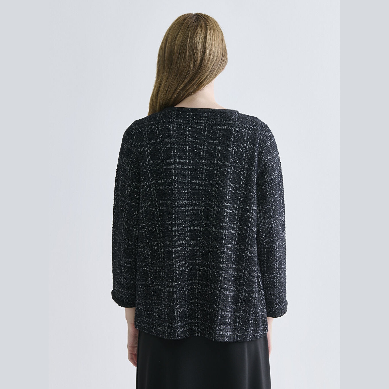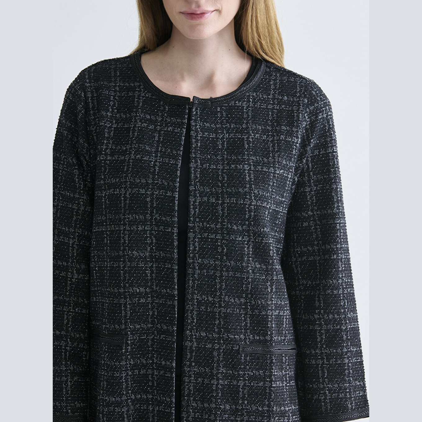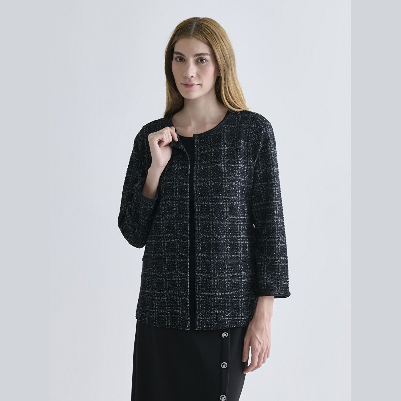 كارديغان نسائي بياقة دائرية بنقشة مربعات من LCW Grace – أسود (قصة واسعة، خامة جاكار سميكة، تصميم إكرو كلاسيكي، ضمن مجموعة المقاسات الكبيرة)