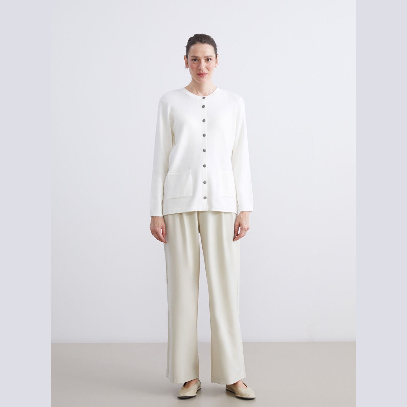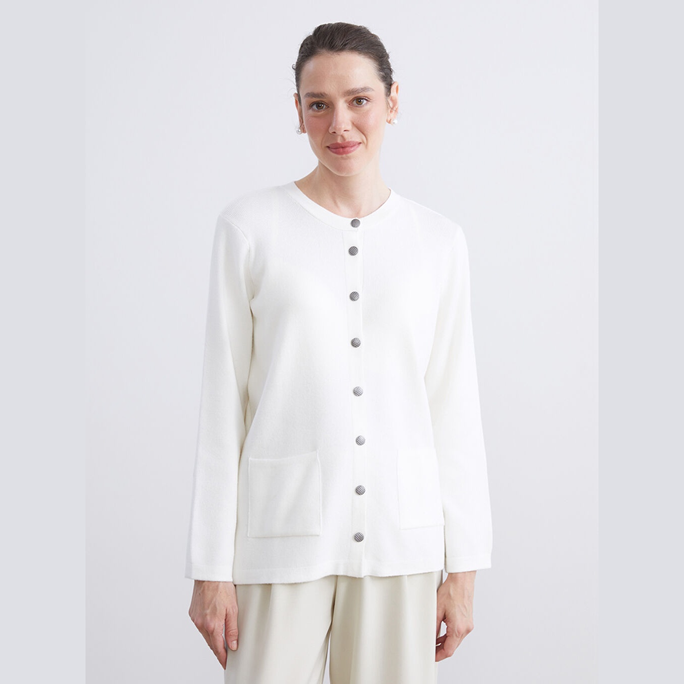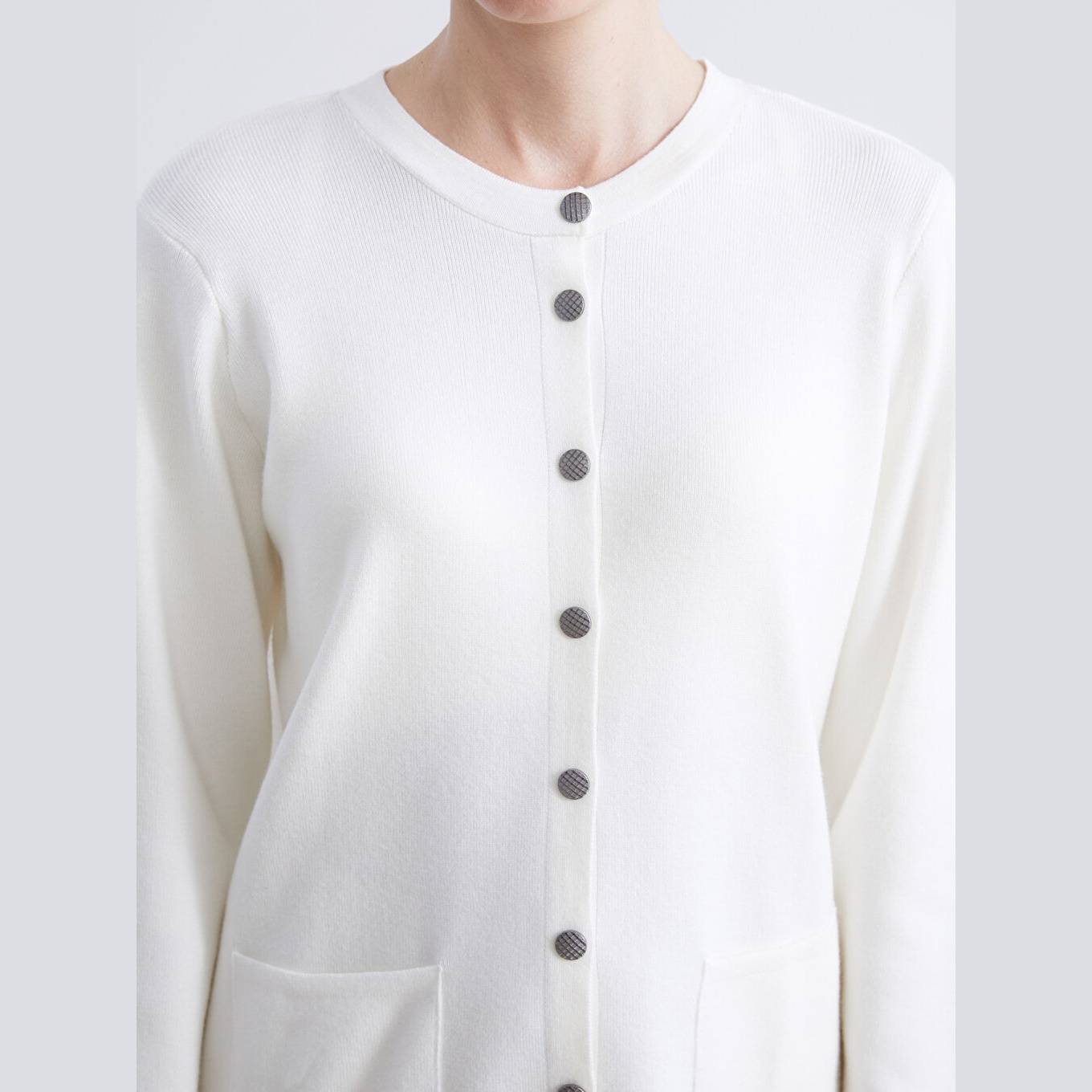 كارديغان نسائي بياقة دائرية من LCW Grace – إكرو (قصة قياسية، خامة تريكو متوسطة السماكة، تصميم سادة بأزرار أمامية، ضمن مجموعة المقاسات الكبيرة)