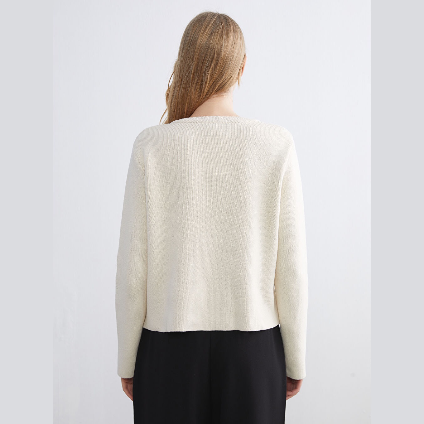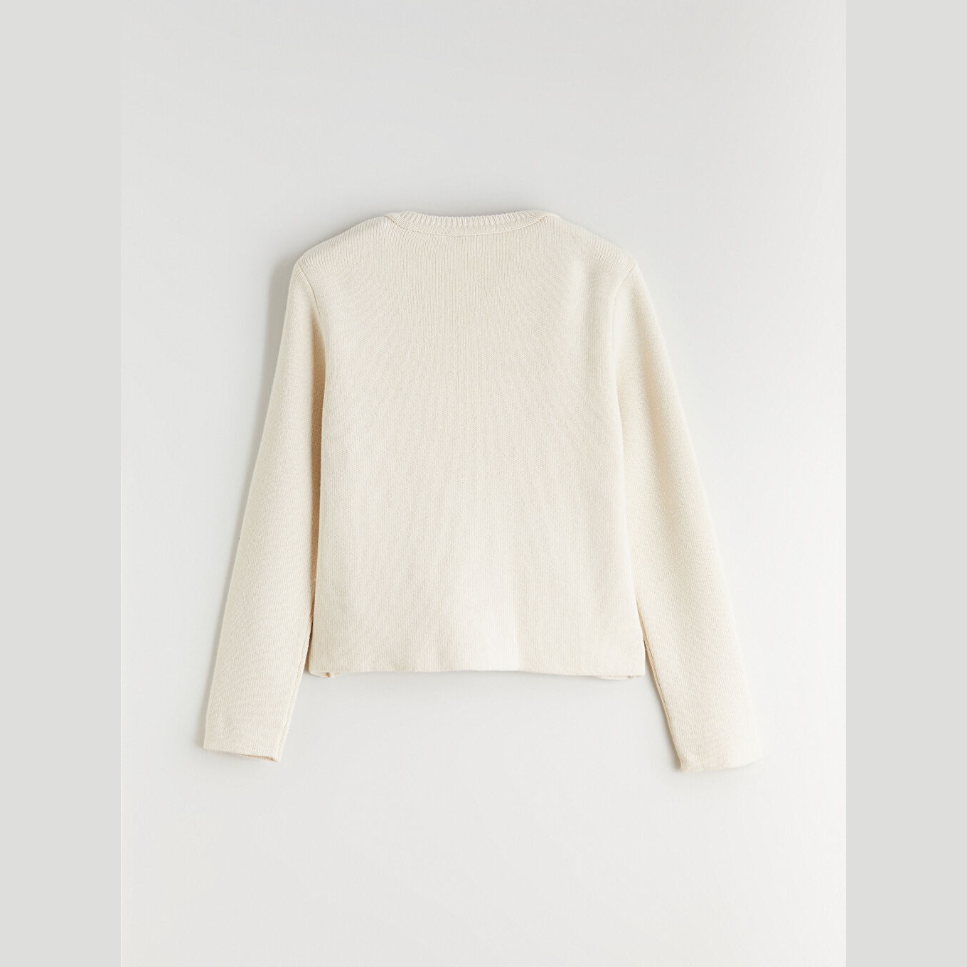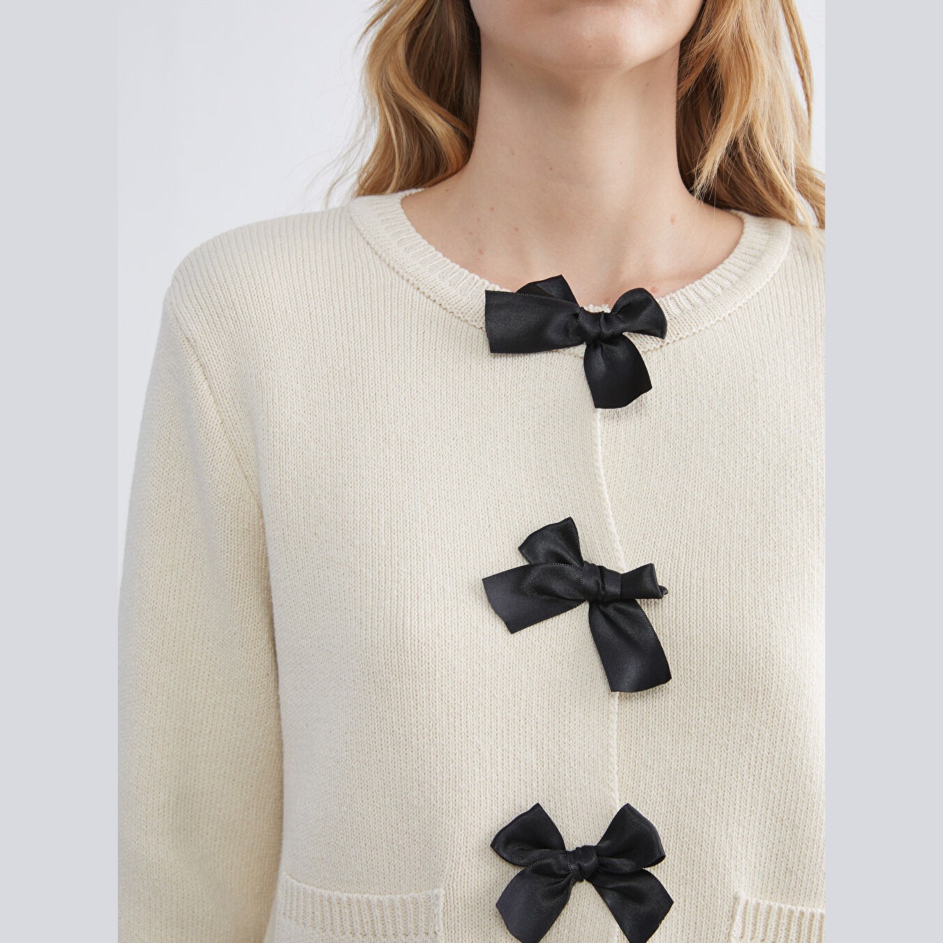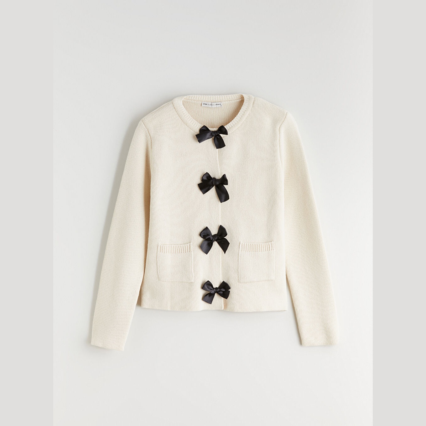 كارديغان أنثوي ناعم من مجموعة LCW Classic بلون إكرو حيادي، مصمم بياقة دائرية تمنحك مظهرًا بسيطًا ومرتبًا، مزود بربطة أمامية (فيونكة) تضيف لمسة رقيقة وعصرية، قصة ضيقة (Slim Fit) تبرز القوام، خامة تريكو متوسطة السماكة بتركيبة مريحة من %58 قطن، %29 بوليستر، %11 أكريليك، %2 بولياميد، بطول يُقاس من الكتف، مثالي للإطلالات اليومية أو المكتبية، متوفر بمقاسات من S حتى 2XL.