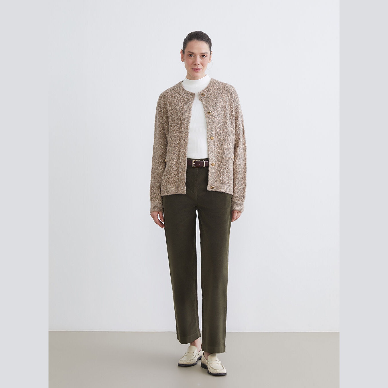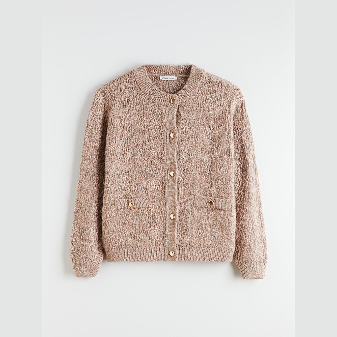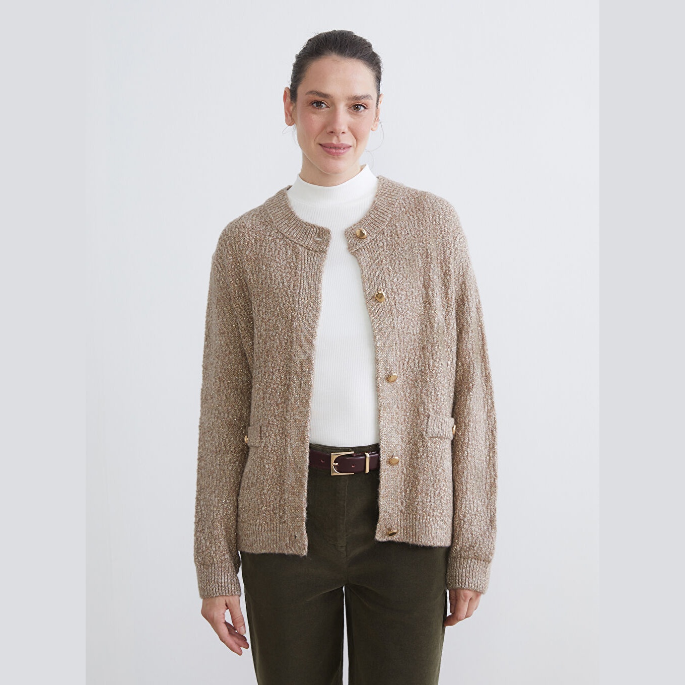 كارديغان نسائي بياقة دائرية من LCW Classic – بني (قصة قياسية، خامة تريكو ناعمة بخيط معدني، تصميم سادة بأزرار أمامية)