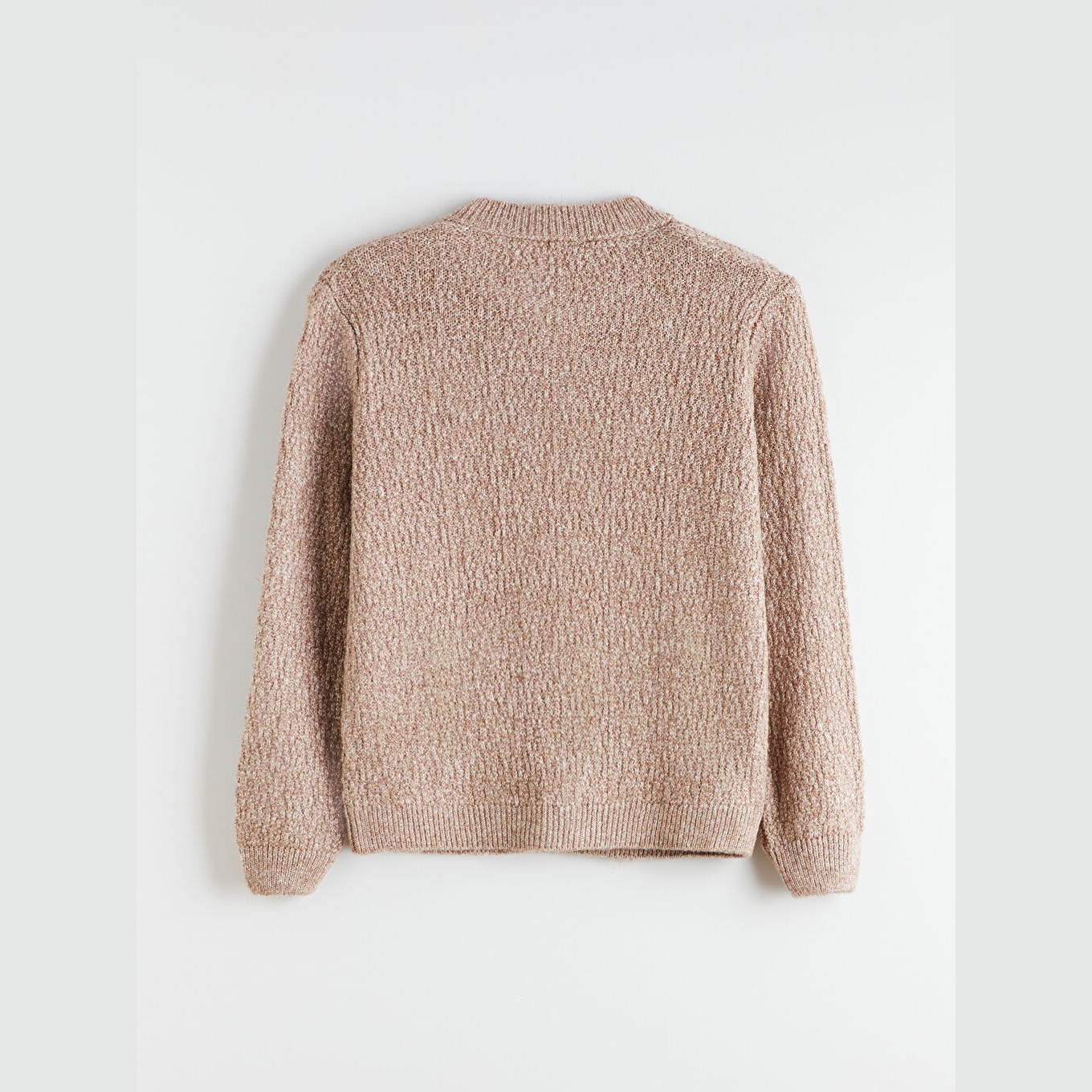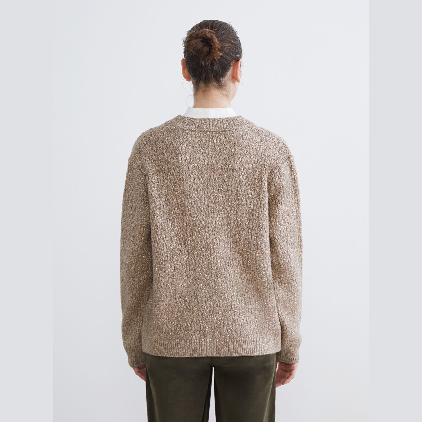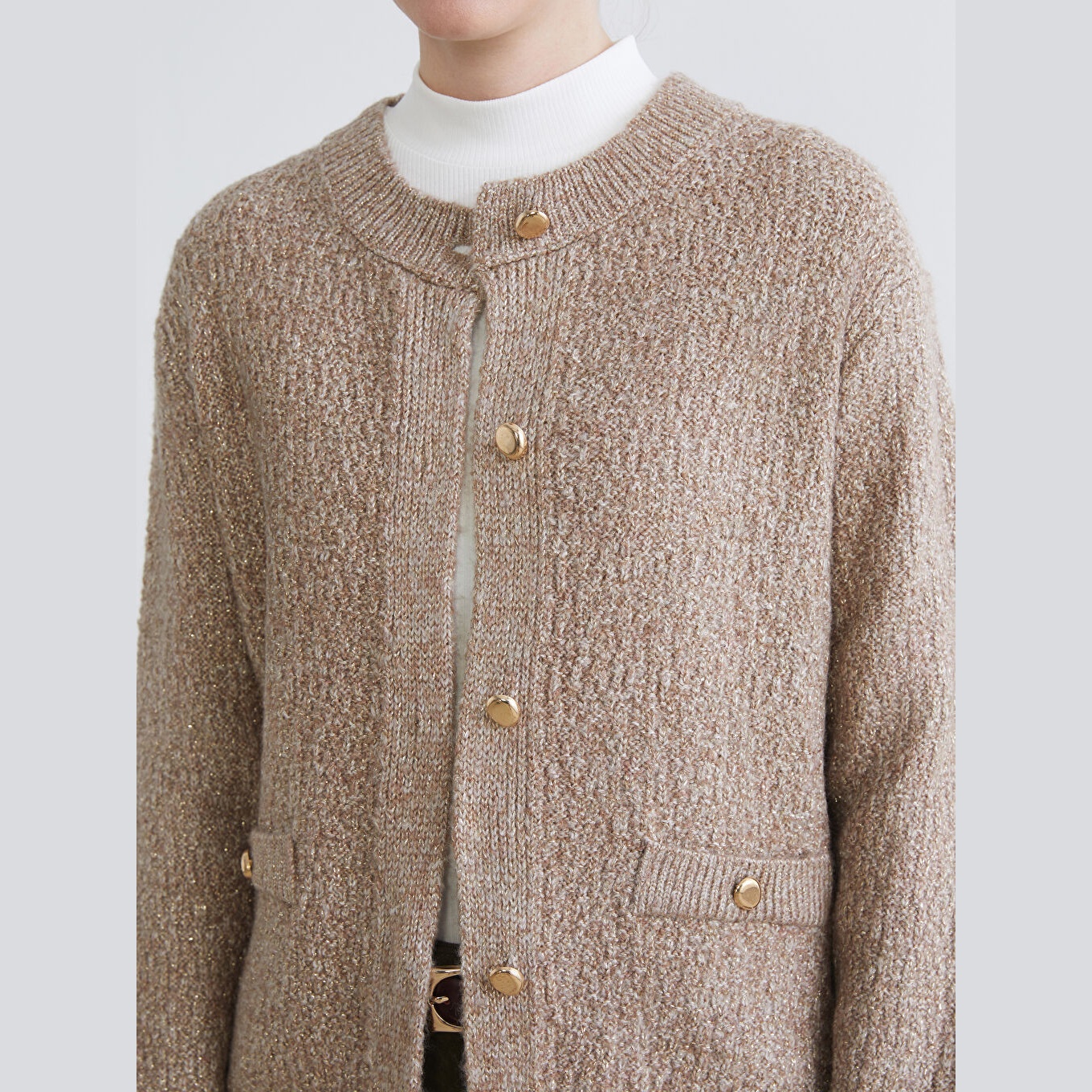 كارديغان نسائي بياقة دائرية من LCW Classic – بني (قصة قياسية، خامة تريكو ناعمة بخيط معدني، تصميم سادة بأزرار أمامية)
