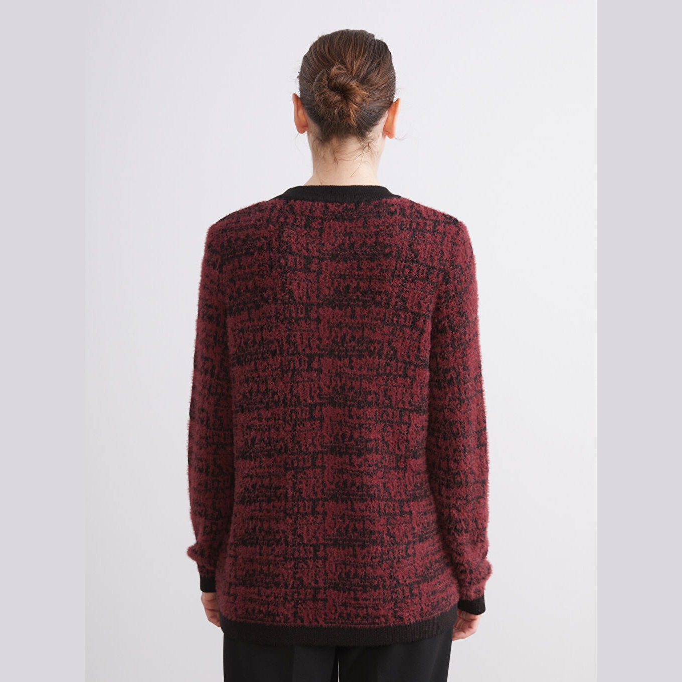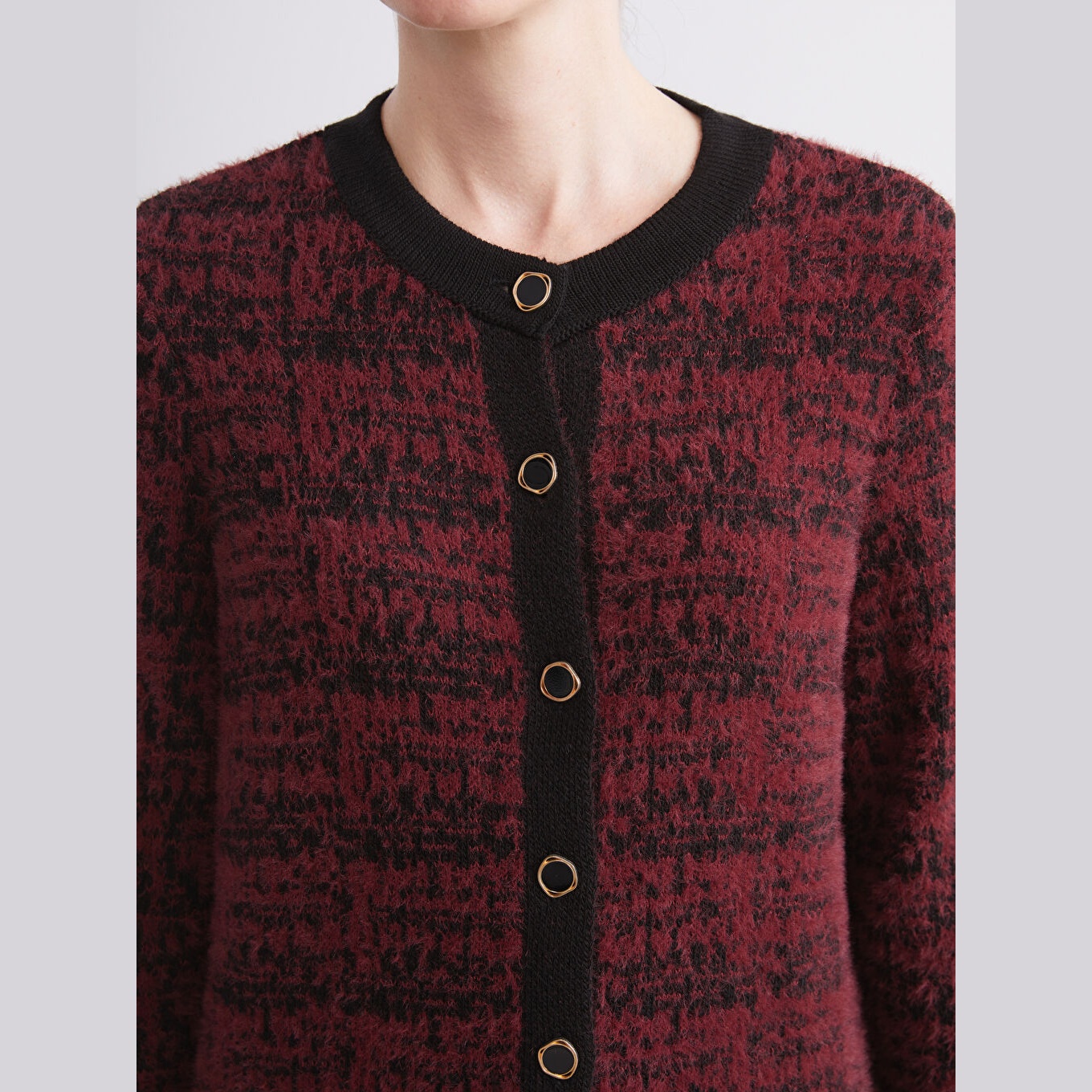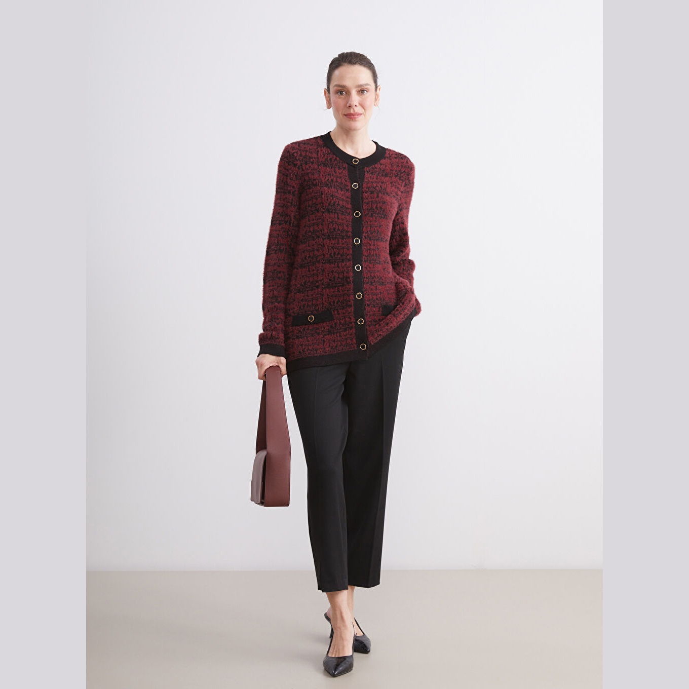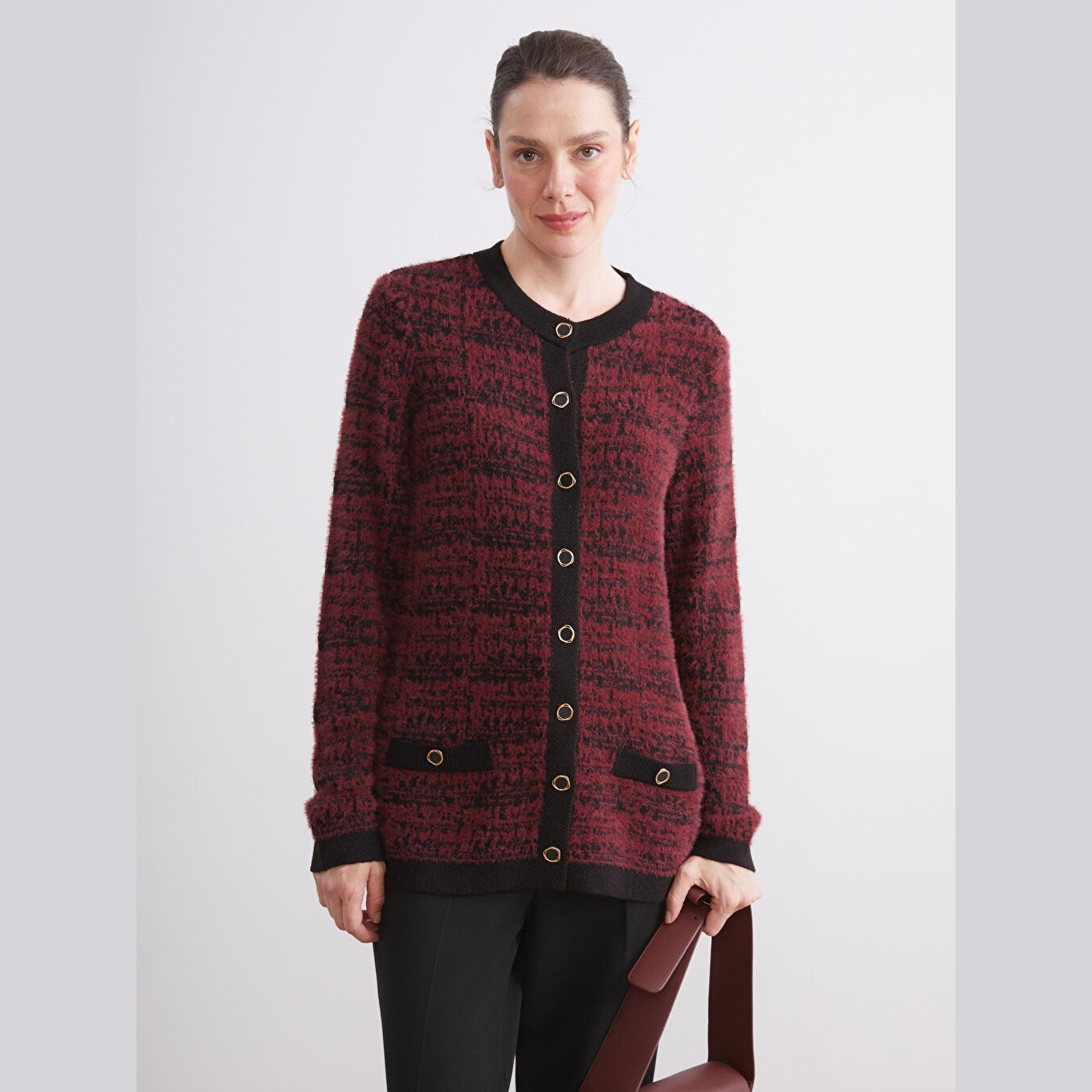 كارديغان نسائي بياقة دائرية بنقشة من LCW Grace – بوردو (قصة قياسية، خامة تريكو سميكة، تصميم مزخرف بأزرار أمامية، ضمن مجموعة المقاسات الكبيرة)