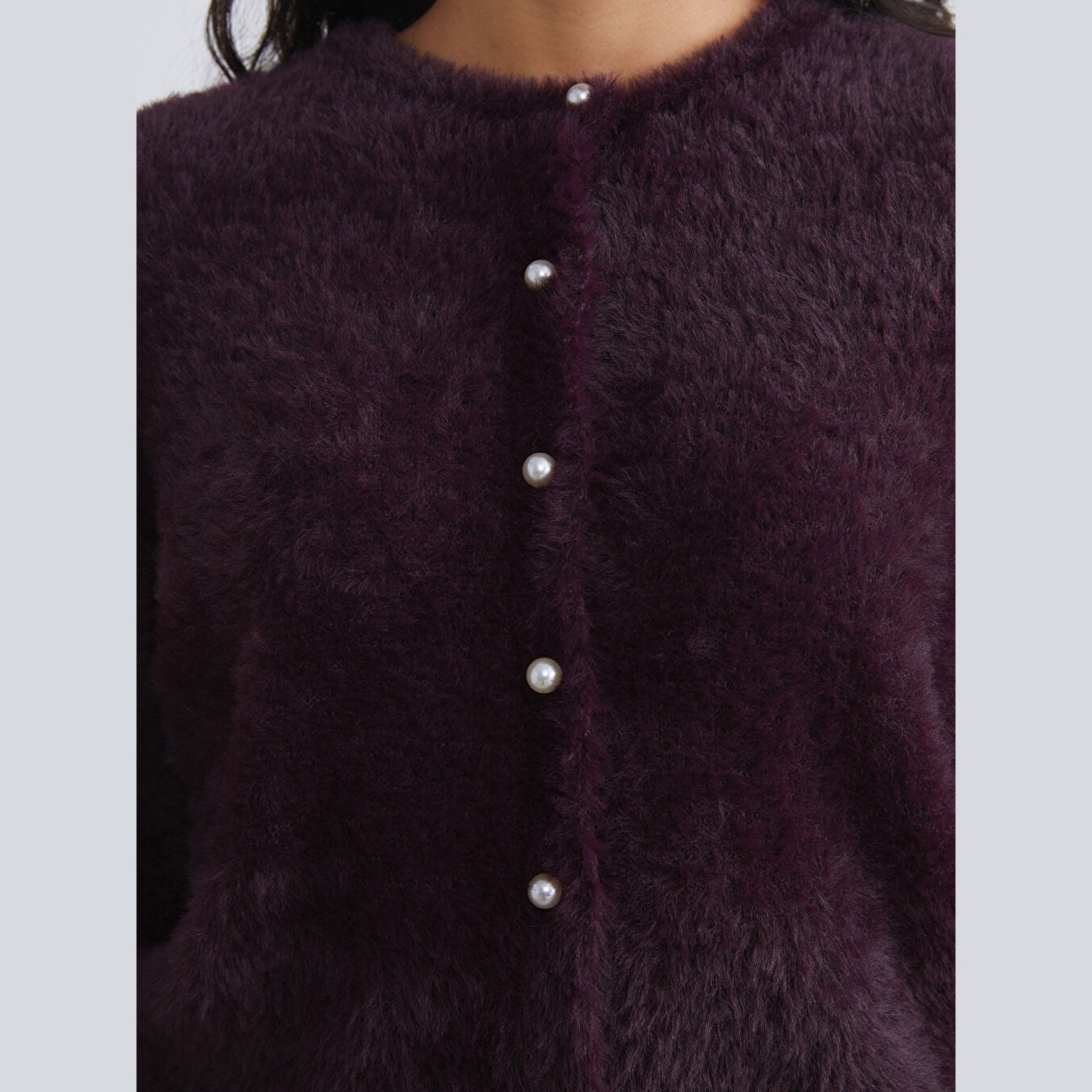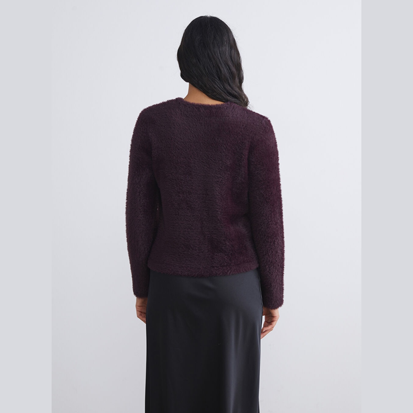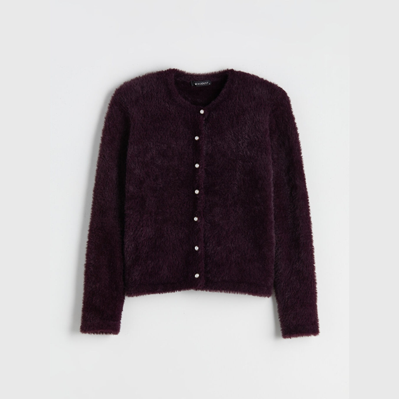 كارديغان نسائي بياقة دائرية من LCW Modest – بنفسجي غامق (قصة قياسية، خامة تريكو بيليوش سميكة، تصميم سادة قصير، ضمن مجموعة المحتشمات)