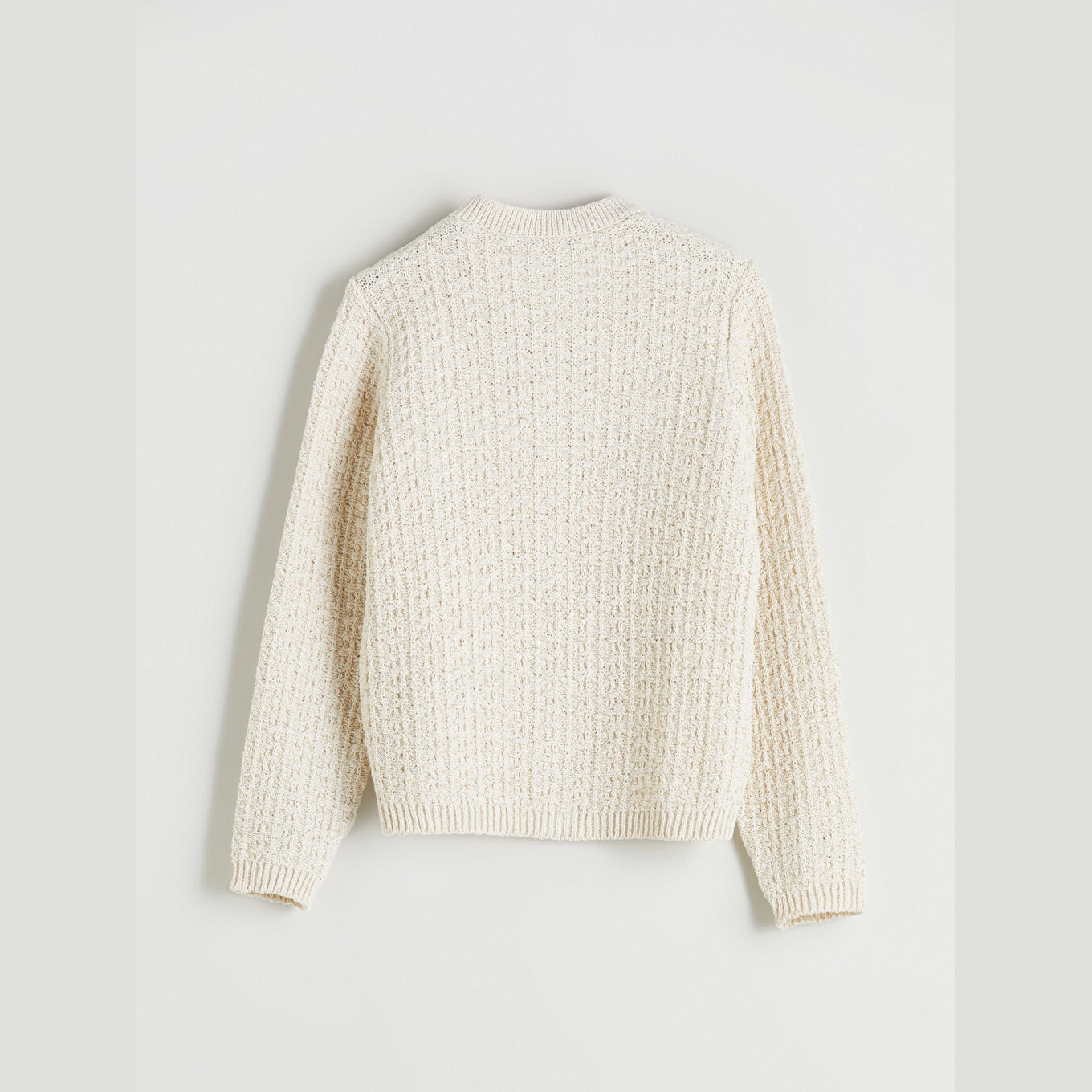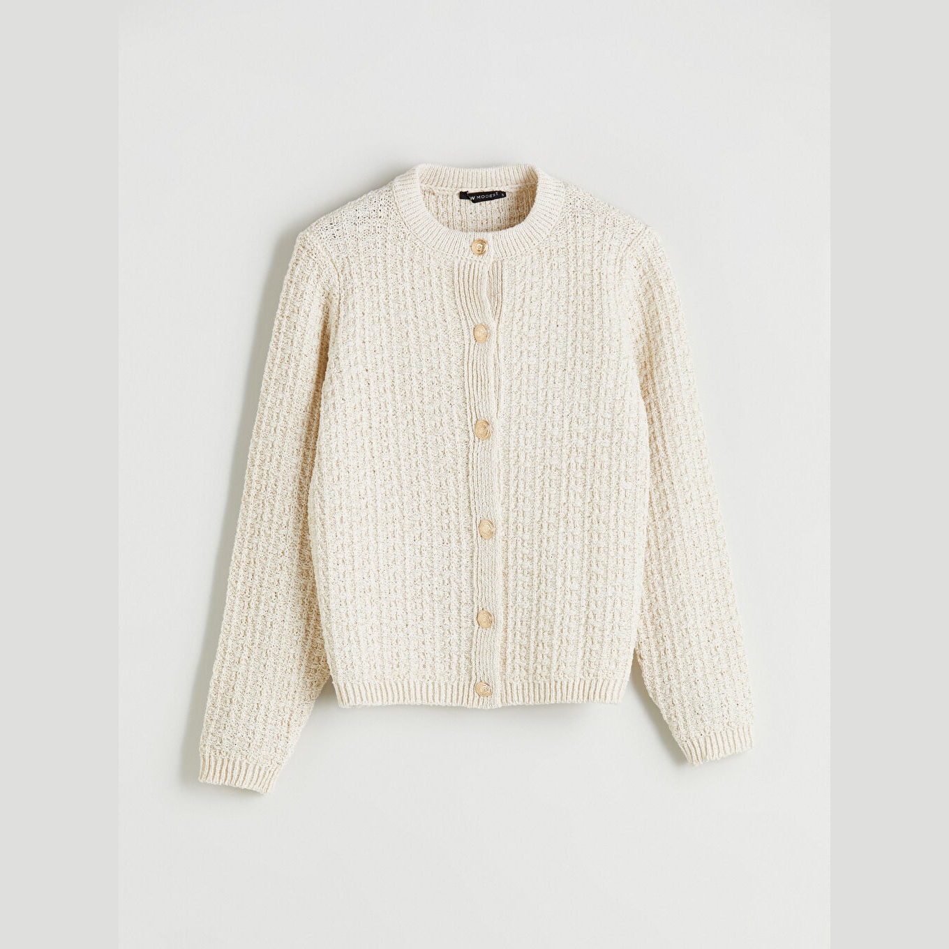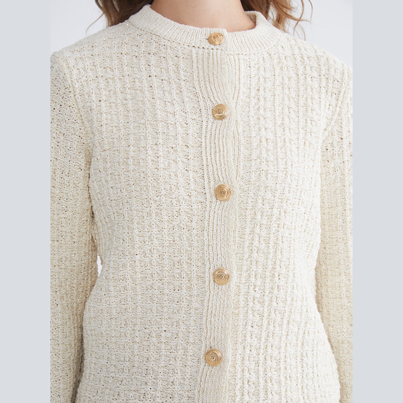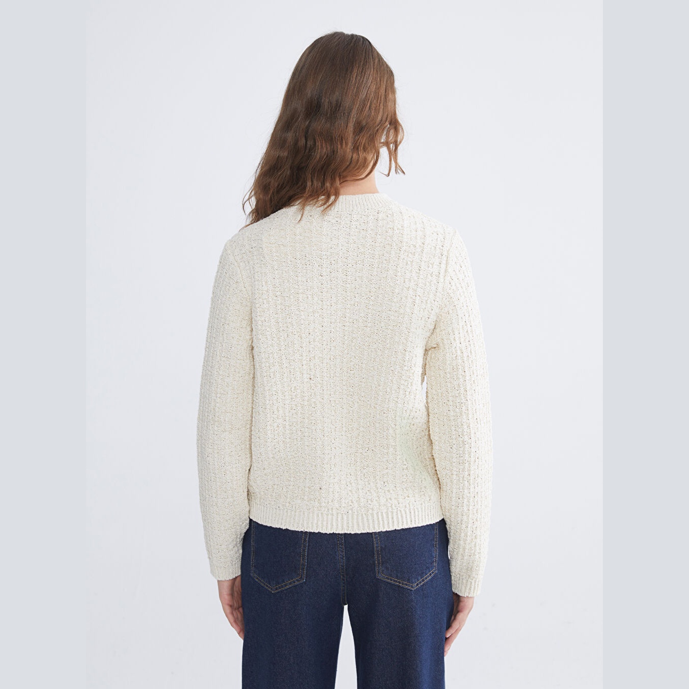 كارديغان نسائي بياقة دائرية بنقشة ذاتية من LCW Modest – إكرو (قصة قياسية، خامة تريكو متوسطة السماكة، تصميم قصير بأزرار أمامية، ضمن مجموعة المحتشمات)