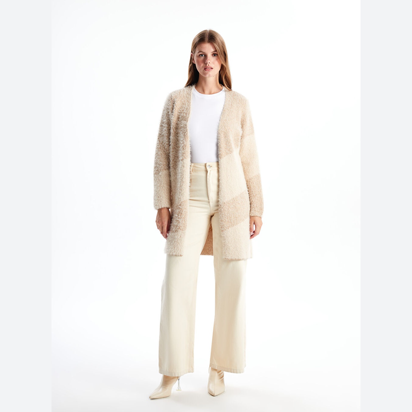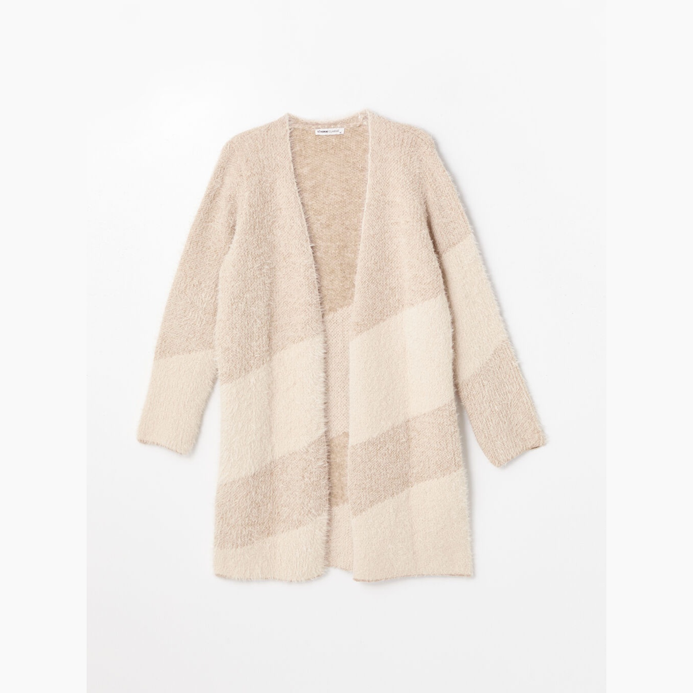 كارديغان نسائي بياقة شال من LCW Classic – بني بتصميم ألوان متداخلة (قصة قياسية، خامة تريكو سميكة، تصميم بلوك لوني بأكمام طويلة، ضمن مجموعة المقاسات الكبيرة)