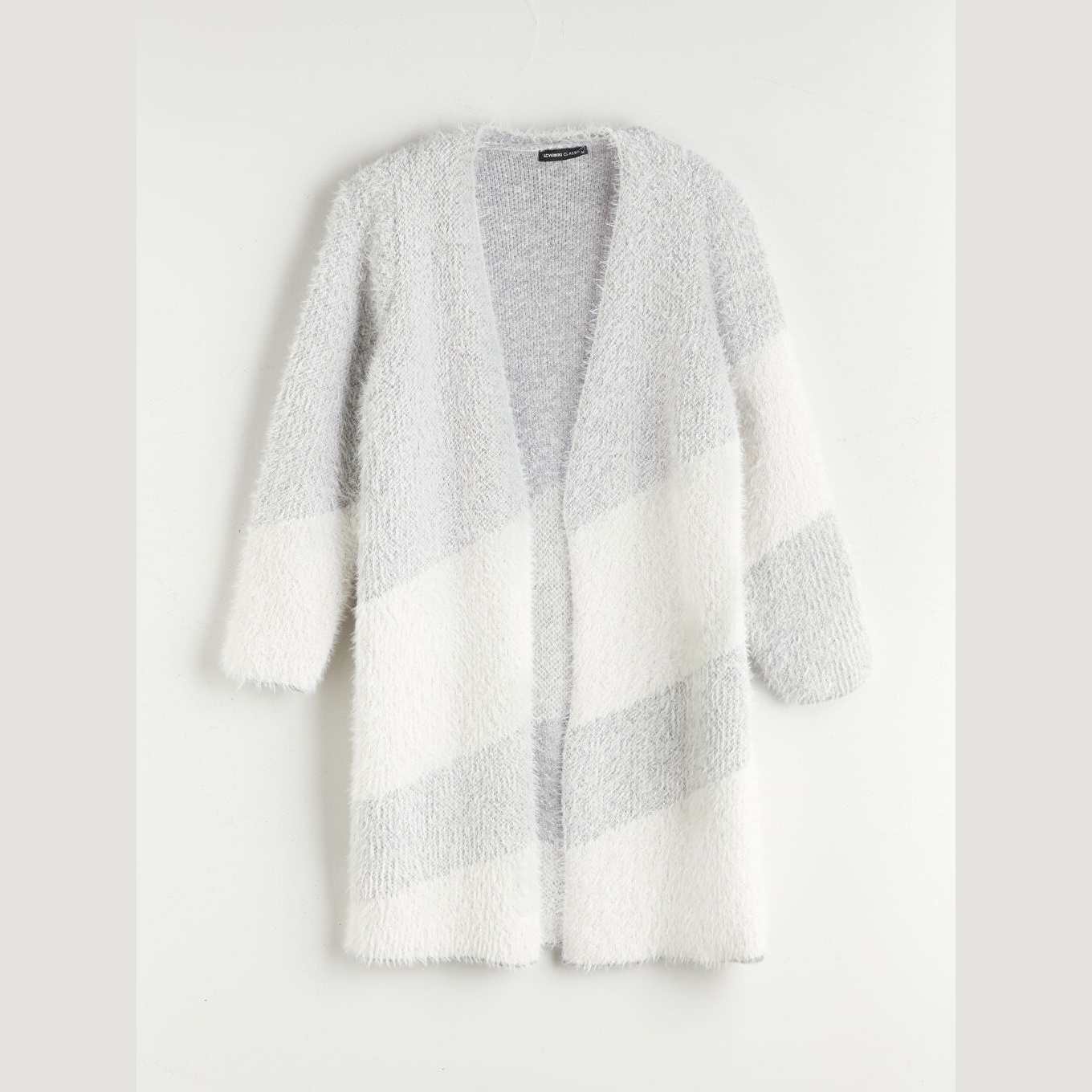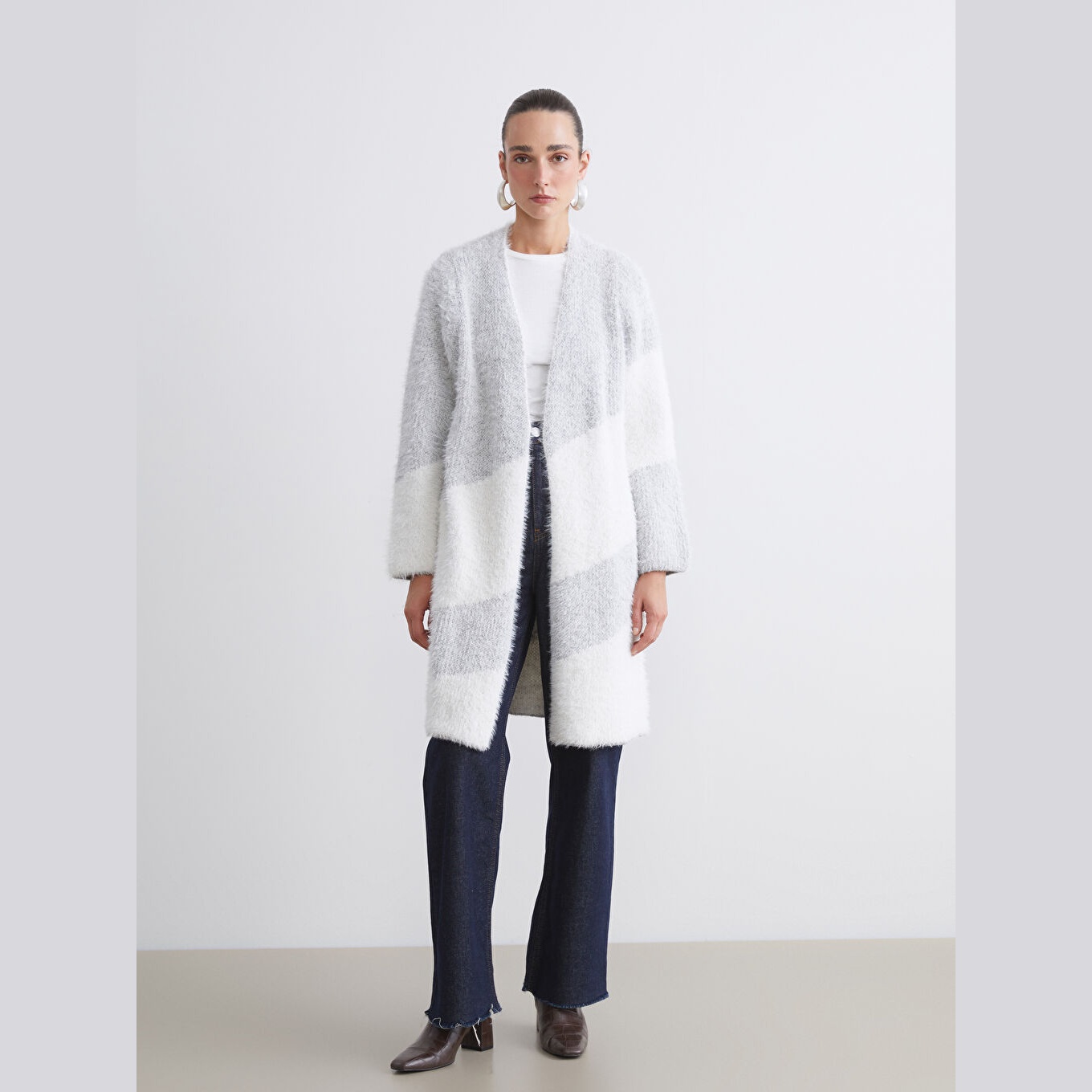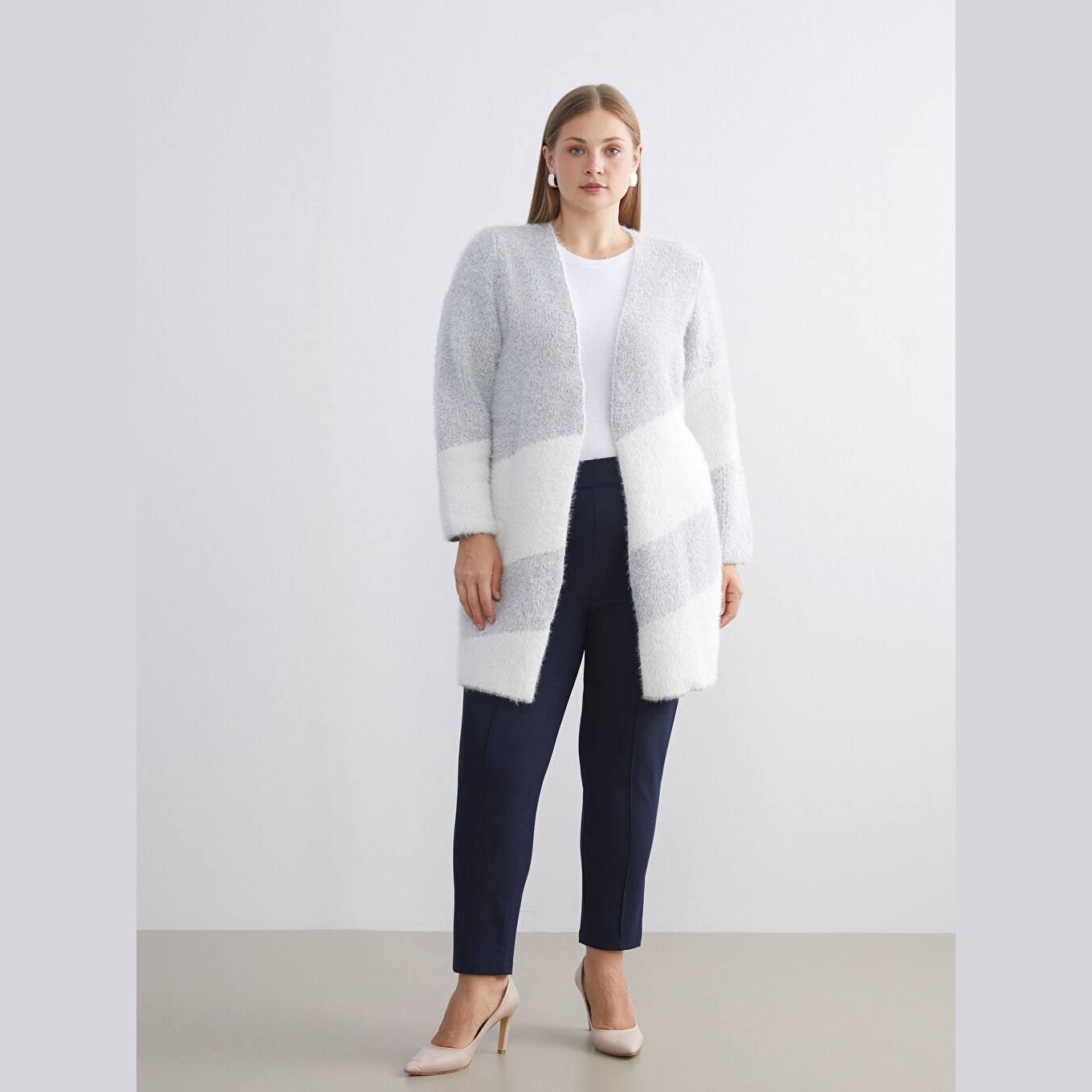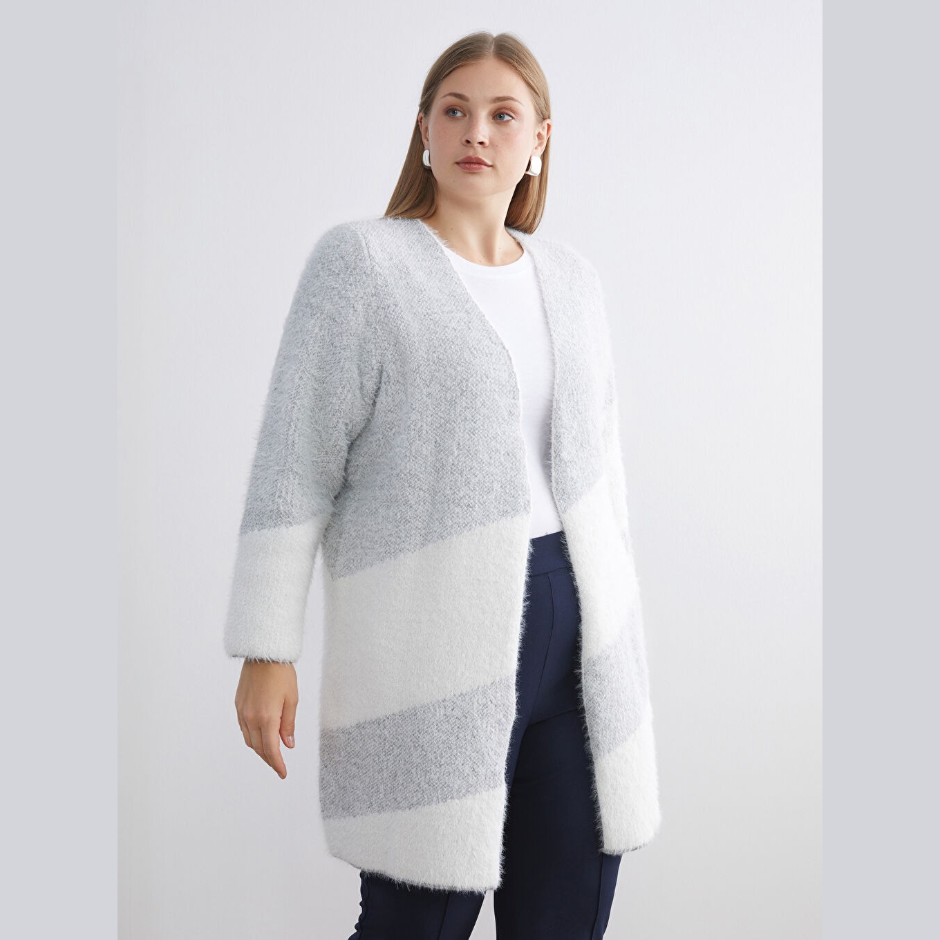 كارديغان نسائي بياقة شال من LCW Classic – رمادي بتصميم ألوان متداخلة (قصة قياسية، خامة تريكو سميكة، طول ميدي، ضمن مجموعة المقاسات الكبيرة)