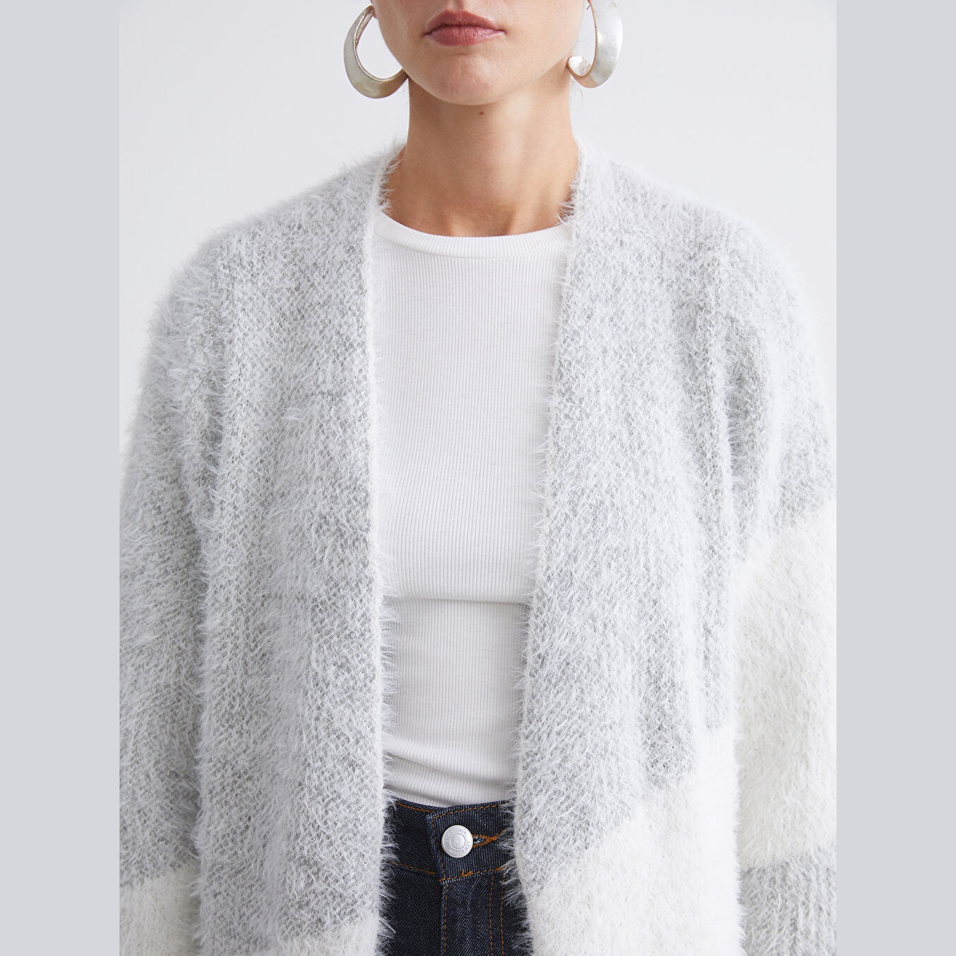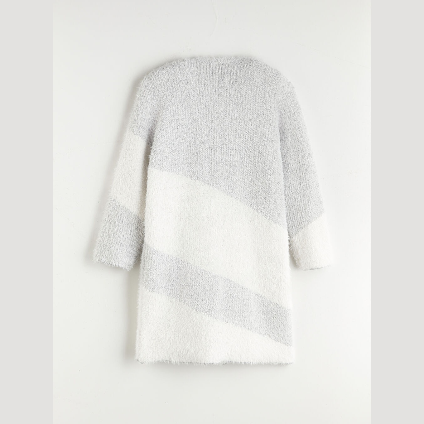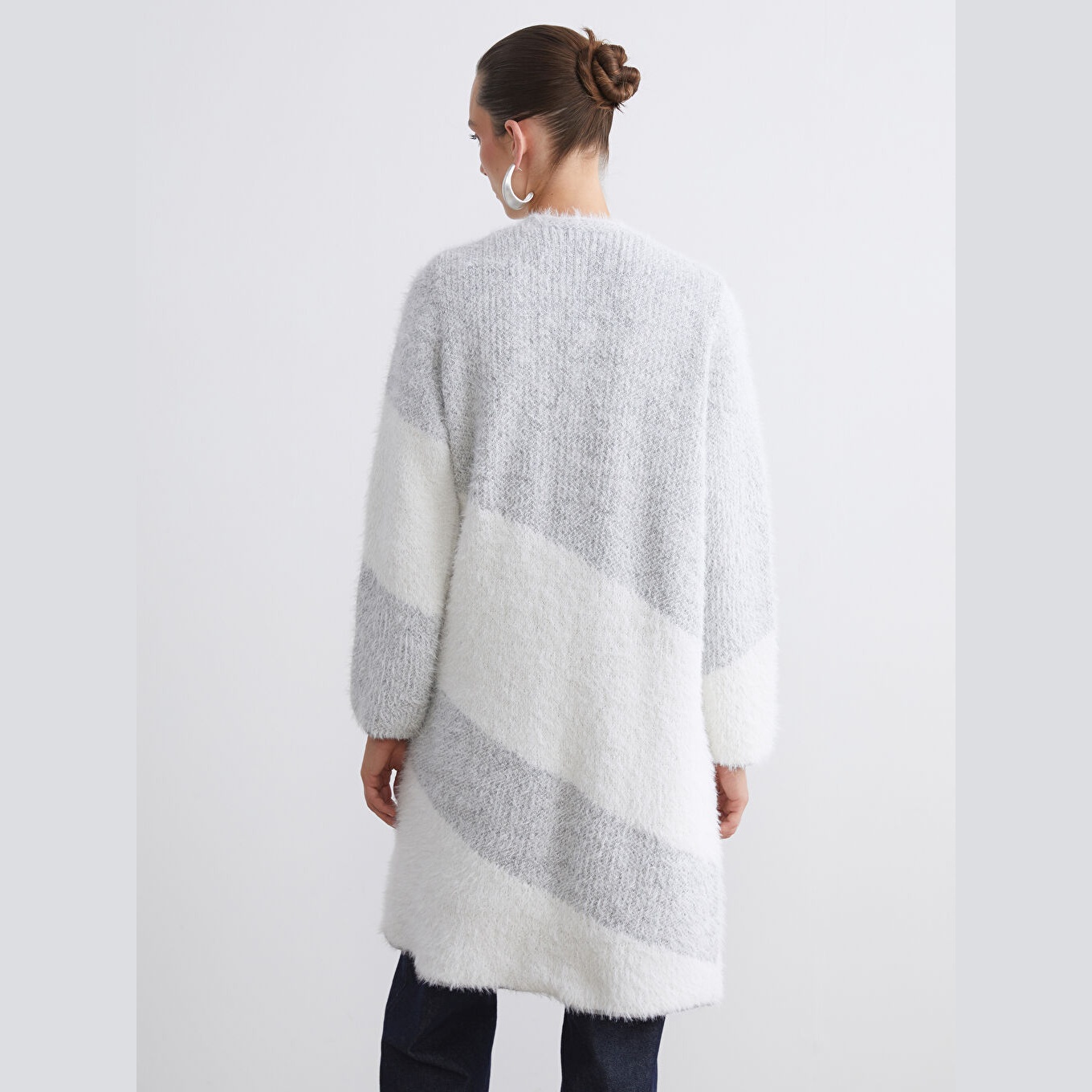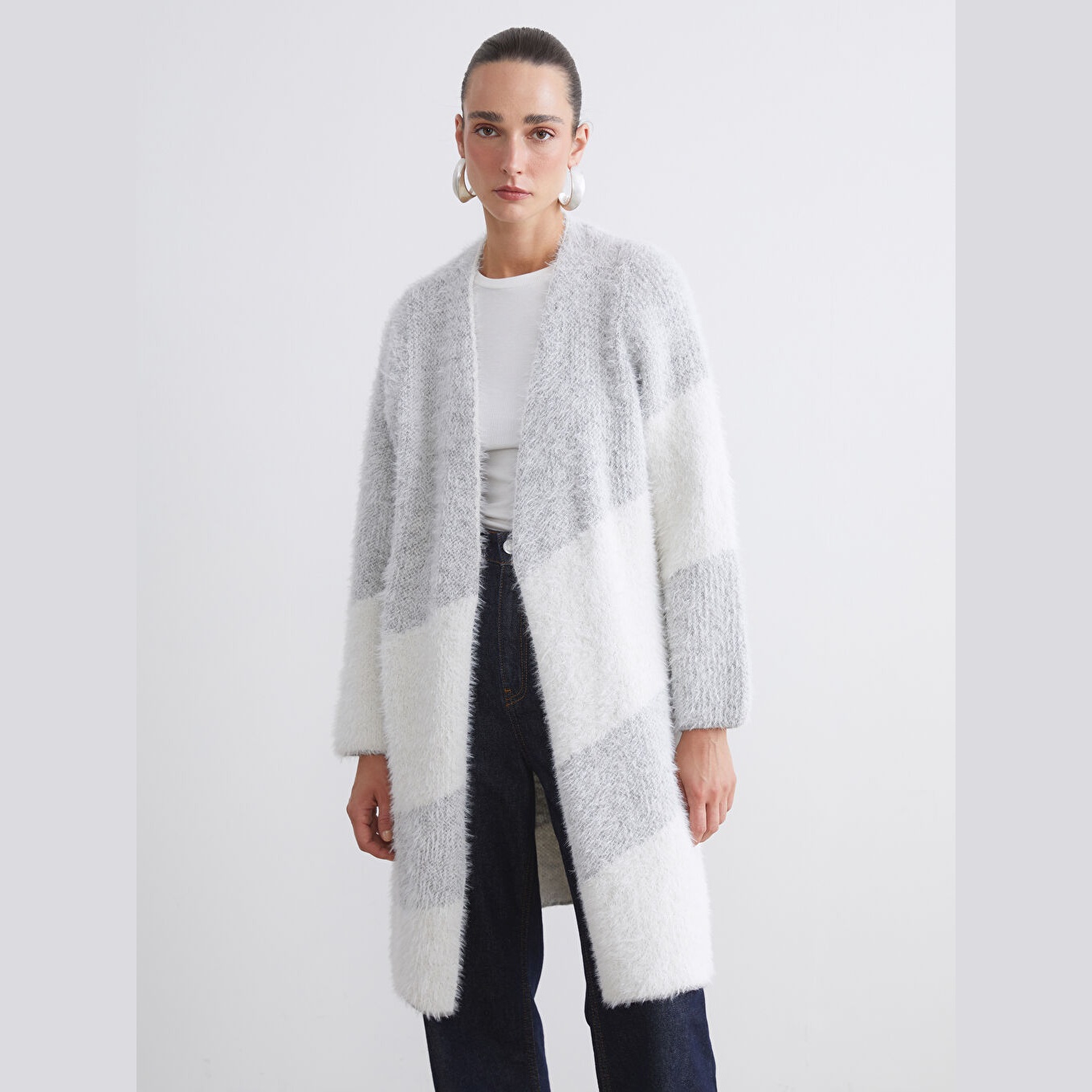 كارديغان نسائي بياقة شال من LCW Classic – رمادي بتصميم ألوان متداخلة (قصة قياسية، خامة تريكو سميكة، طول ميدي، ضمن مجموعة المقاسات الكبيرة)