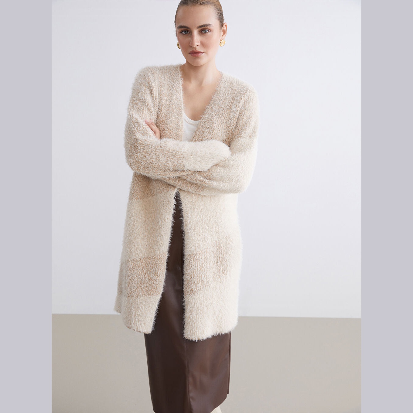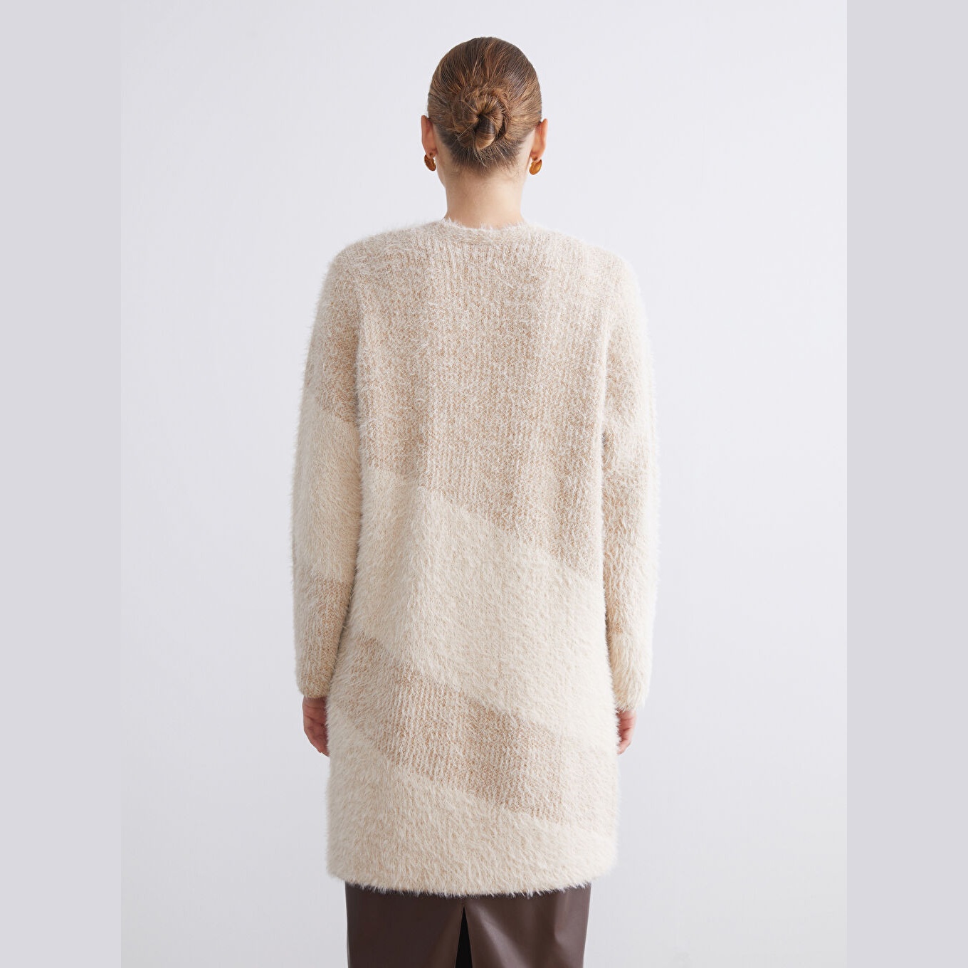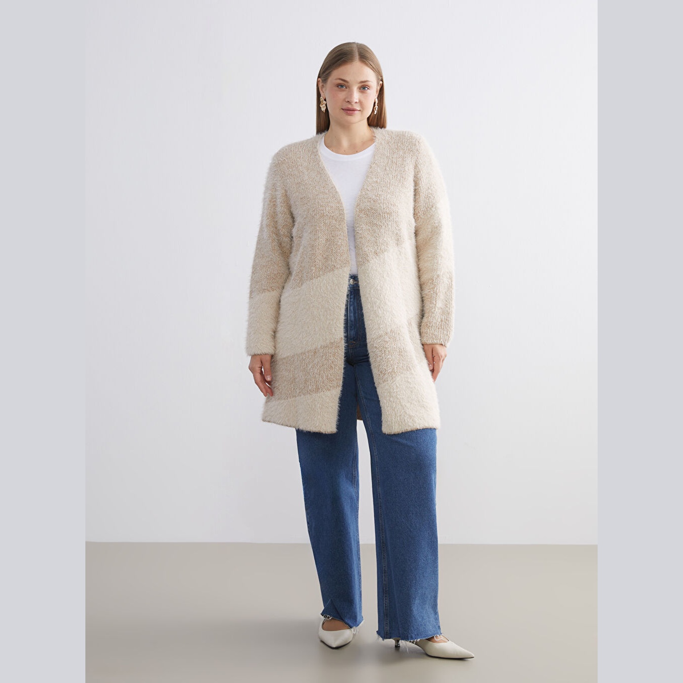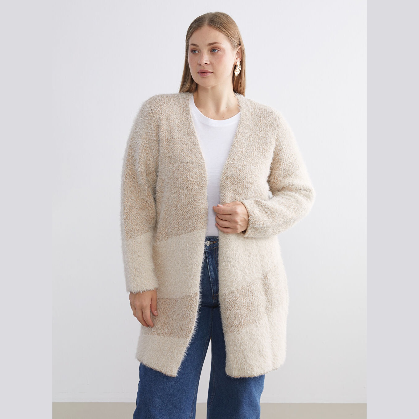 كارديغان نسائي بياقة شال من LCW Classic – بني بتصميم ألوان متداخلة (قصة قياسية، خامة تريكو سميكة، طول ميدي، ضمن مجموعة المقاسات الكبيرة)