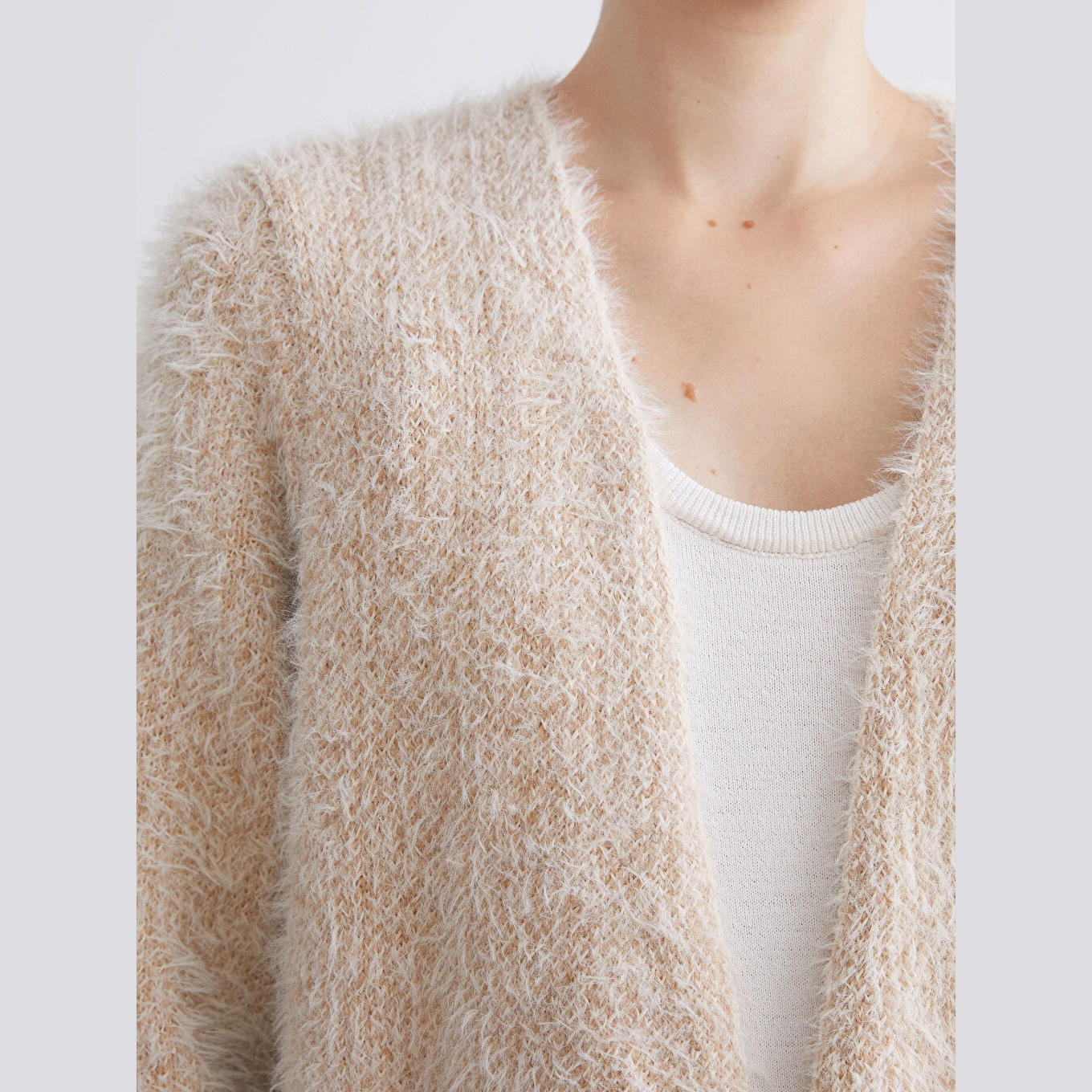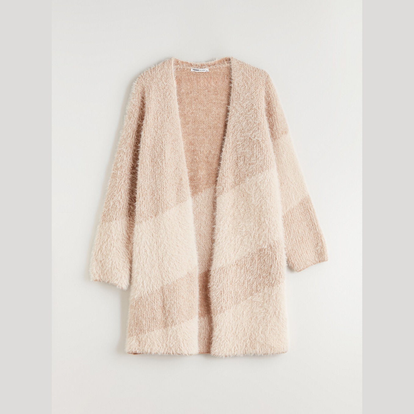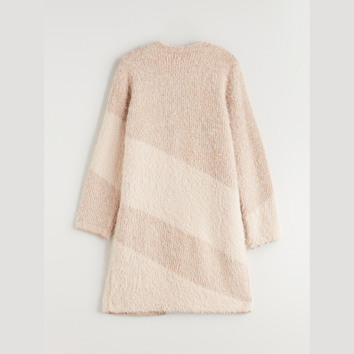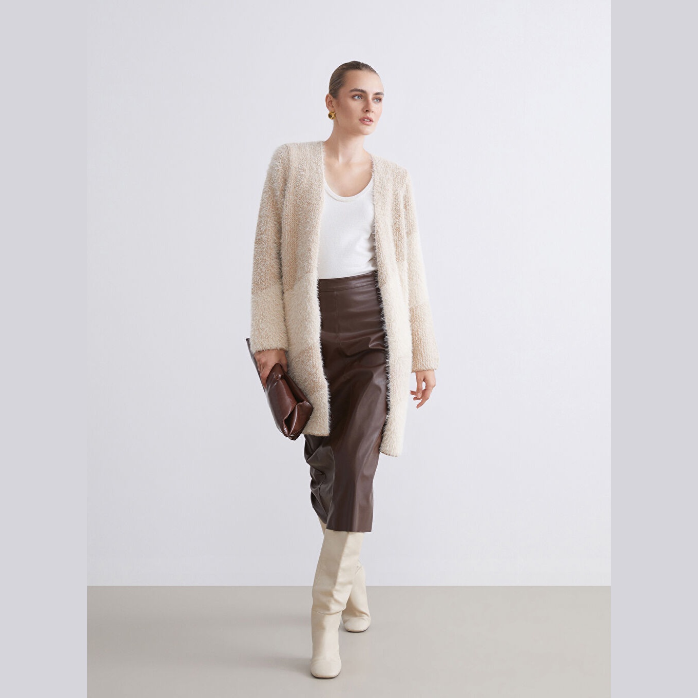 كارديغان نسائي بياقة شال من LCW Classic – بني بتصميم ألوان متداخلة (قصة قياسية، خامة تريكو سميكة، طول ميدي، ضمن مجموعة المقاسات الكبيرة)