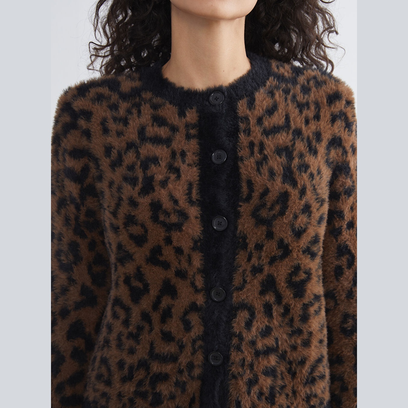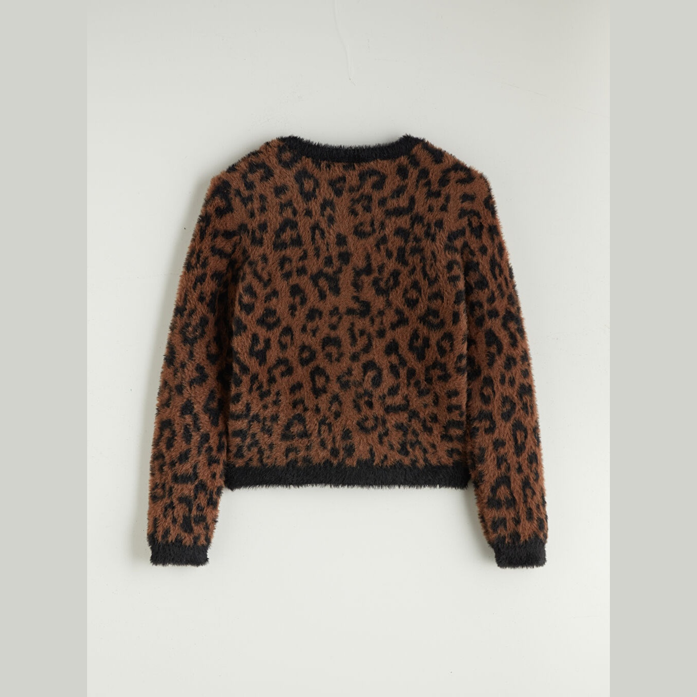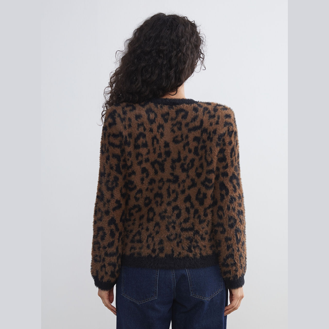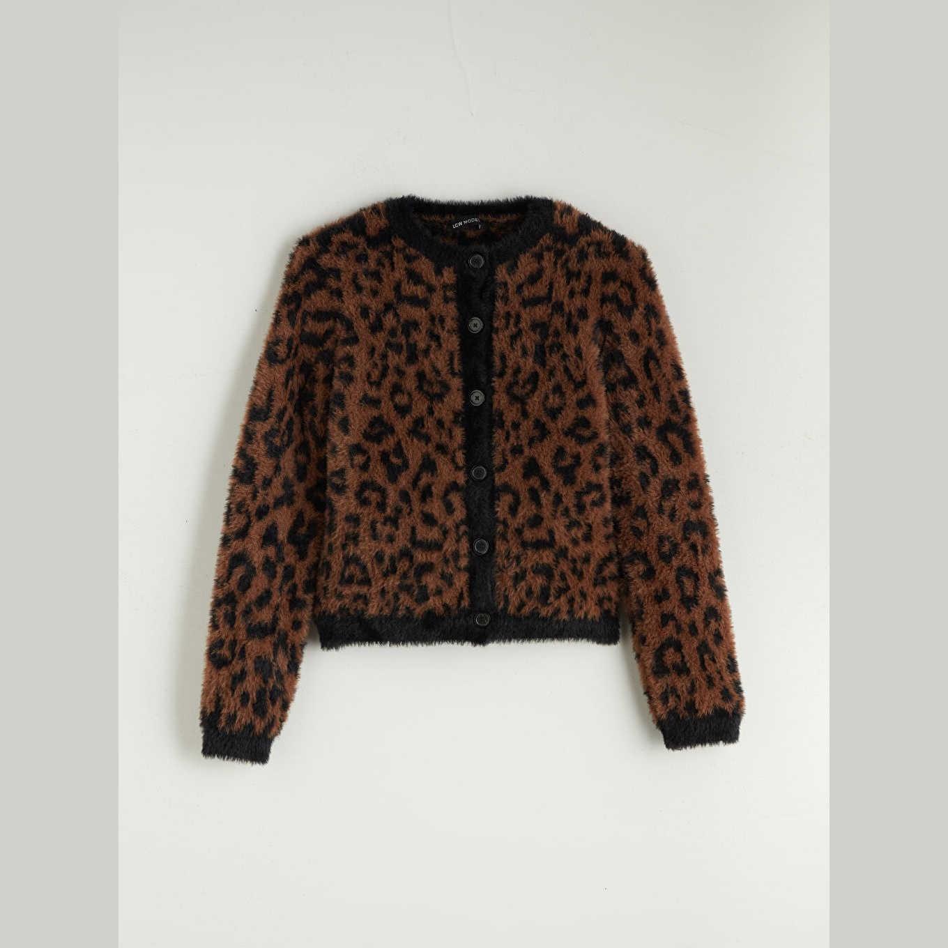 كارديغان نسائي بياقة دائرية بنقشة ليوبارد من LCW Modest – بني (قصة قياسية، خامة بيليوش تريكو سميكة، تصميم قصير بأزرار أمامية، ضمن مجموعة المحتشمات)