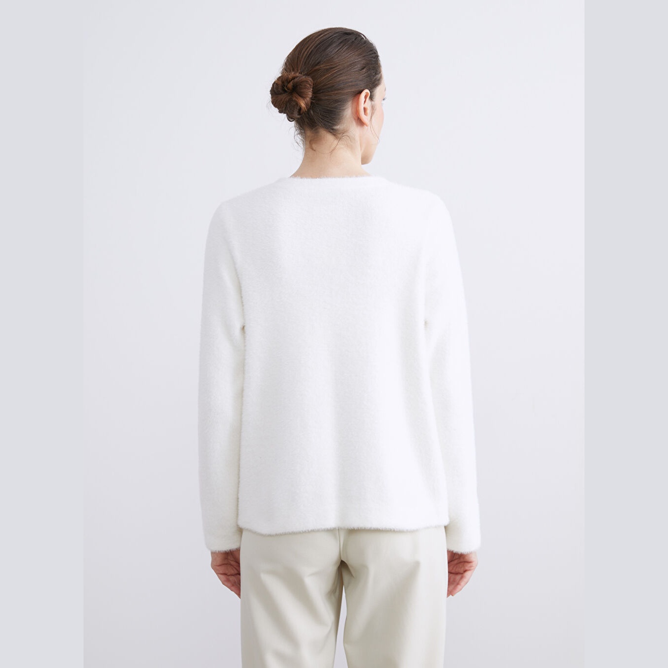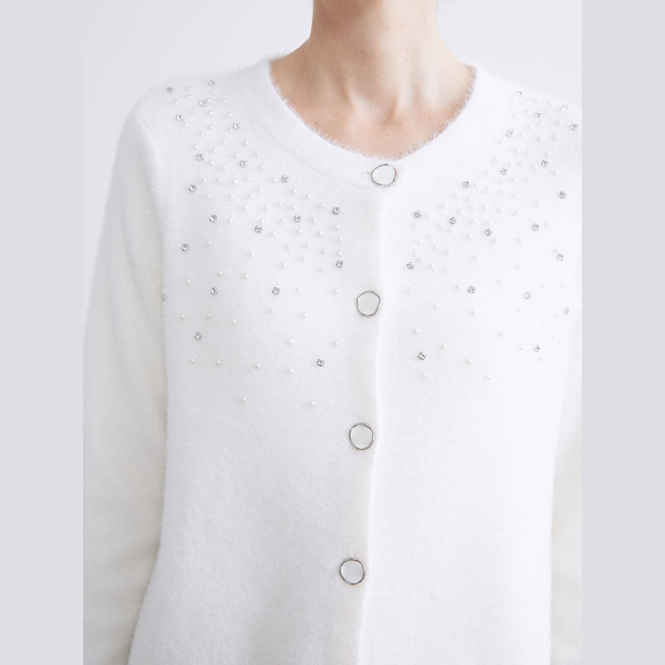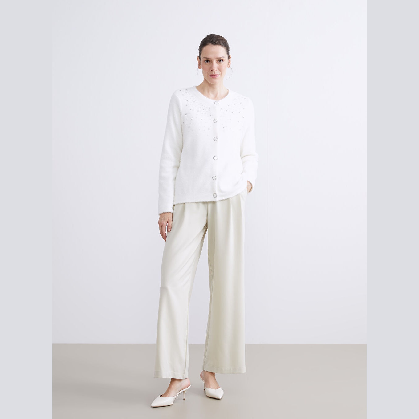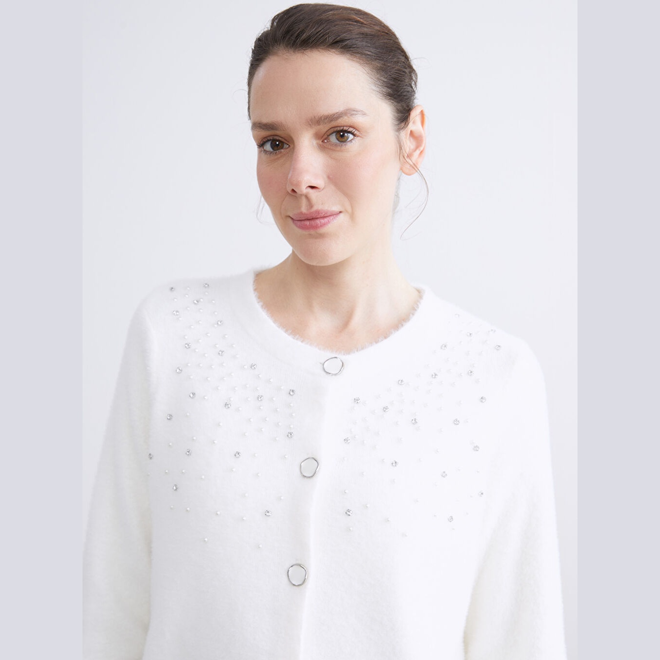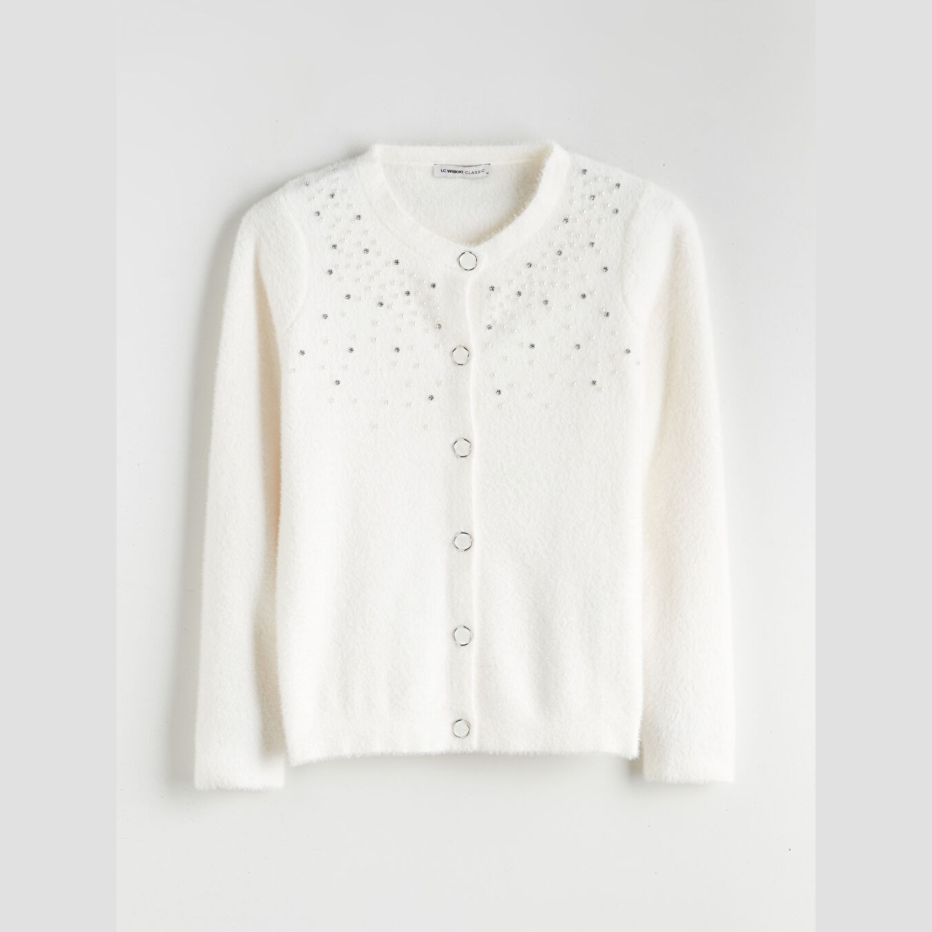 كارديغان نسائي بياقة دائرية مزين بالأحجار من LCW Classic – إكرو (قصة ضيقة، خامة تريكو ناعمة، تصميم أنيق بأزرار أمامية، ضمن مجموعة LCW Classic)