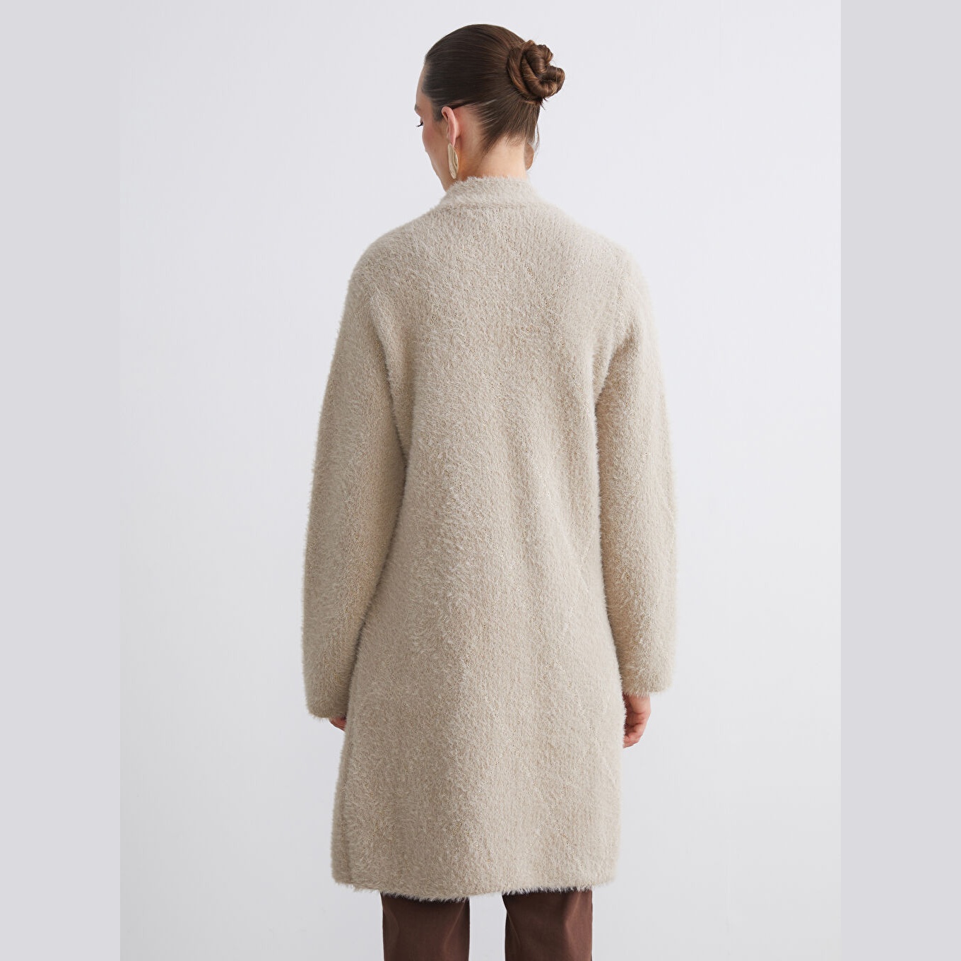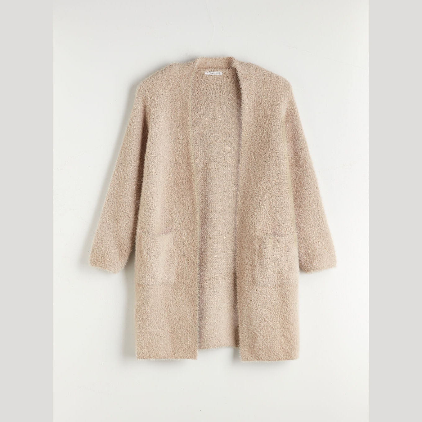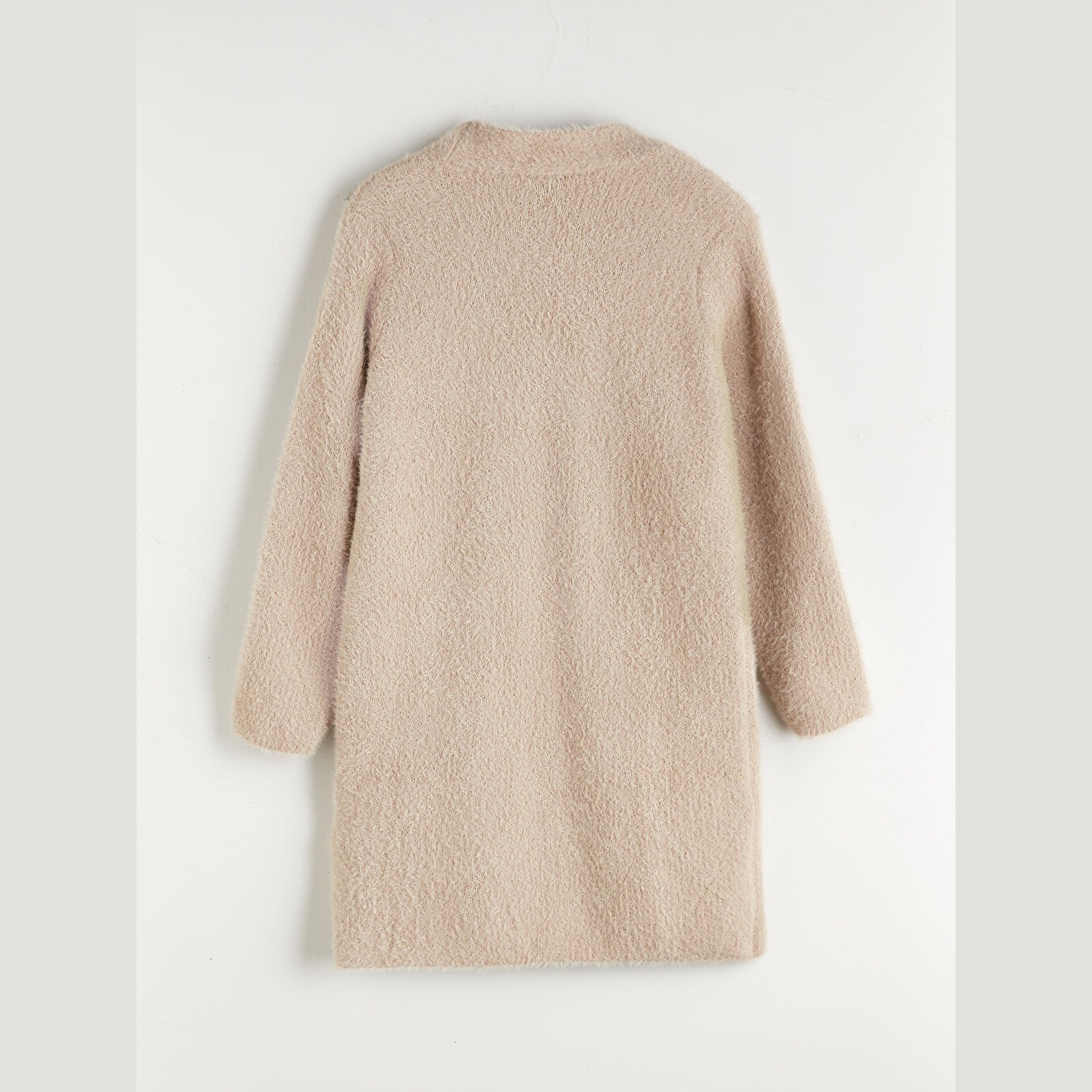 كارديغان نسائي بياقة شال من LCW Classic – بيج (قصة واسعة، خامة تريكو سميكة بخيط معدني، تصميم سادة بطول ميدي، ضمن مجموعة LCW Classic)