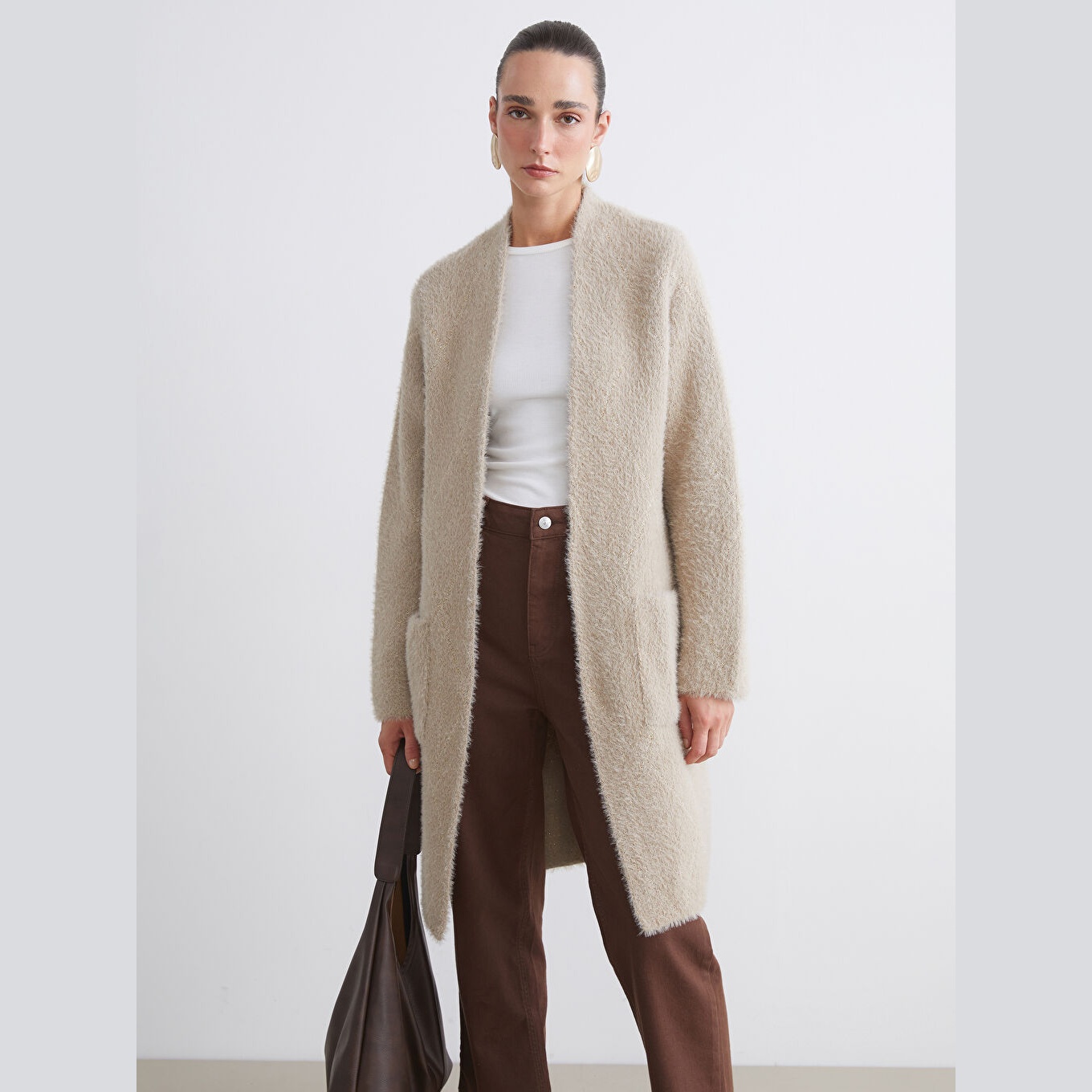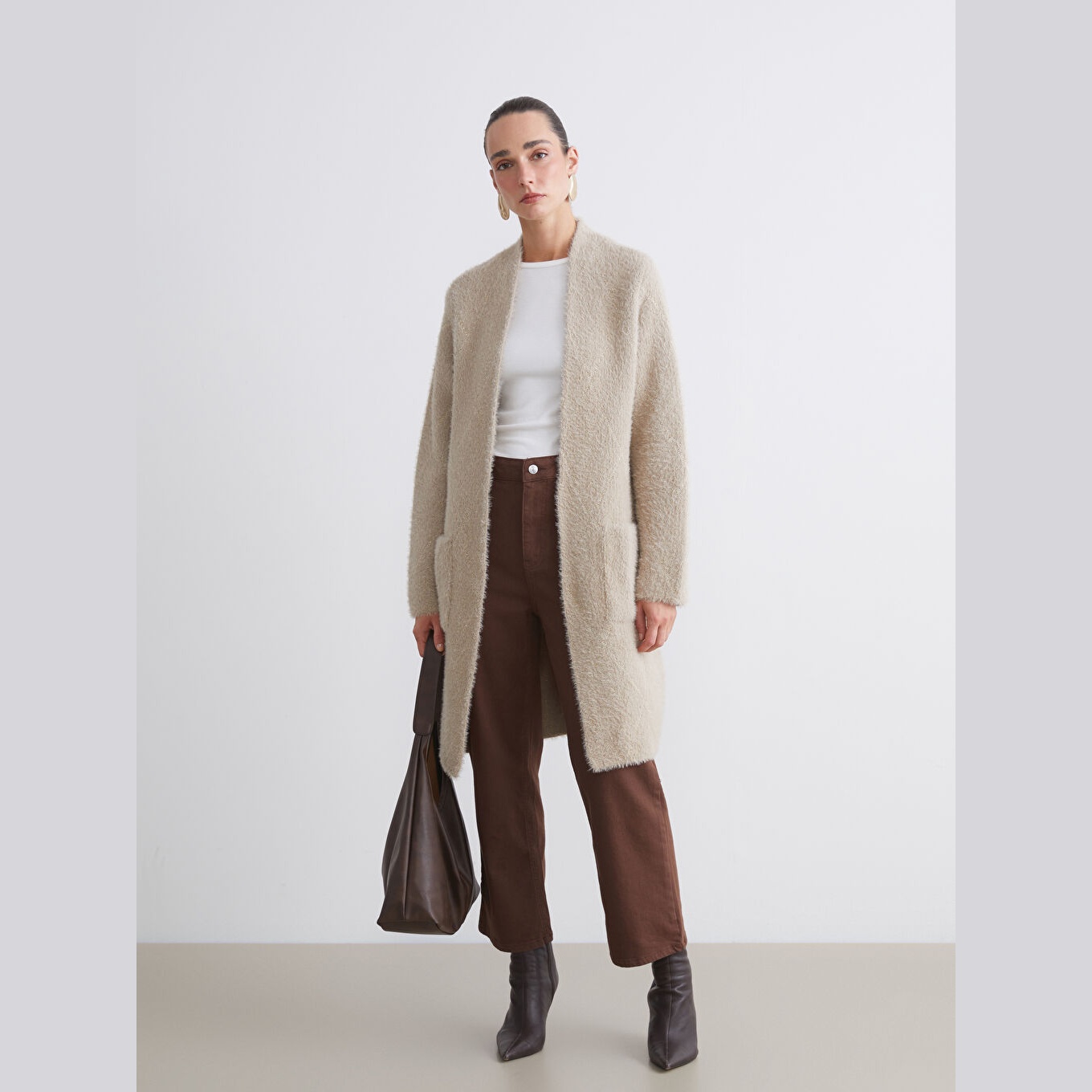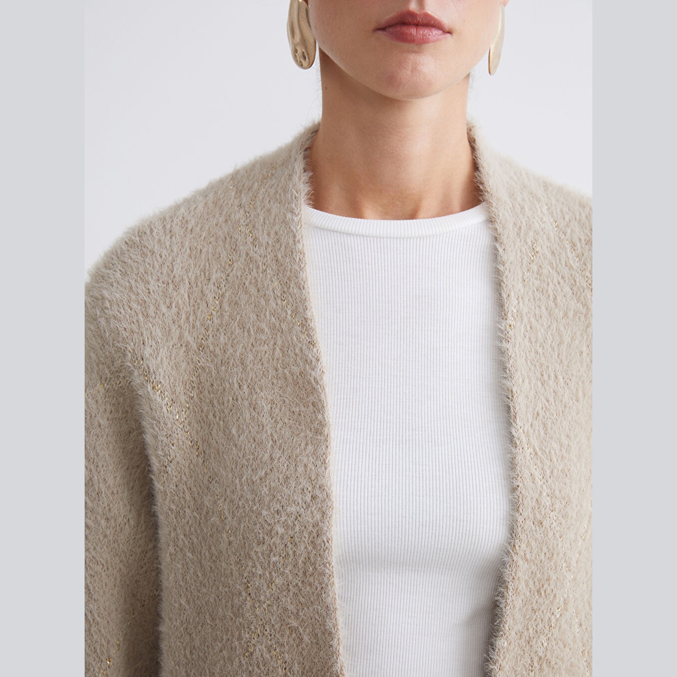 كارديغان نسائي بياقة شال من LCW Classic – بيج (قصة واسعة، خامة تريكو سميكة بخيط معدني، تصميم سادة بطول ميدي، ضمن مجموعة LCW Classic)