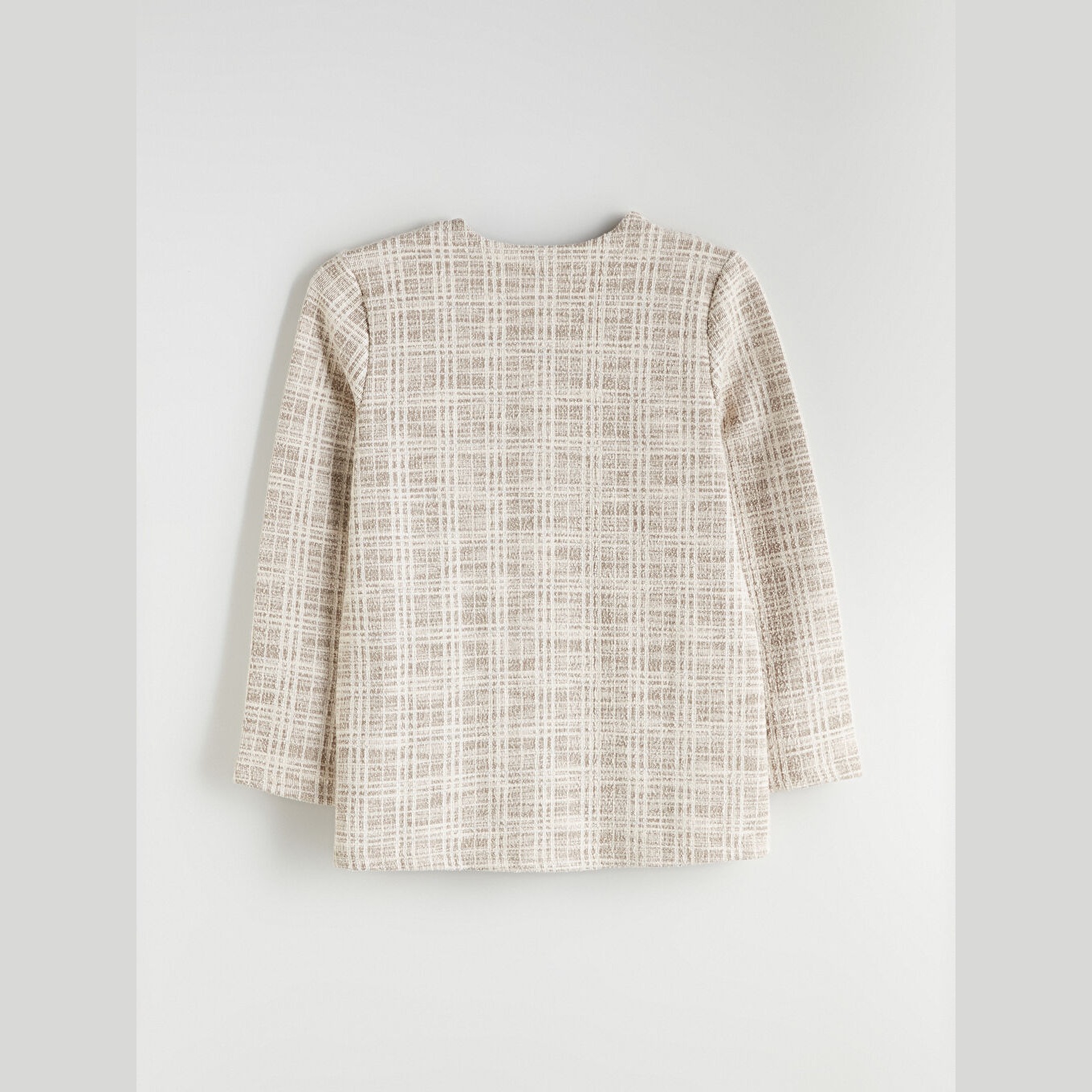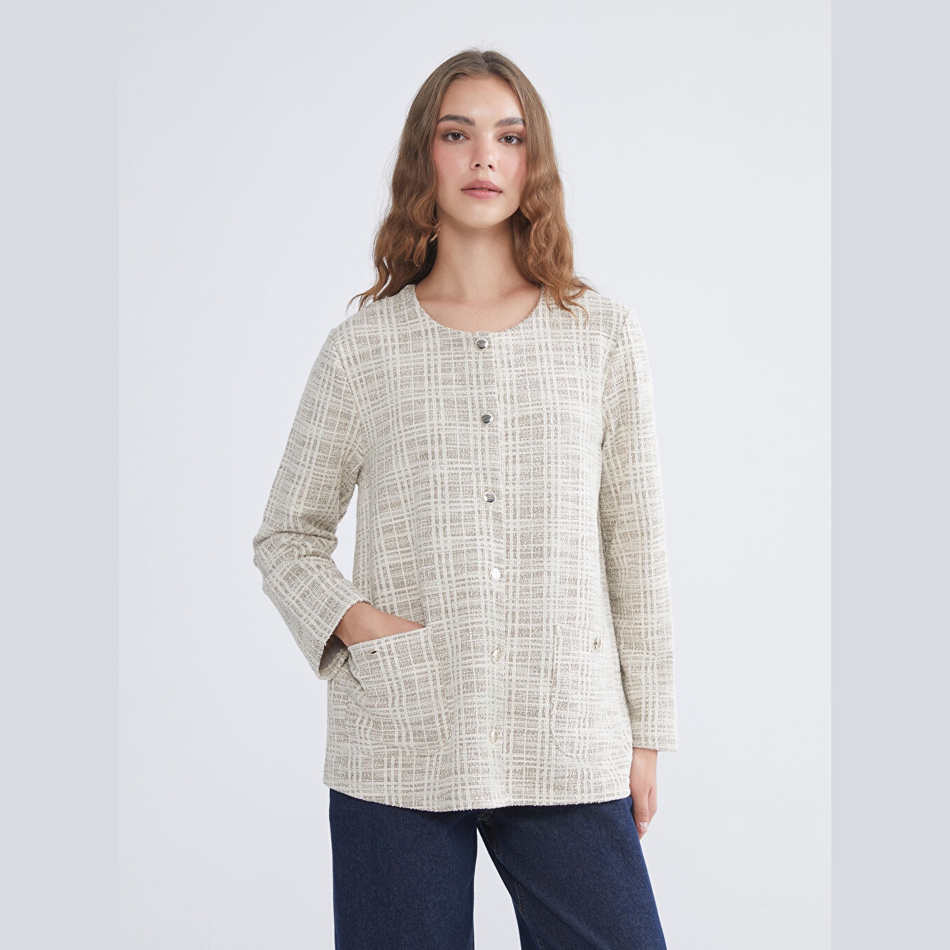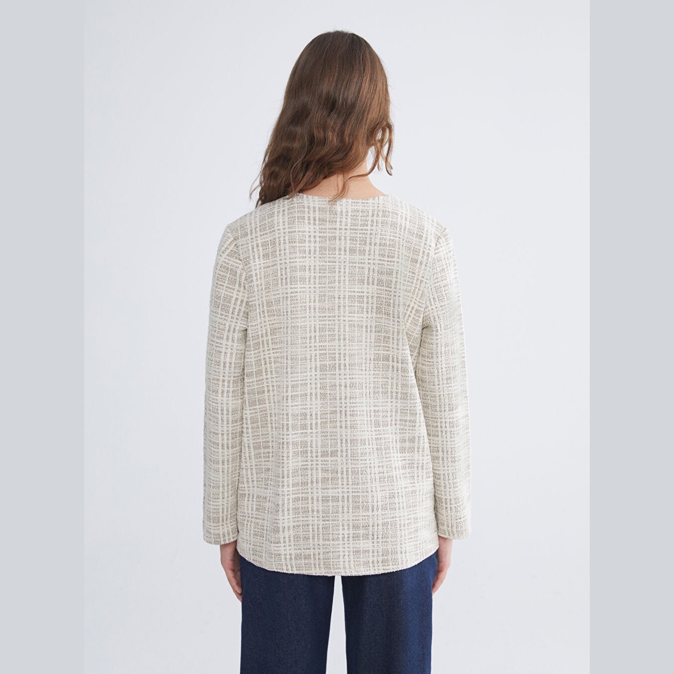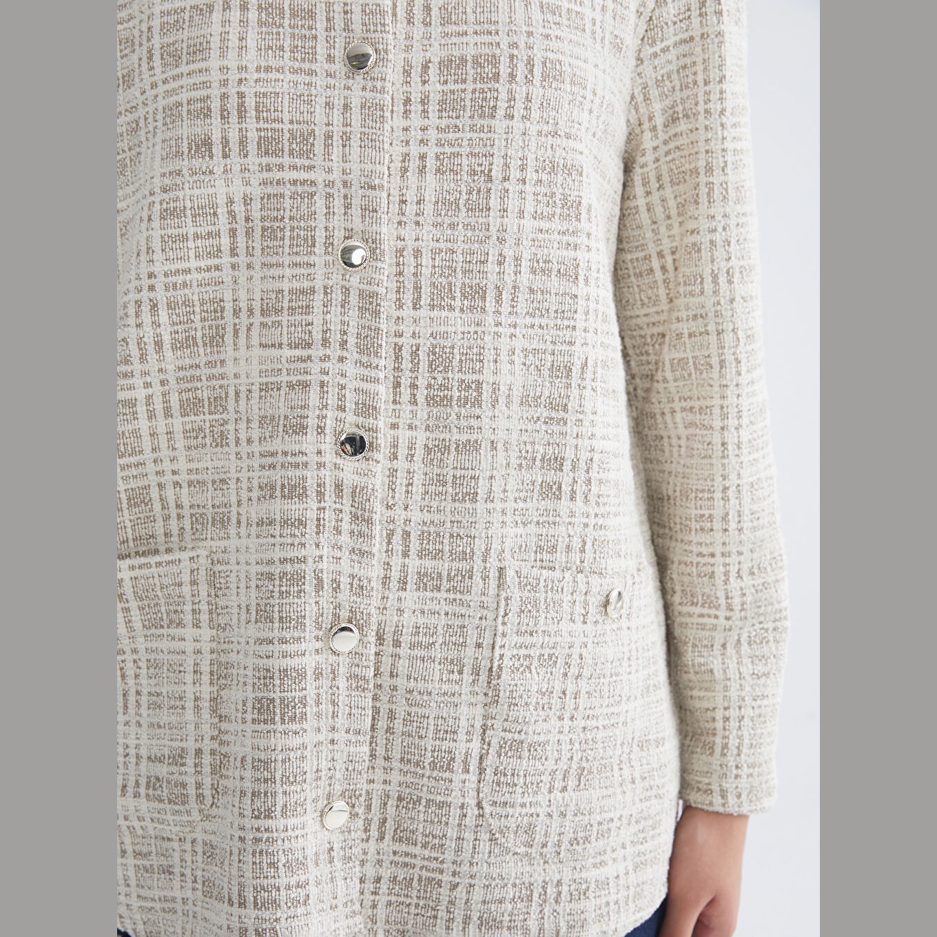 كارديغان نسائي بياقة دائرية بنقشة مربعات من LCW Grace – أبيض (قصة واسعة، خامة إنترلوك ناعمة، تصميم مريح ضمن مجموعة المقاسات الكبيرة)