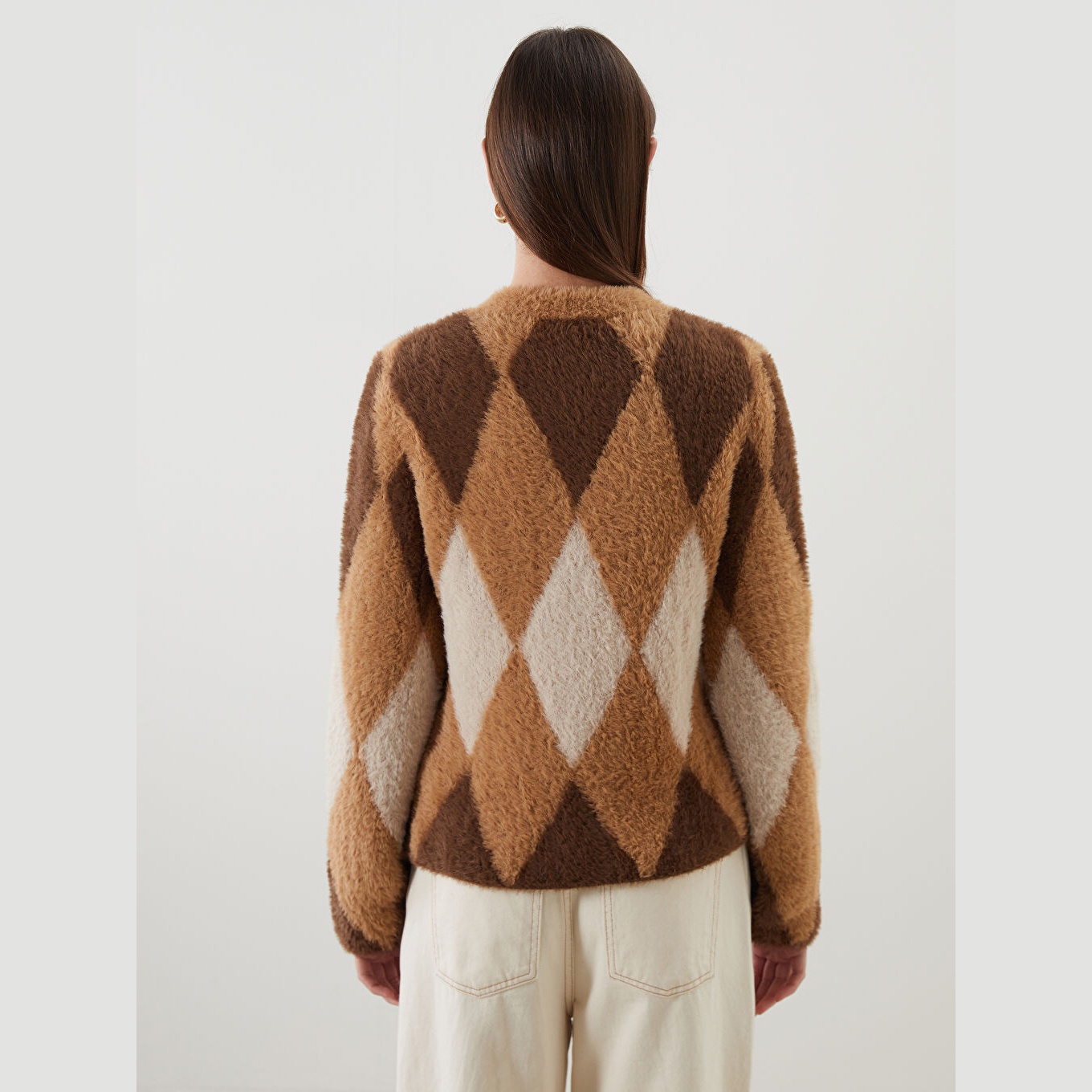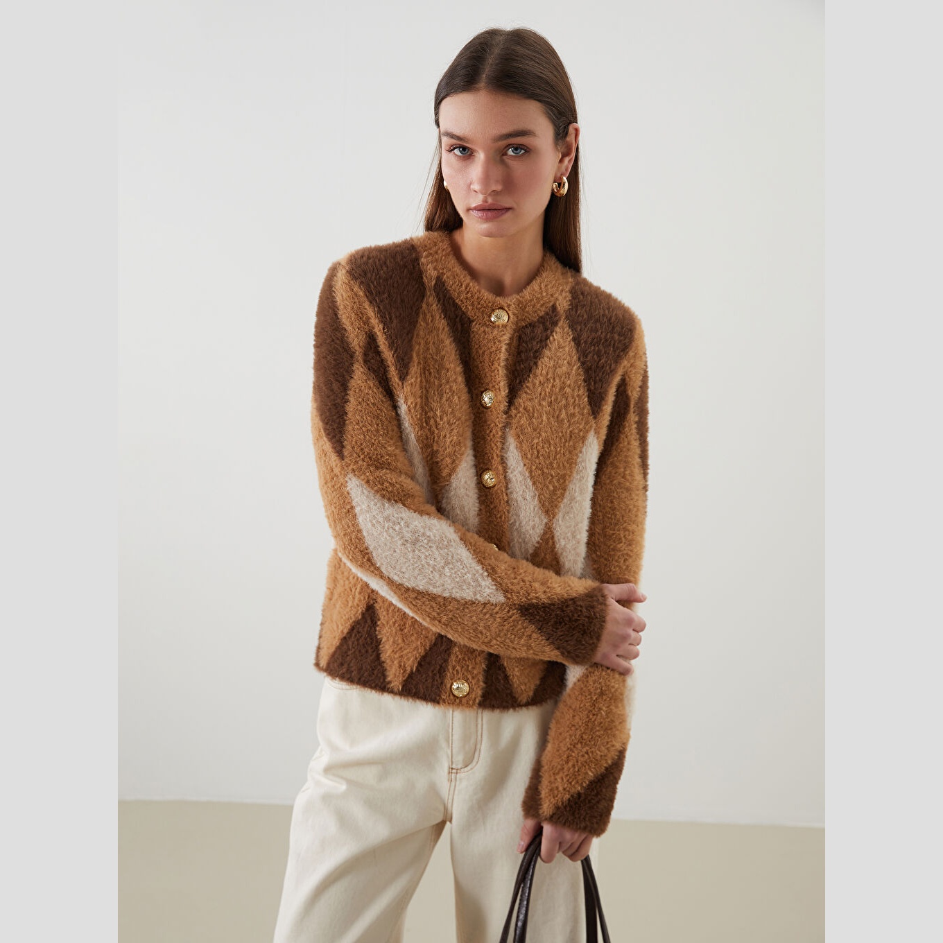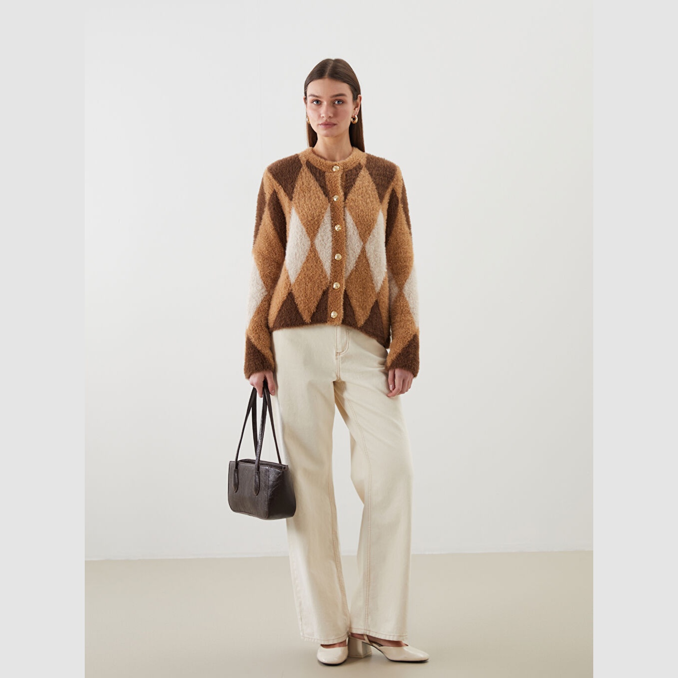 كارديغان نسائي بياقة دائرية بتصميم ألوان متداخلة من LCW Modest – بيج (قصة قياسية، خامة تريكو سميكة، تصميم بلوكات لونية، ضمن مجموعة المحتشمات)
