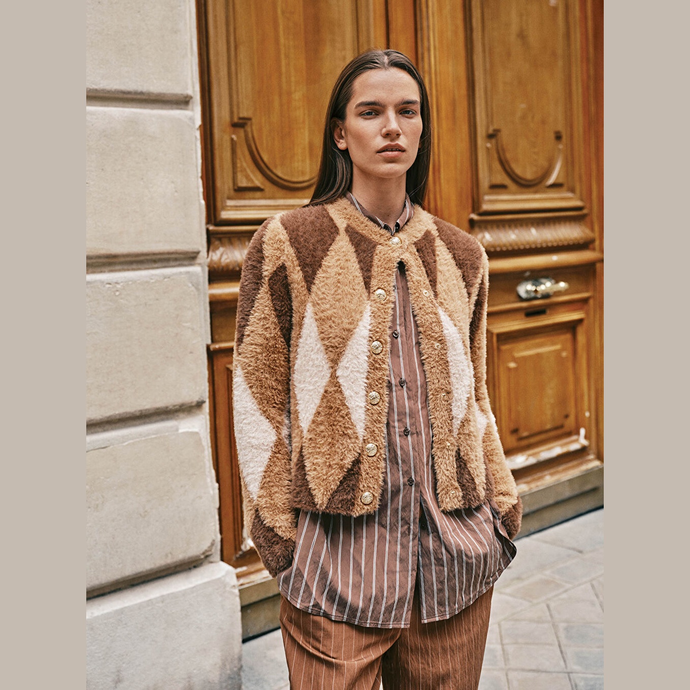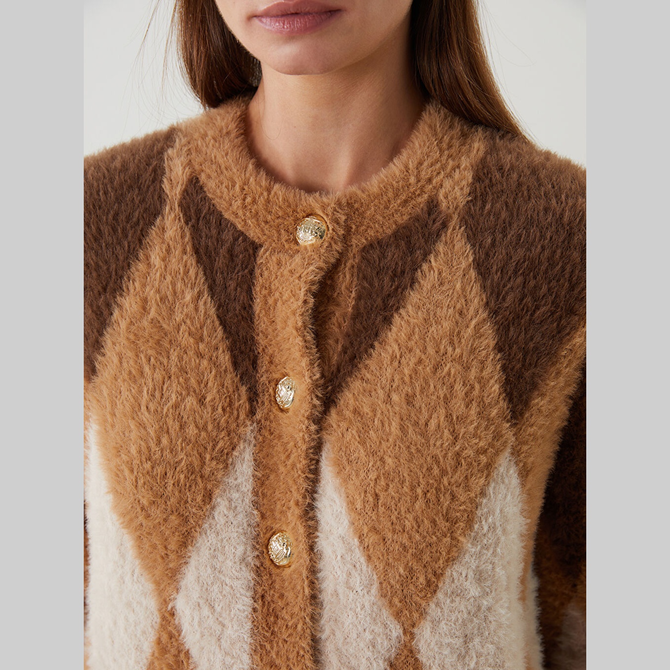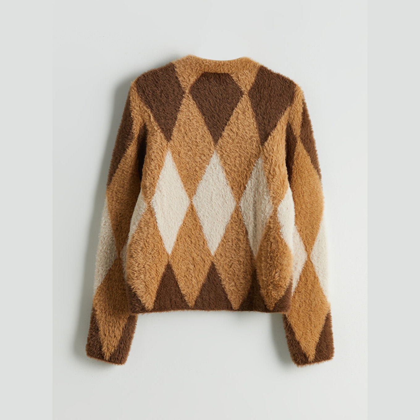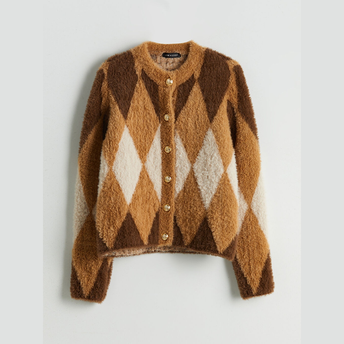 كارديغان نسائي بياقة دائرية بتصميم ألوان متداخلة من LCW Modest – بيج (قصة قياسية، خامة تريكو سميكة، تصميم بلوكات لونية، ضمن مجموعة المحتشمات)