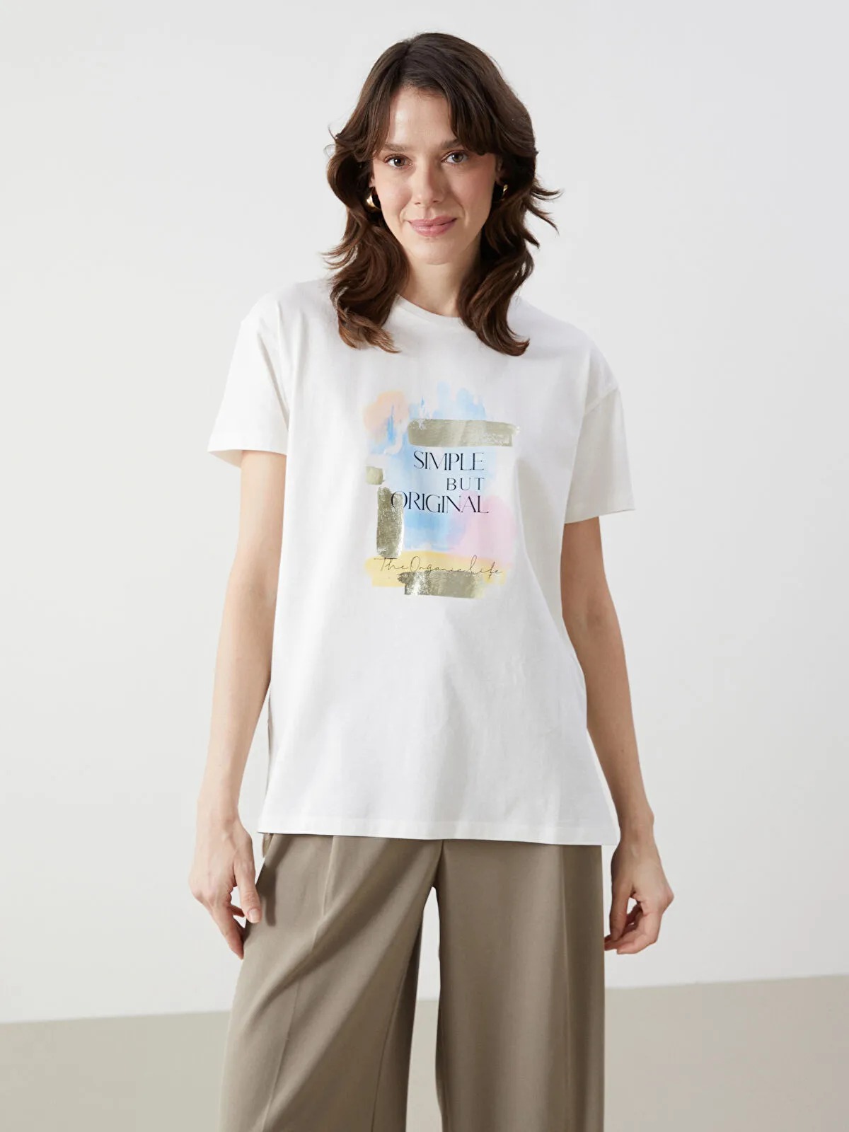 تيشيرت نسائي بلون بيج فاتح ناعم (Ekru)، بياقة دائرية قصيرة وأكمام قصيرة، مزين بطبعة جذابة أمامية. تصميم Loose Fit يضمن حرية حركة وراحة مثالية طوال اليوم، مثالي لإطلالة كاجوال أننيقة وأنيقة.