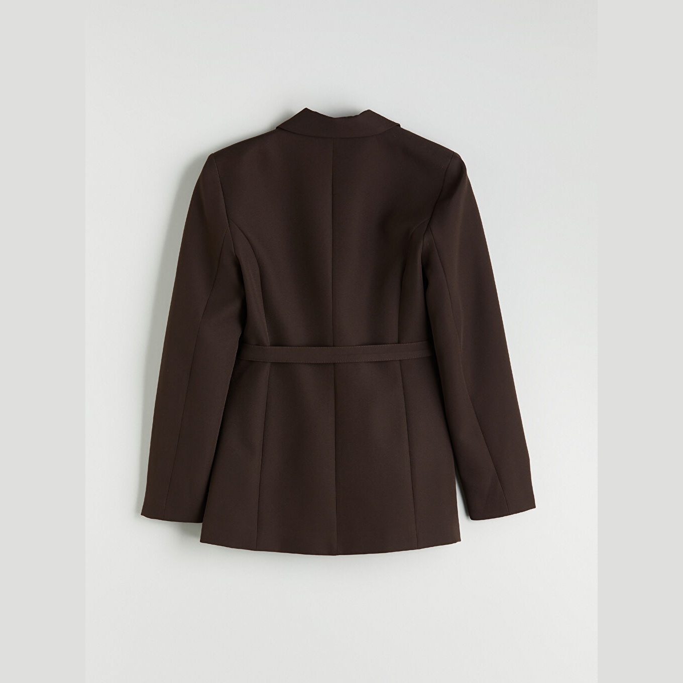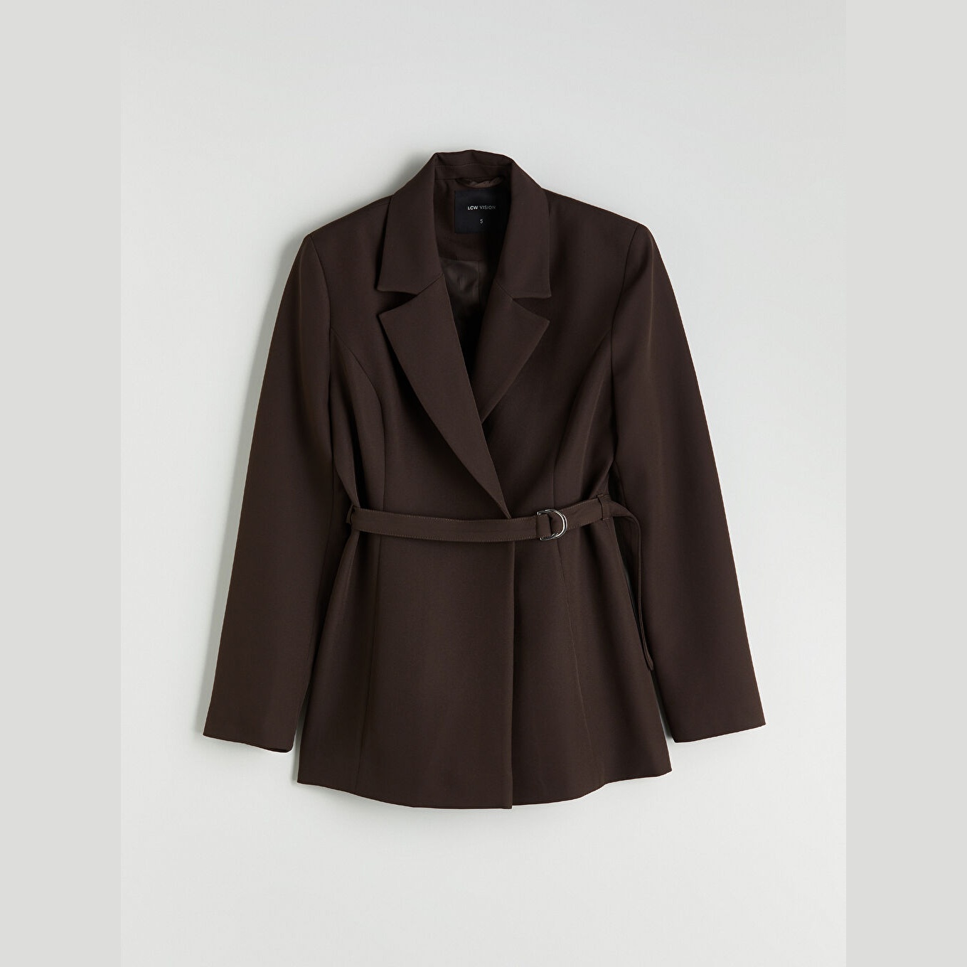 جاكيت بليزر بلون بني (Kahverengi) من مجموعة LCW Vision، مصمم بياقة جاكيت كلاسيكية (Ceket Yaka)، قصة قياسية (Regular Fit) توازن بين الراحة والشكل، خامة كريب مرنة مصنوعة من %88 بوليستر و%12 إيلاستان، مبطّن بالكامل بـ%100 بوليستر، تصميم سادة بدون نقوش، مزود بحزام خصر خارجي (Kemer) لتحديد القوام، يتكون من قطعتين (الجاكيت + الحزام)، بطول يُقاس من الكتف، مثالي للإطلالات الرسمية أو العملية.