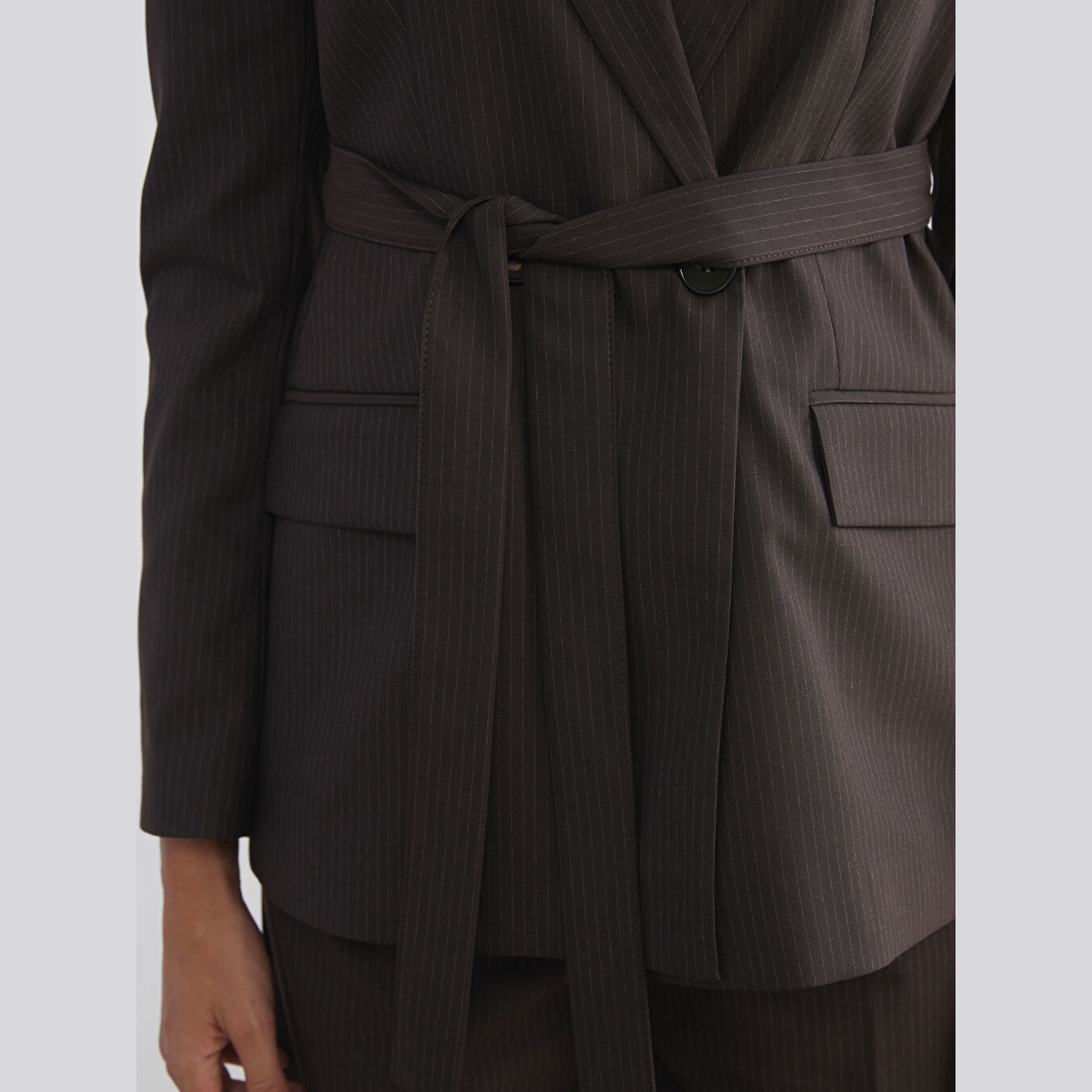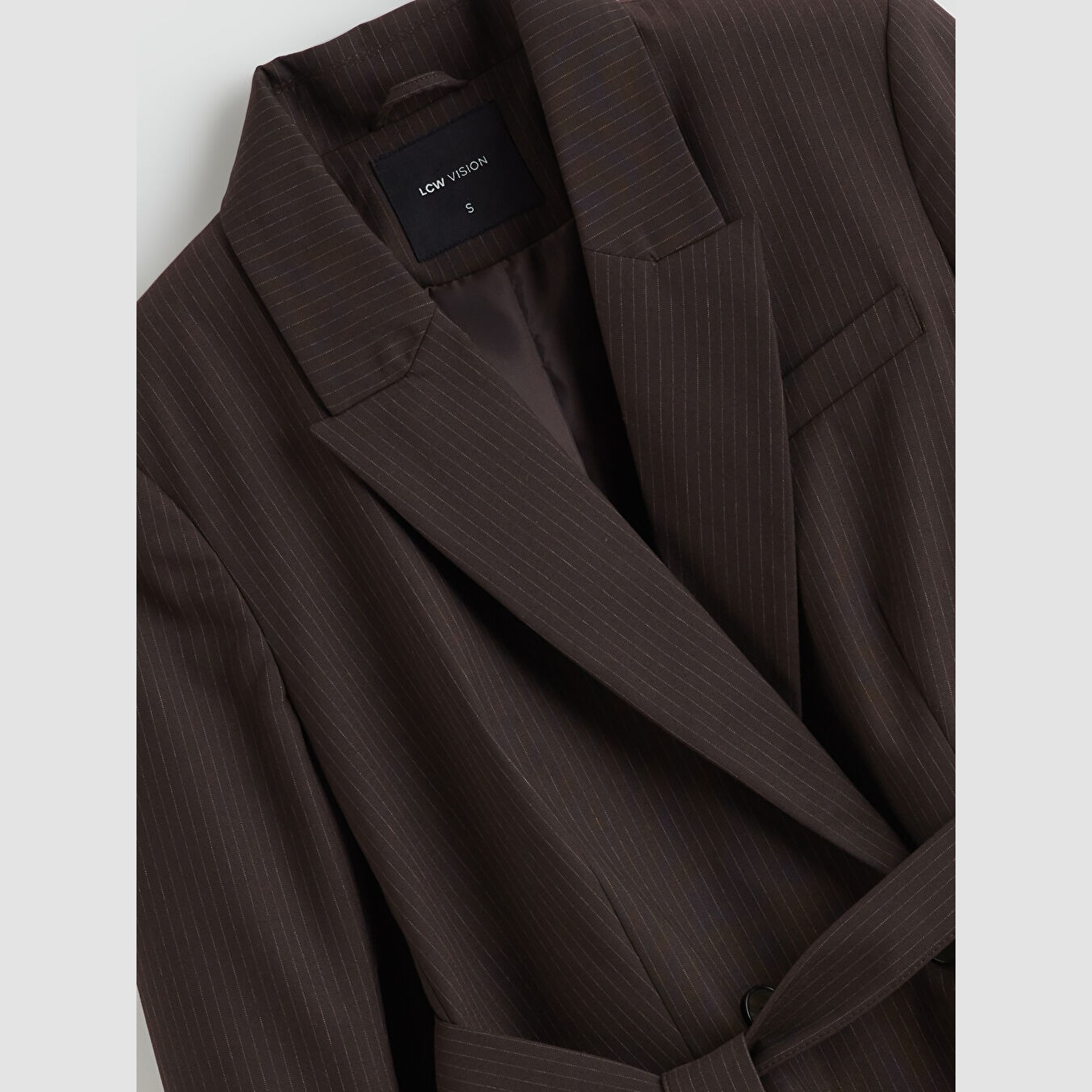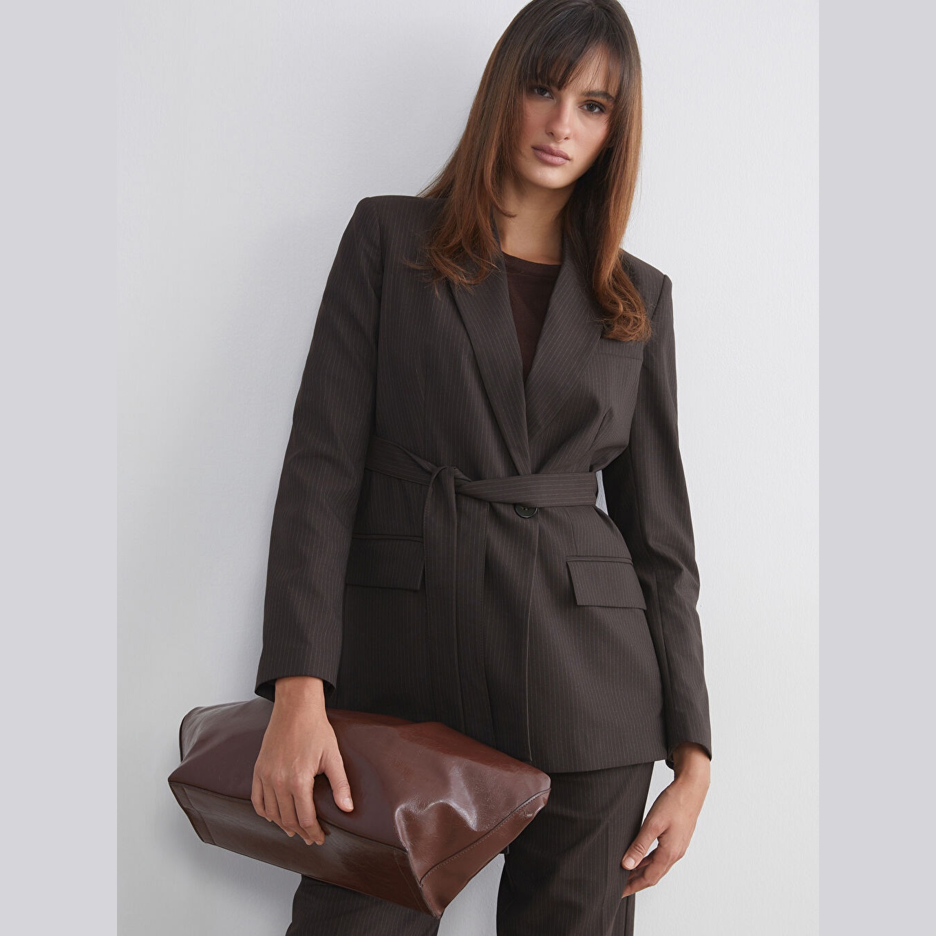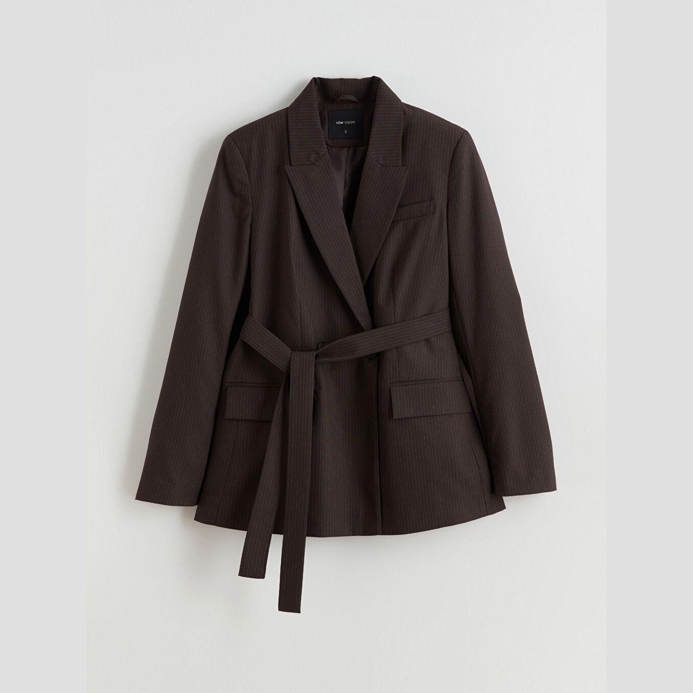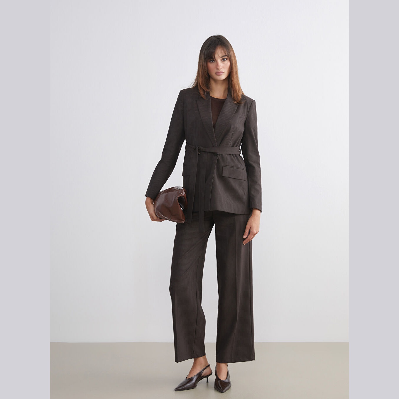 بليزر نسائي مخطط برباط خصر من LCW Vision – بني (قصة قياسية، تصميم رسمي بخطوط طولية، خامة مرنة ومبطّنة بالكامل، مثالي للعمل والمناسبات)