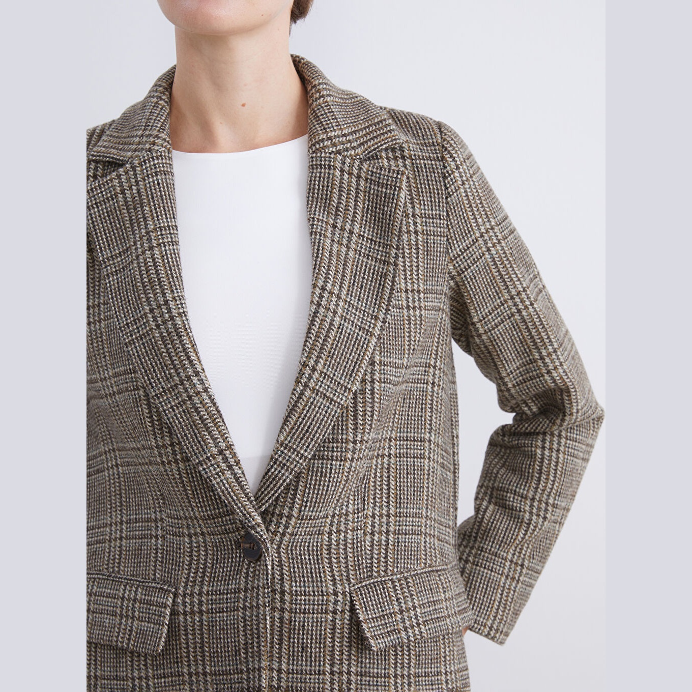 جاكيت بليزر بلون بني (Kahverengi) من مجموعة LCW Vision، مصمم بياقة V أنيقة (V Yaka) تضيف لمسة أنثوية راقية، قصة واسعة (Loose Fit) تمنحك مظهرًا مريحًا وانسيابيًا، تصميم بنقشة مربعات (Ekose) يضفي طابعًا شتويًا كلاسيكيًا، خامة كاشيه سميكة مكونة من مزيج غني: %75 بوليستر، %12 صوف، %9 أكريليك، %4 ألياف أخرى، مبطّن بالكامل بـ%100 بوليستر، بطول ميدي يُقاس من الكتف، مثالي للإطلالات الرسمية أو العملية في الأجواء الباردة.